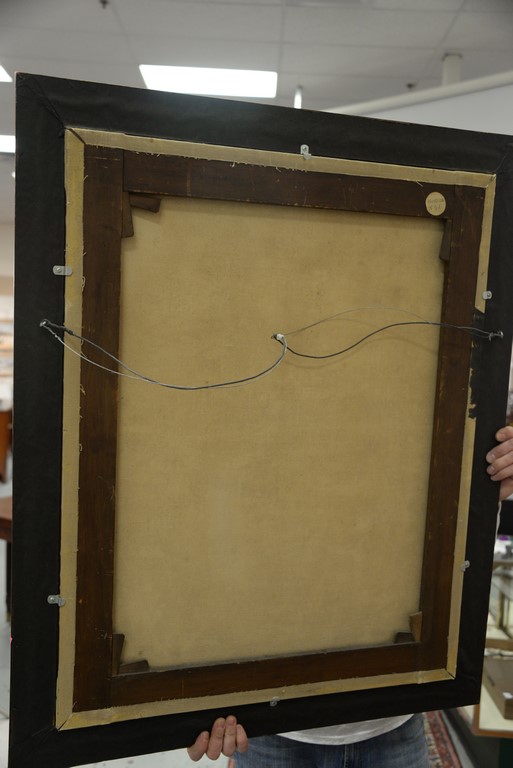 Lot 385: Primitive portrait of a young girl with rabbits, oil on canvas unsigned, 19th century. 35 1/2 x 28