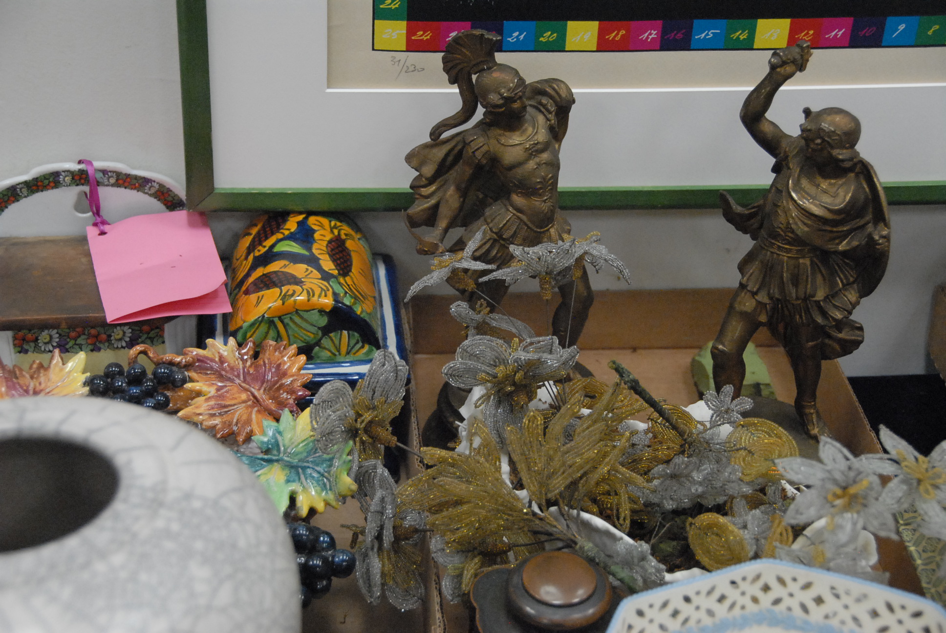 Lot 385: Six box lots to include Irish Belleek, Wedgwood, miscellaneous china, and two metal figures.