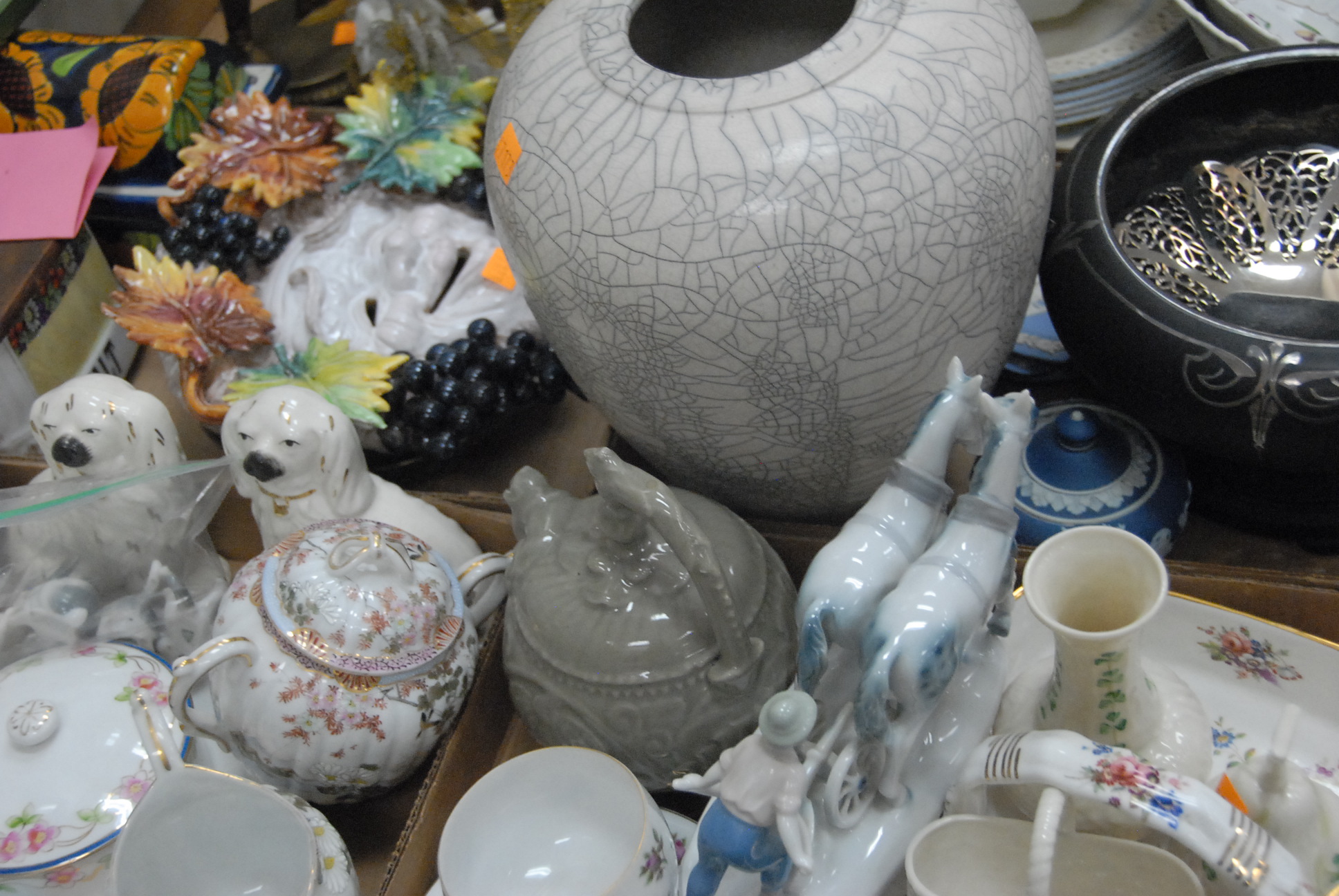 Six box lots to include Irish Belleek, Wedgwood, miscellaneous china, and two metal figures.