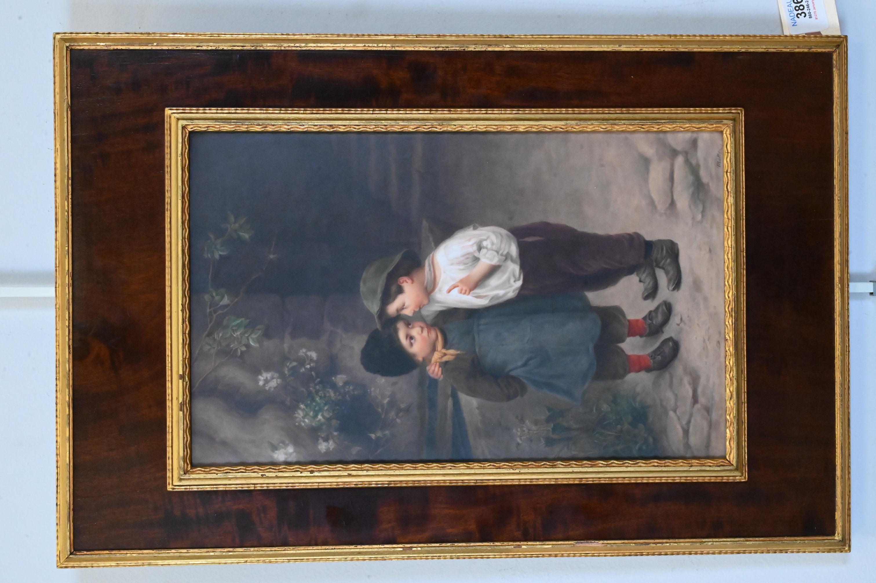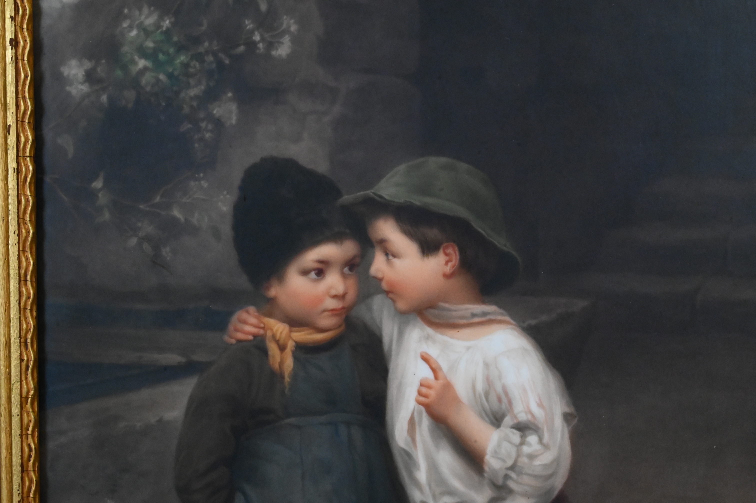 Hand-painted porcelain plaque depicting two young children standing in a rustic outdoor setting, one whispering into the ear of the other. Finely rendered facial expressions, clothing, and background foliage, executed in soft blended tones typical of Continental porcelain painting of the period. Signed “Marty” at lower right. Mounted in a giltwood frame.