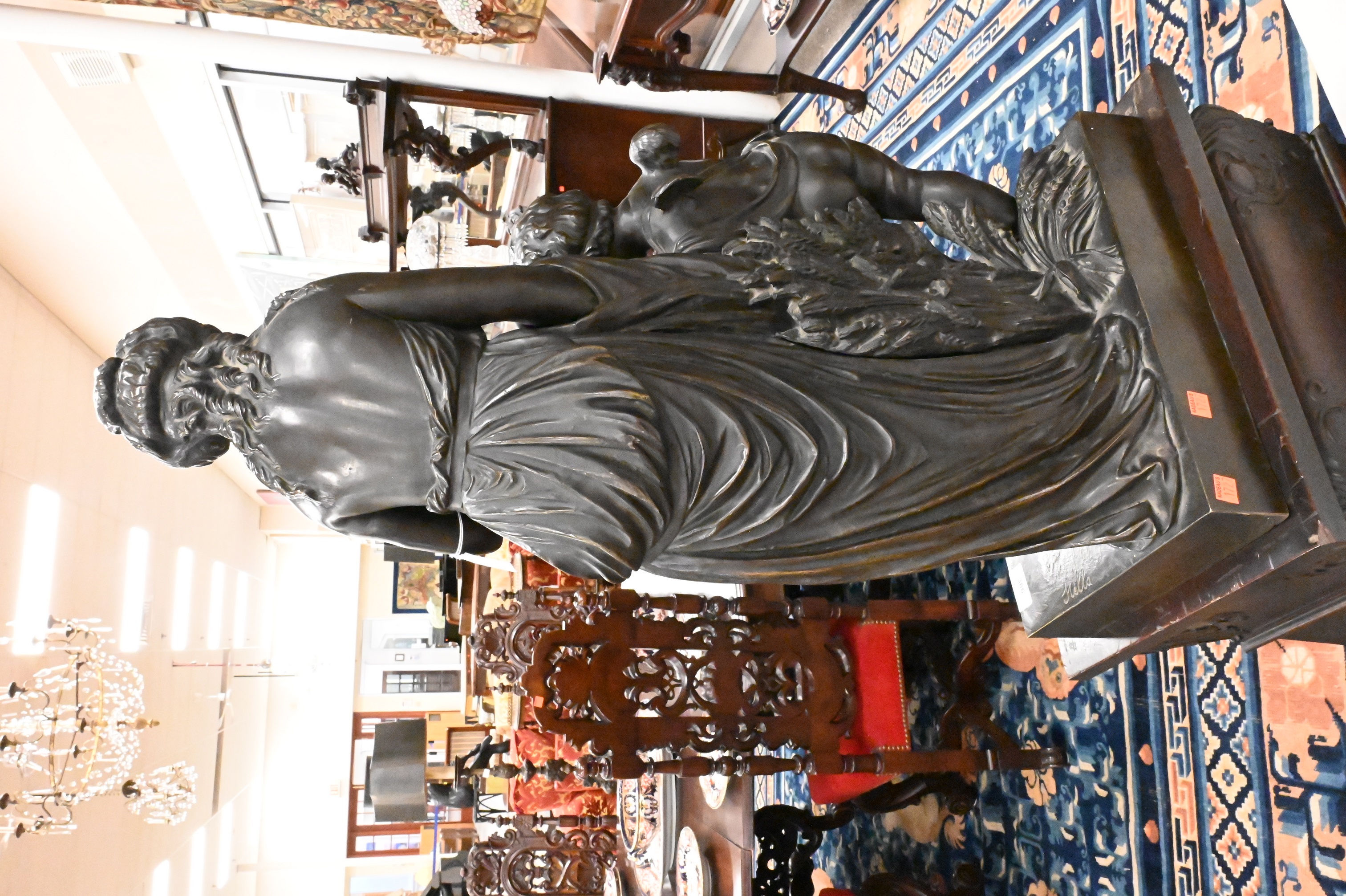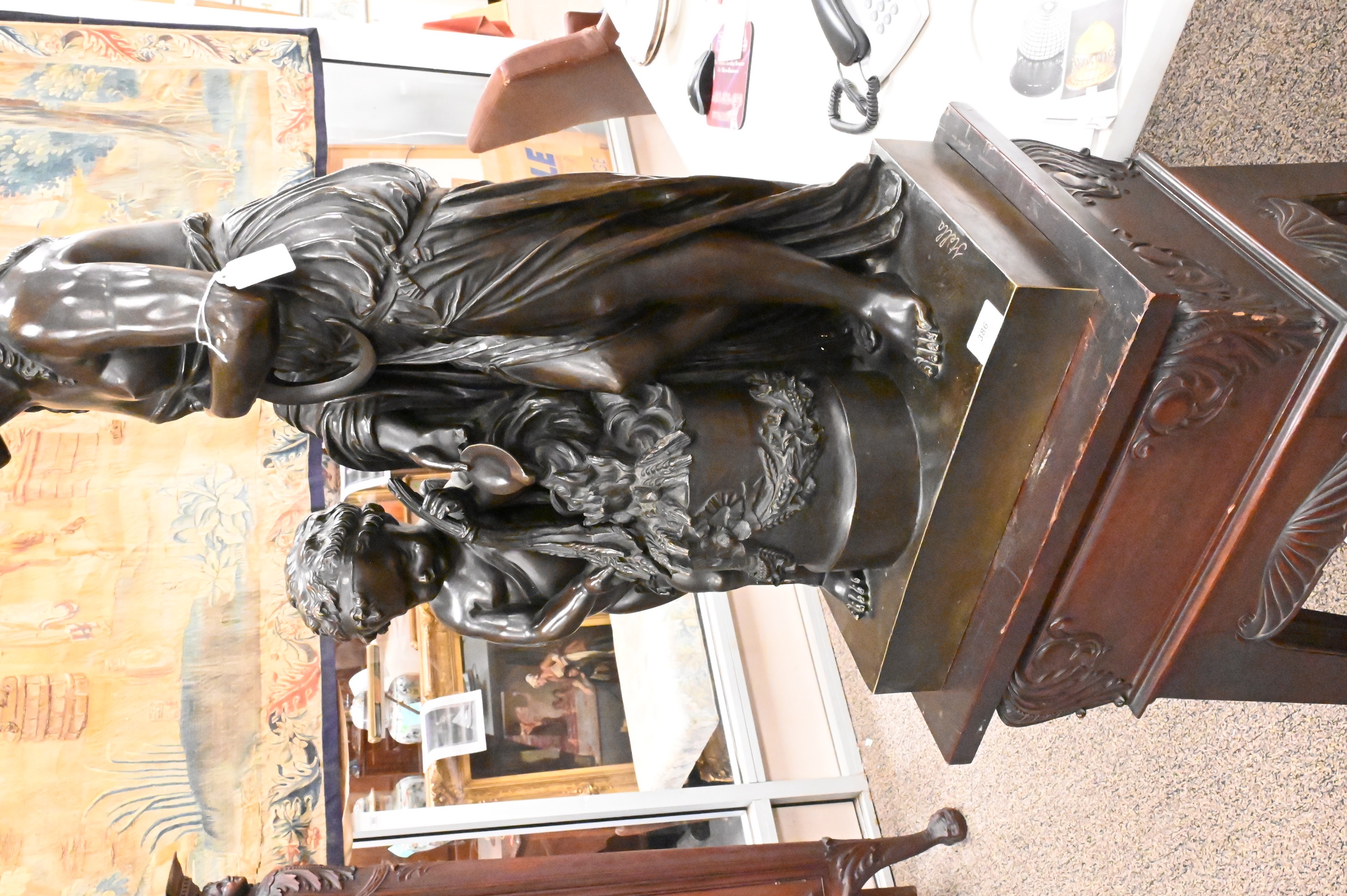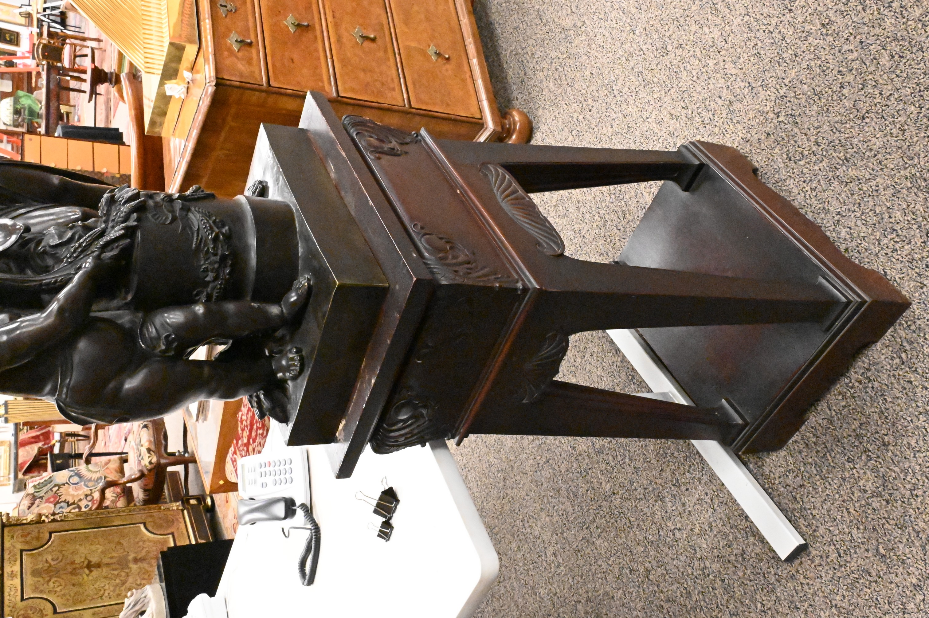 Having female figure standing next to a cherub resting on an Art Nouveau carved wood pedestal