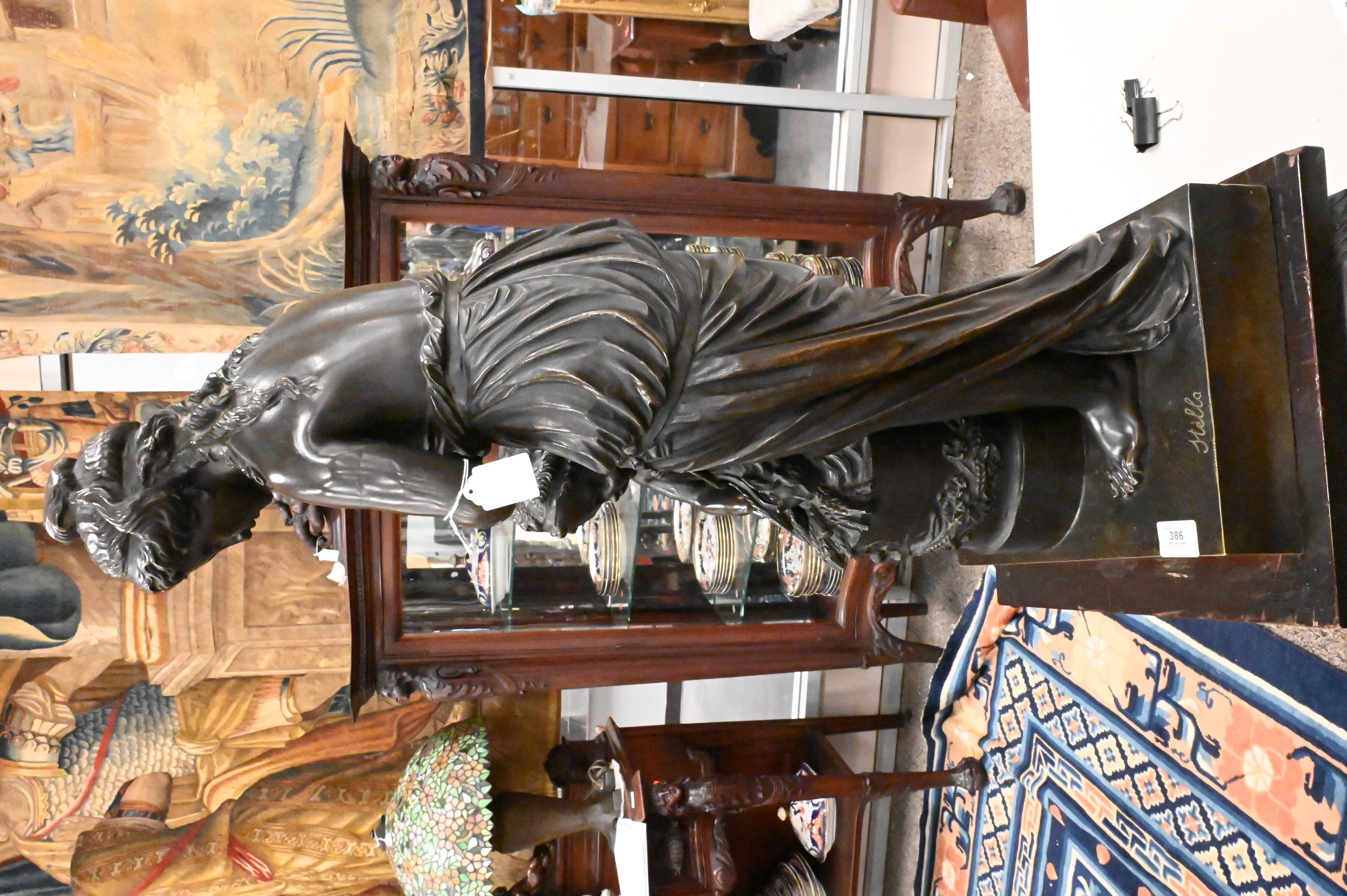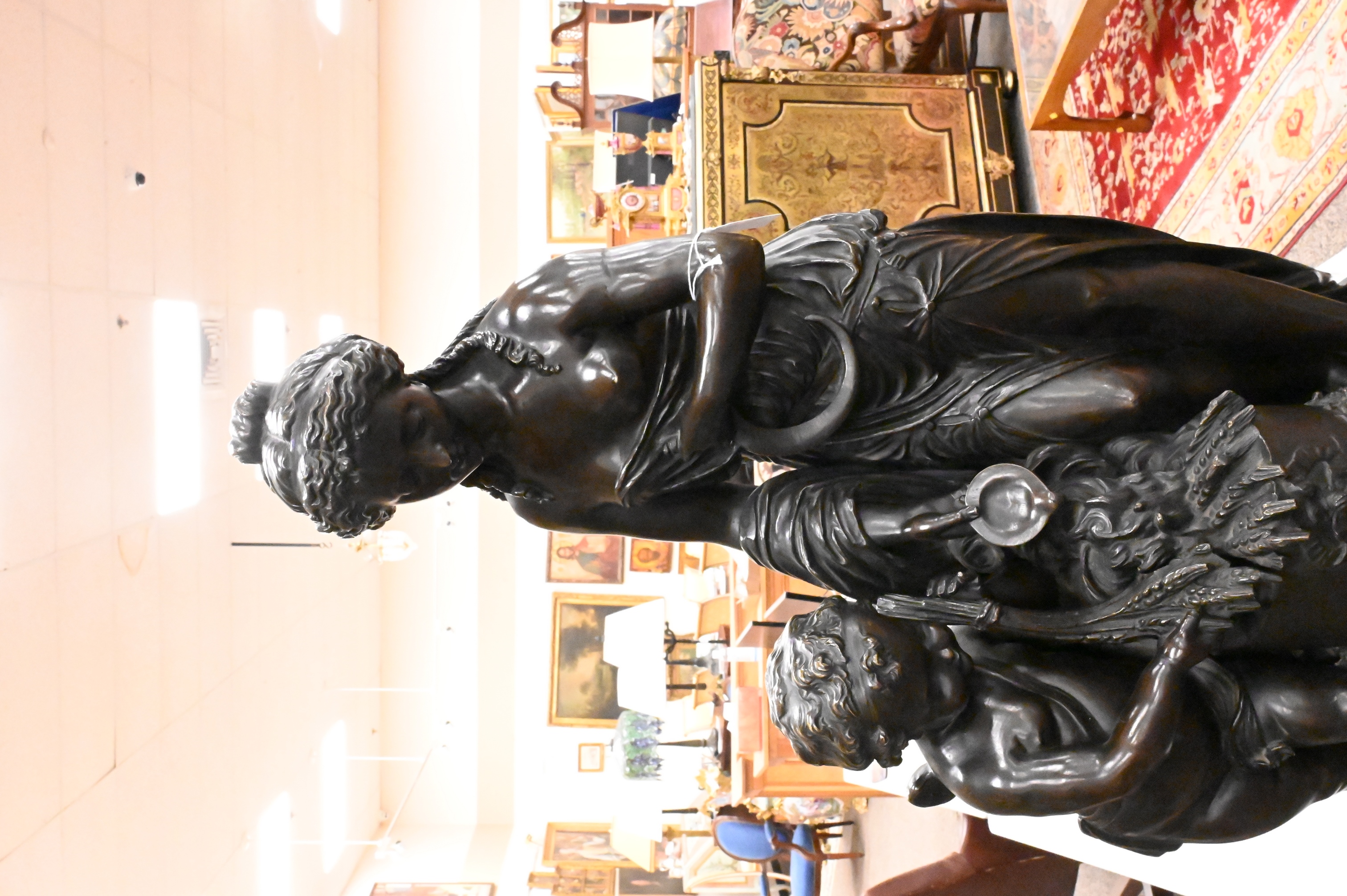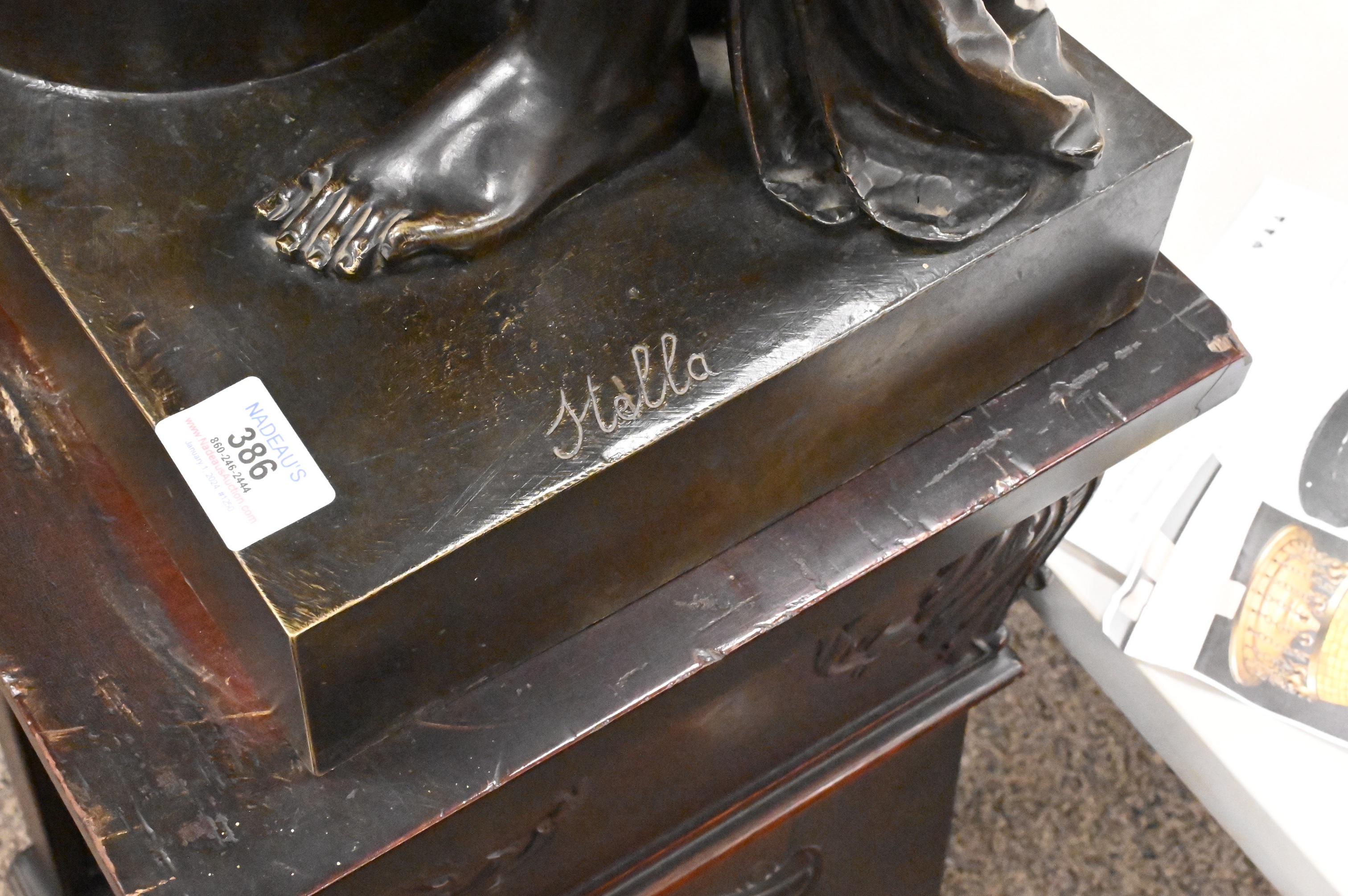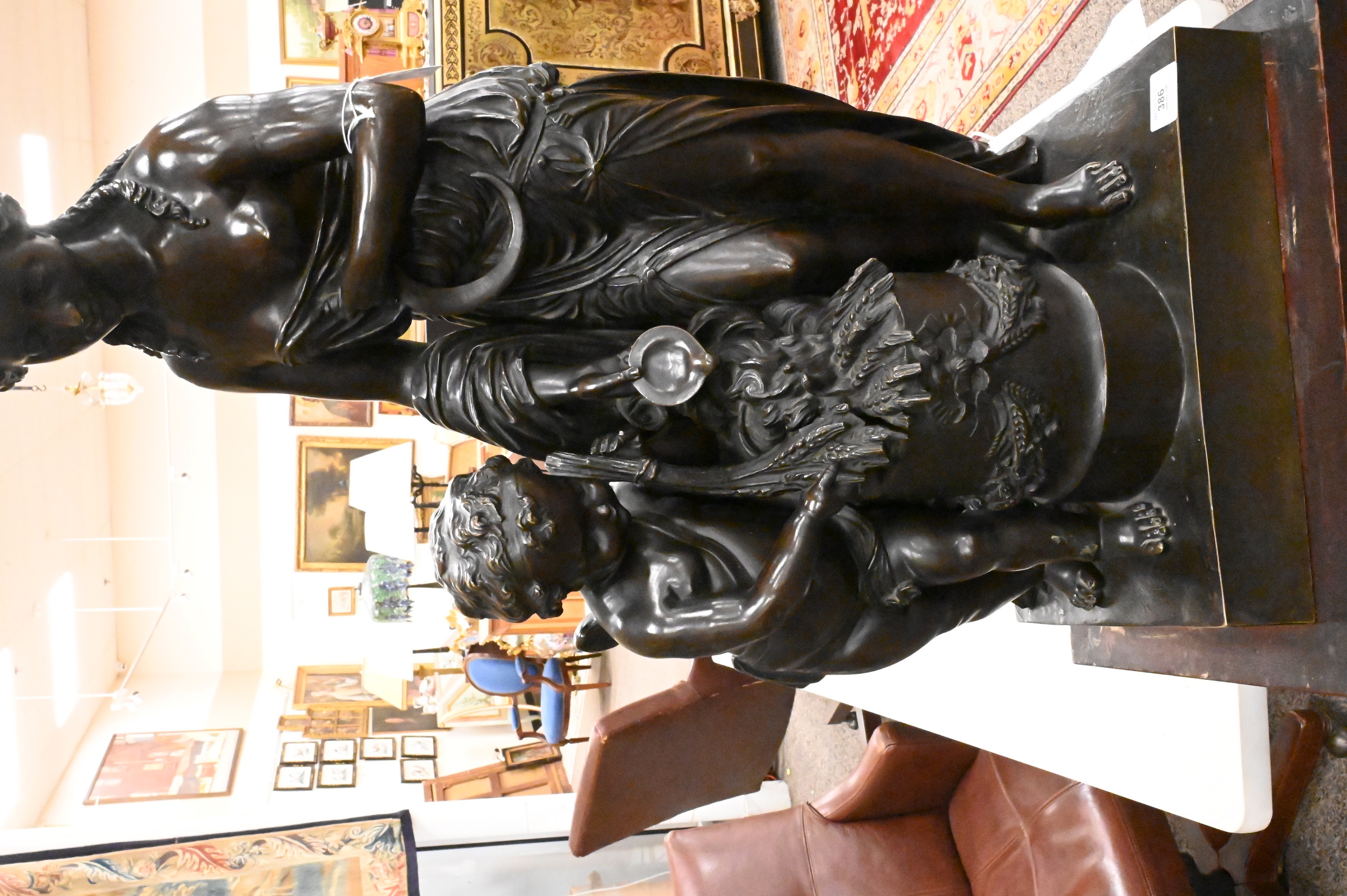 Having female figure standing next to a cherub resting on an Art Nouveau carved wood pedestal