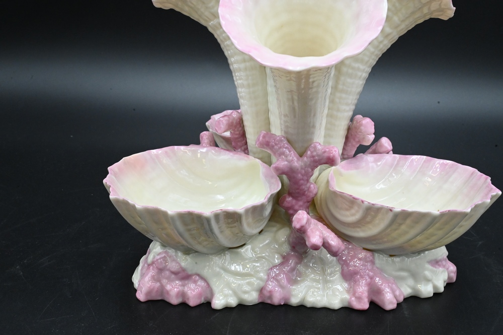 Belleek Marine Vase, having cornucopia vase top and shell dishes on pink coral form base, with black mark, height 10 1/2 inches. Provenance: Collections of Norma Reilly, New Jersey.