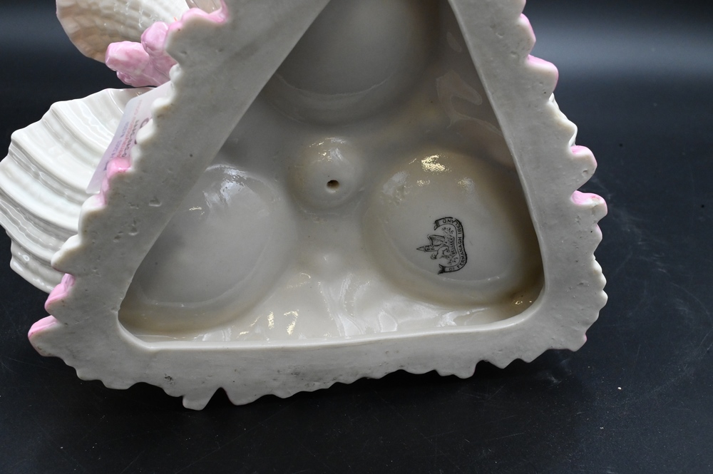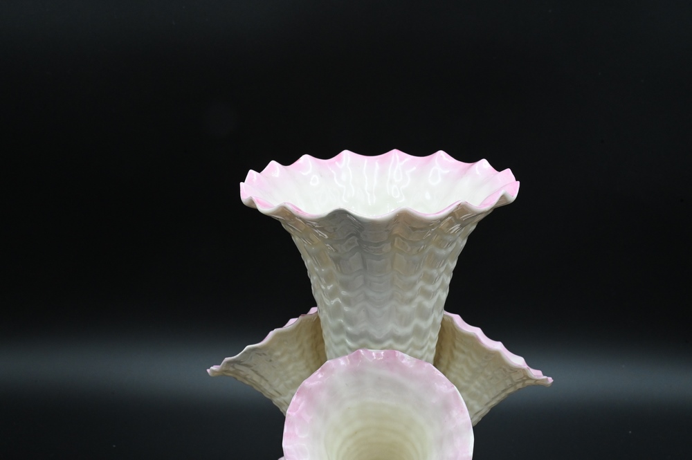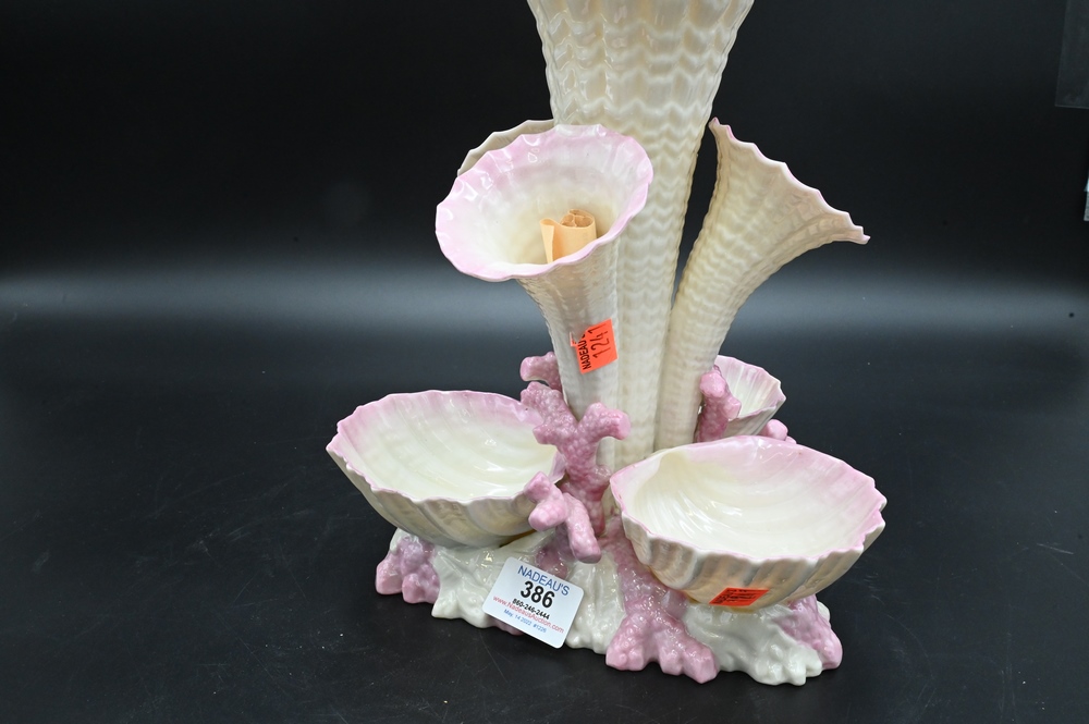 Lot 386: Belleek Marine Vase, having cornucopia vase top and shell dishes on pink coral form base, with black mark, height 10 1/2 inches. Provenance: Collections of Norma Reilly, New Jersey.