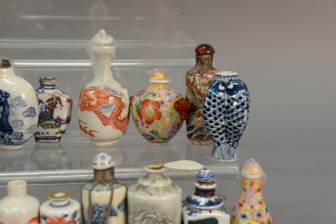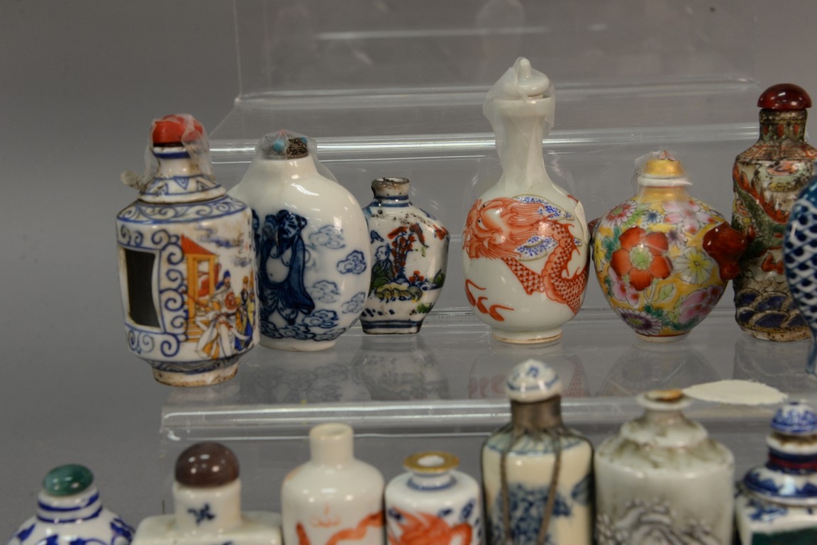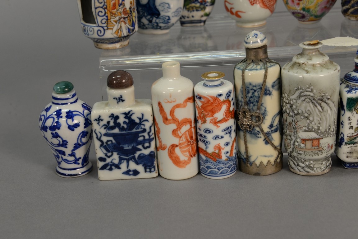 Lot 386: Collection of fifteen porcelain snuff bottles to include five blue and white, famille rose, enameled Japanese, one molded with drago…