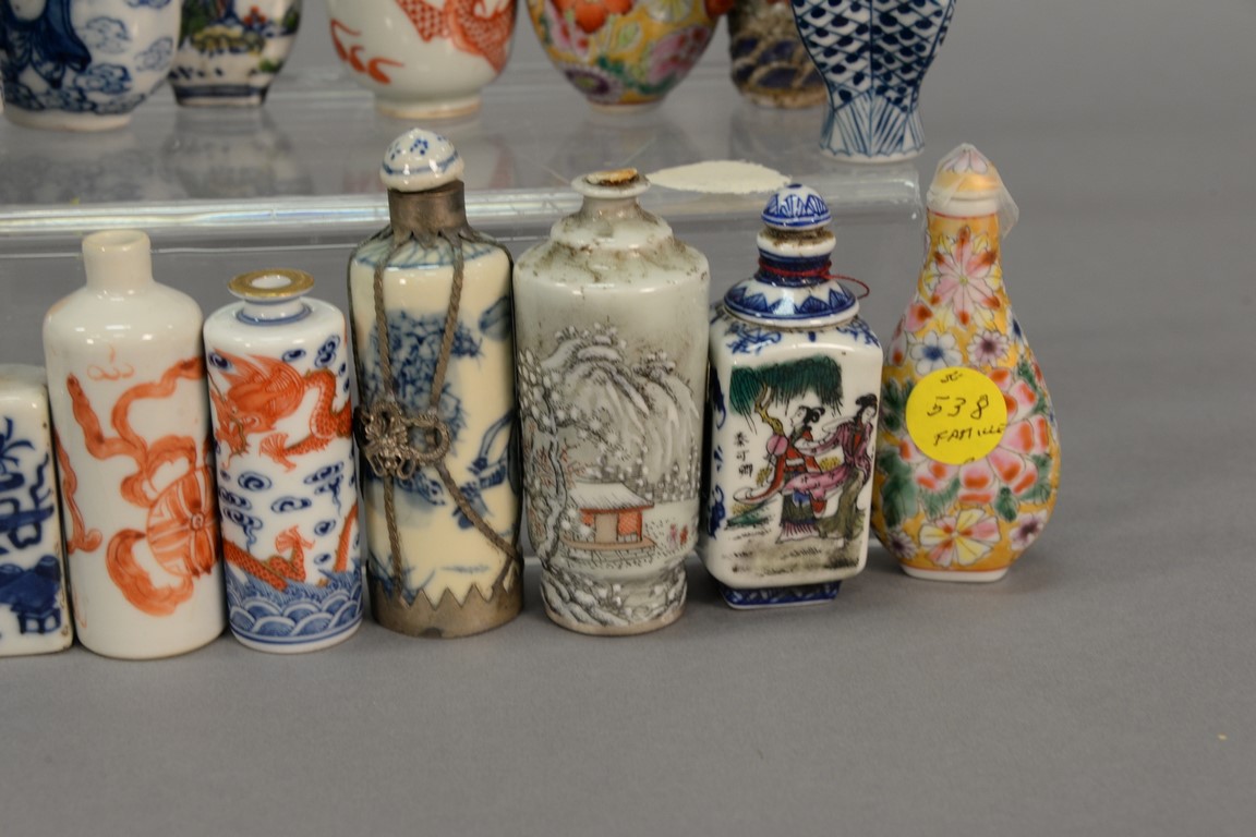 Collection of fifteen porcelain snuff bottles to include five blue and white, famille rose, enameled Japanese, one molded with dragon, etc.