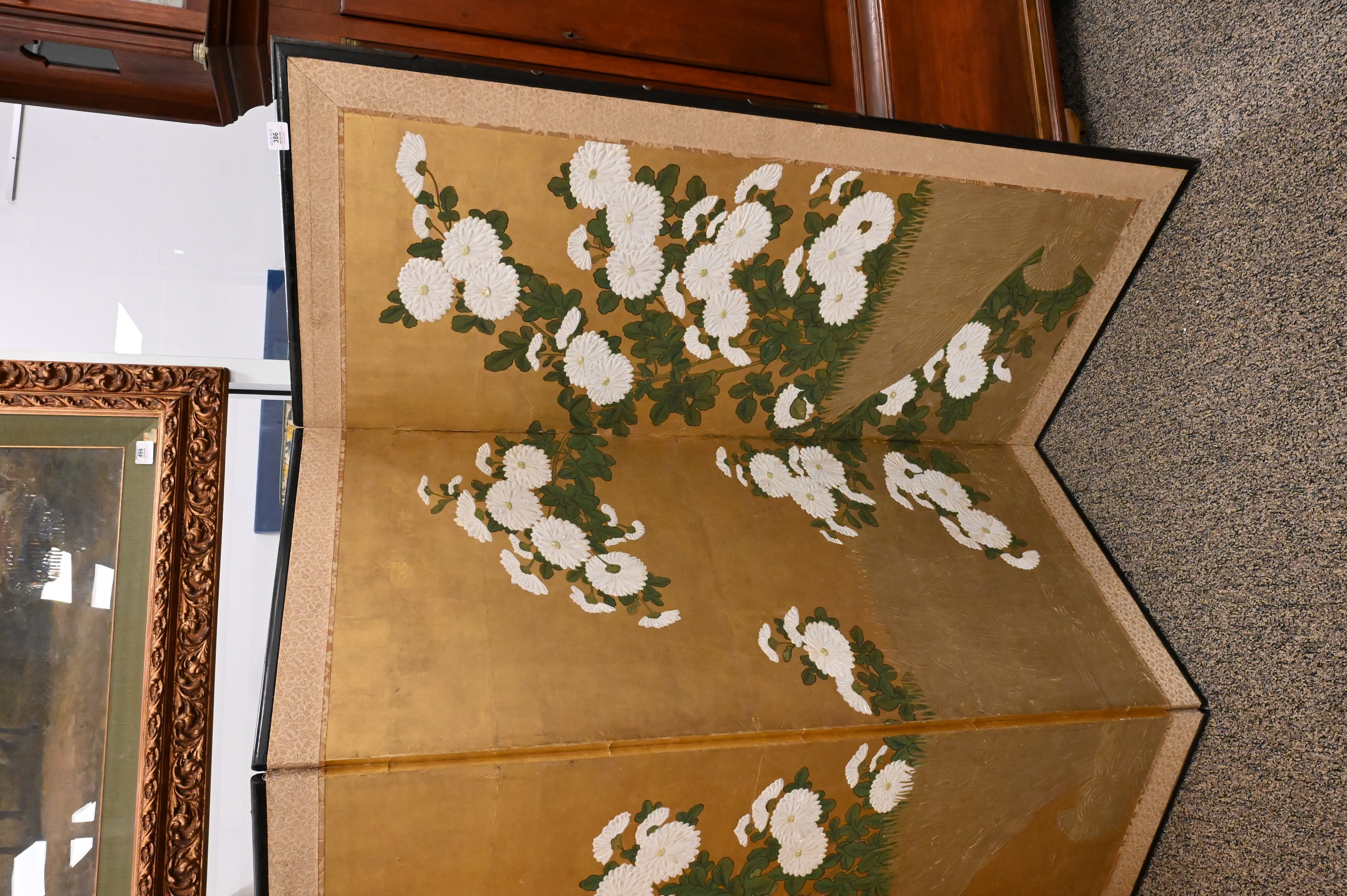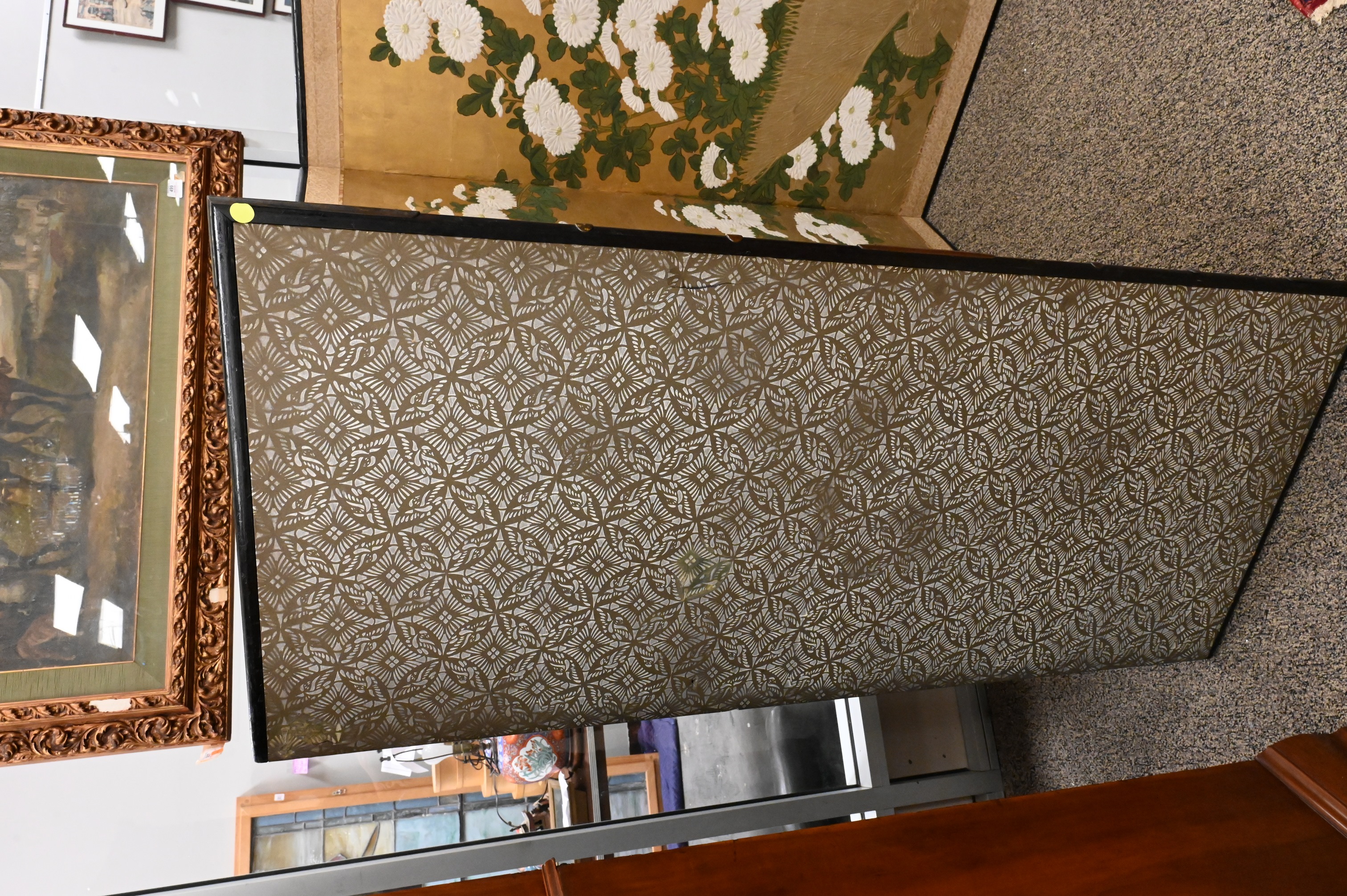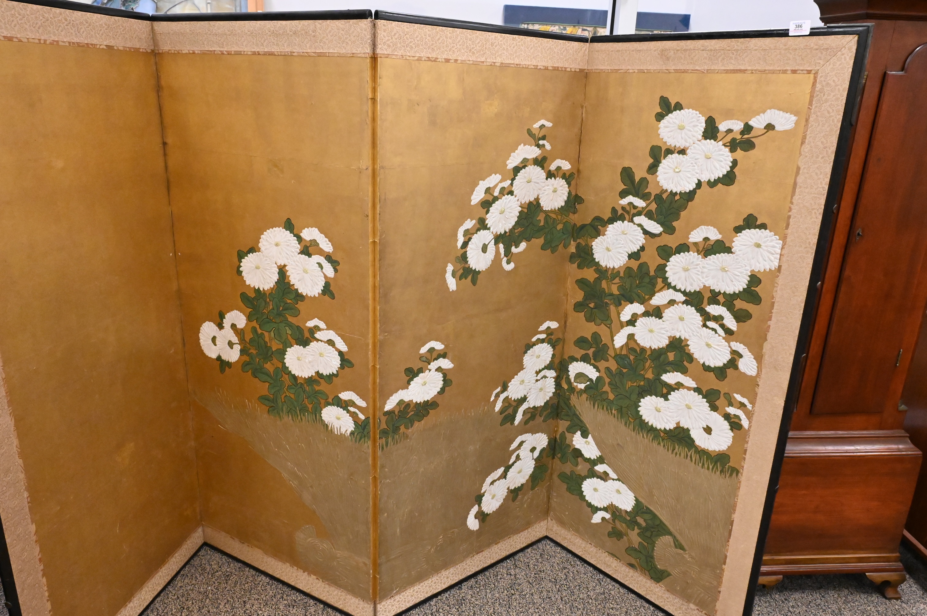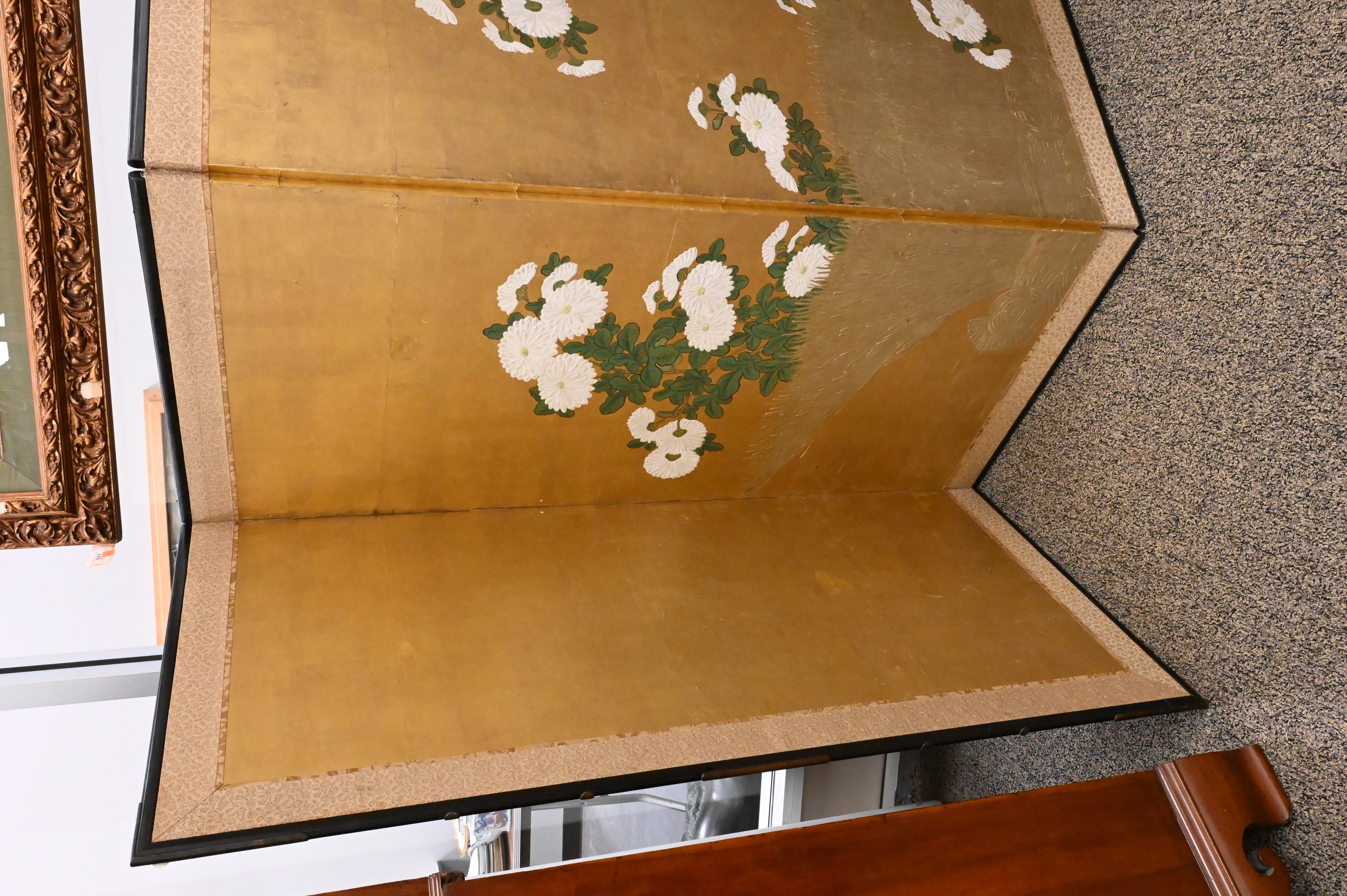 mariage style paper screen having raised royal chrysanthemums on gold leaf with silk brocade edging, lacquered frame, Condition: excellent condition, minor restorations to gold leaf and backing