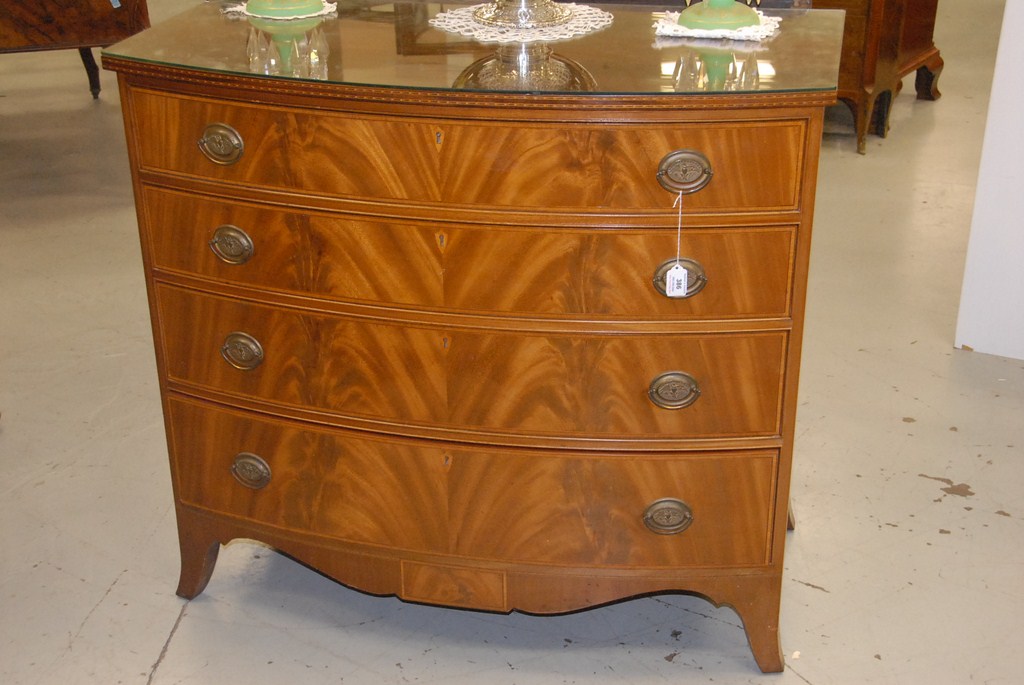 Margolis mahogany bowed front chest of four graduated drawers, each drawer band inlaid with crotch mahogany all set on flared French feet with drop center panel and fitted glass top, stamped on reverse Handmade by The Nathan Margolis Shop. ht. 36in. wd. 40in. dp. 22in.