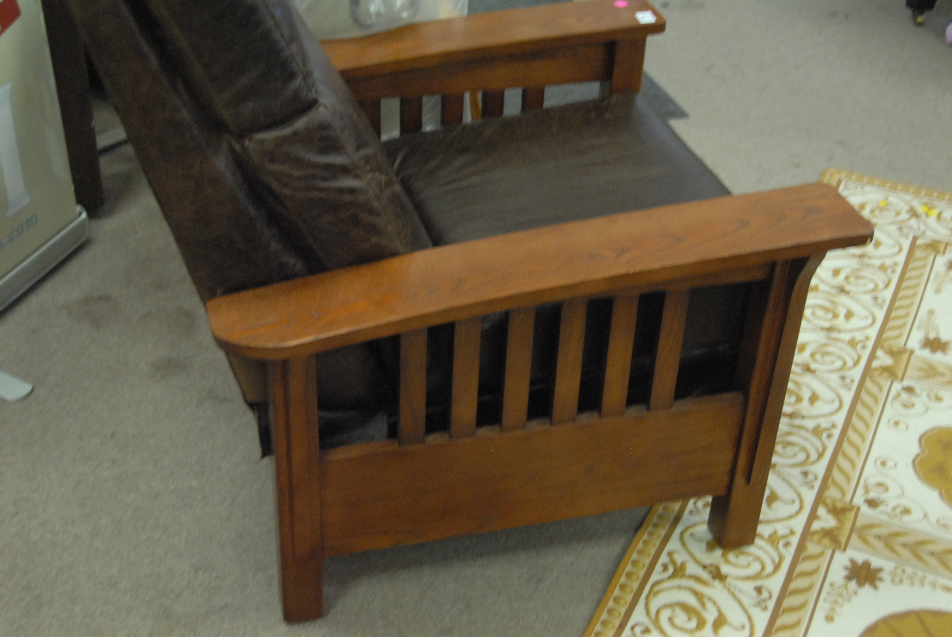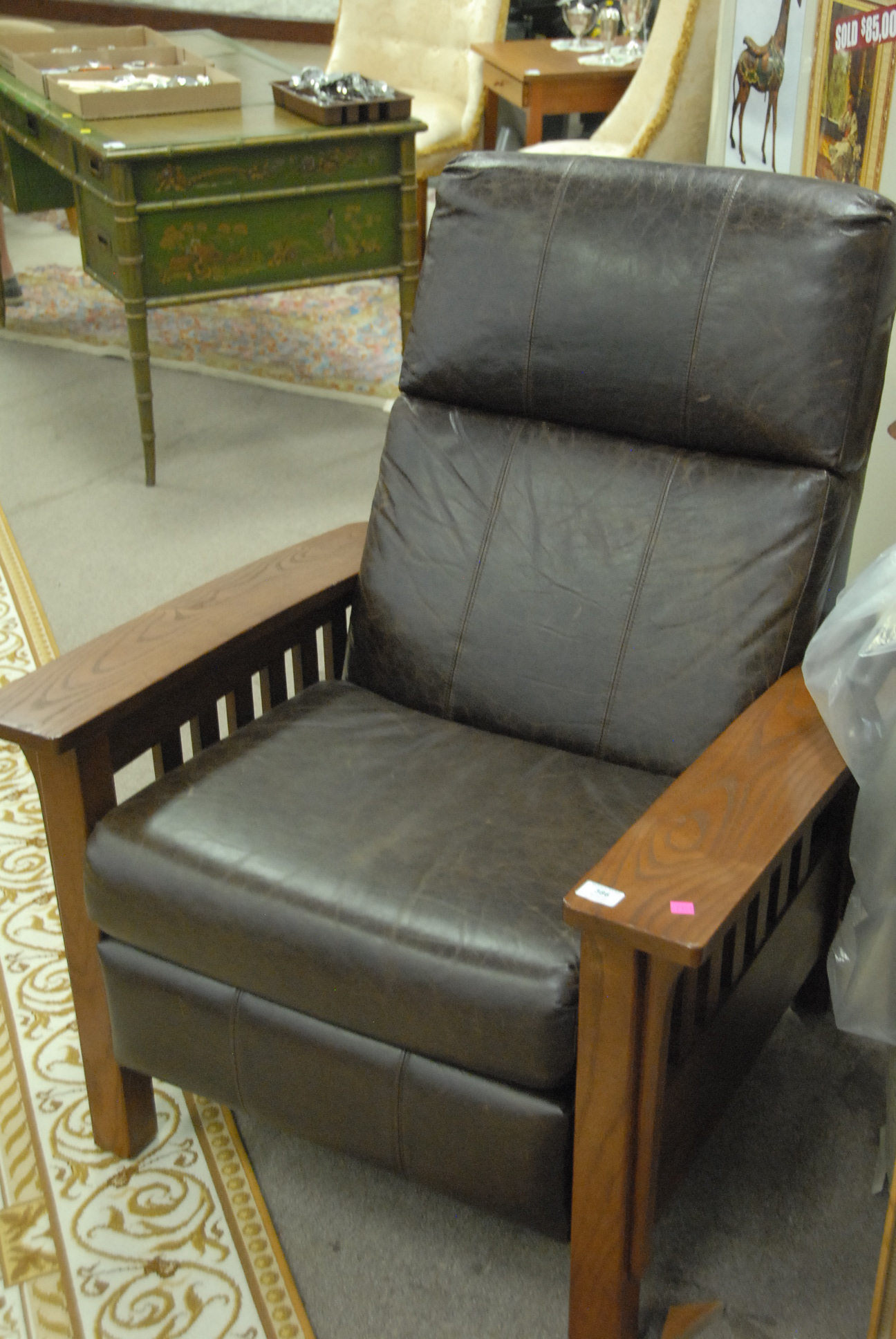 Mission style oak and leather reclining chair, wd. 33 1/2.