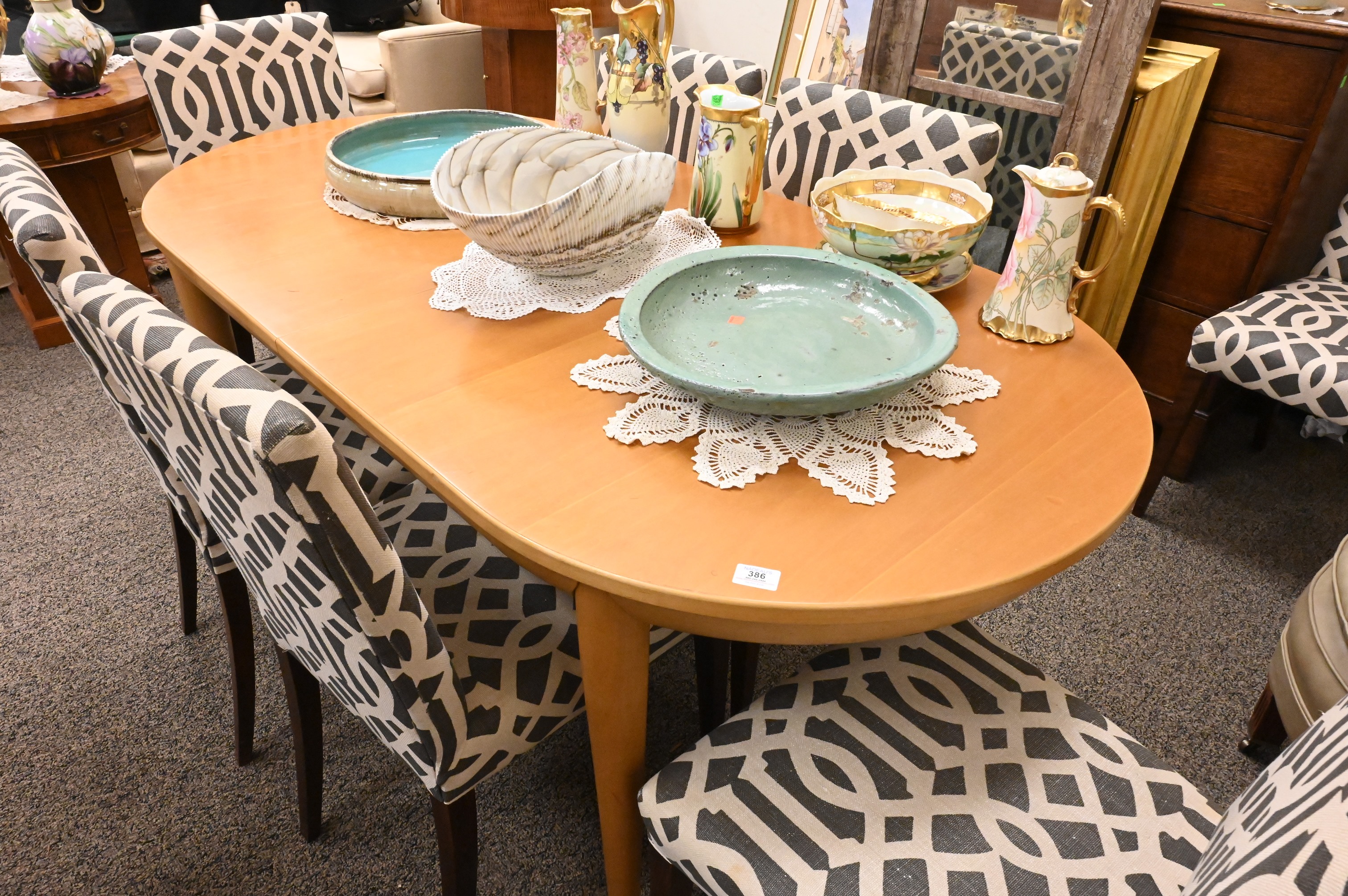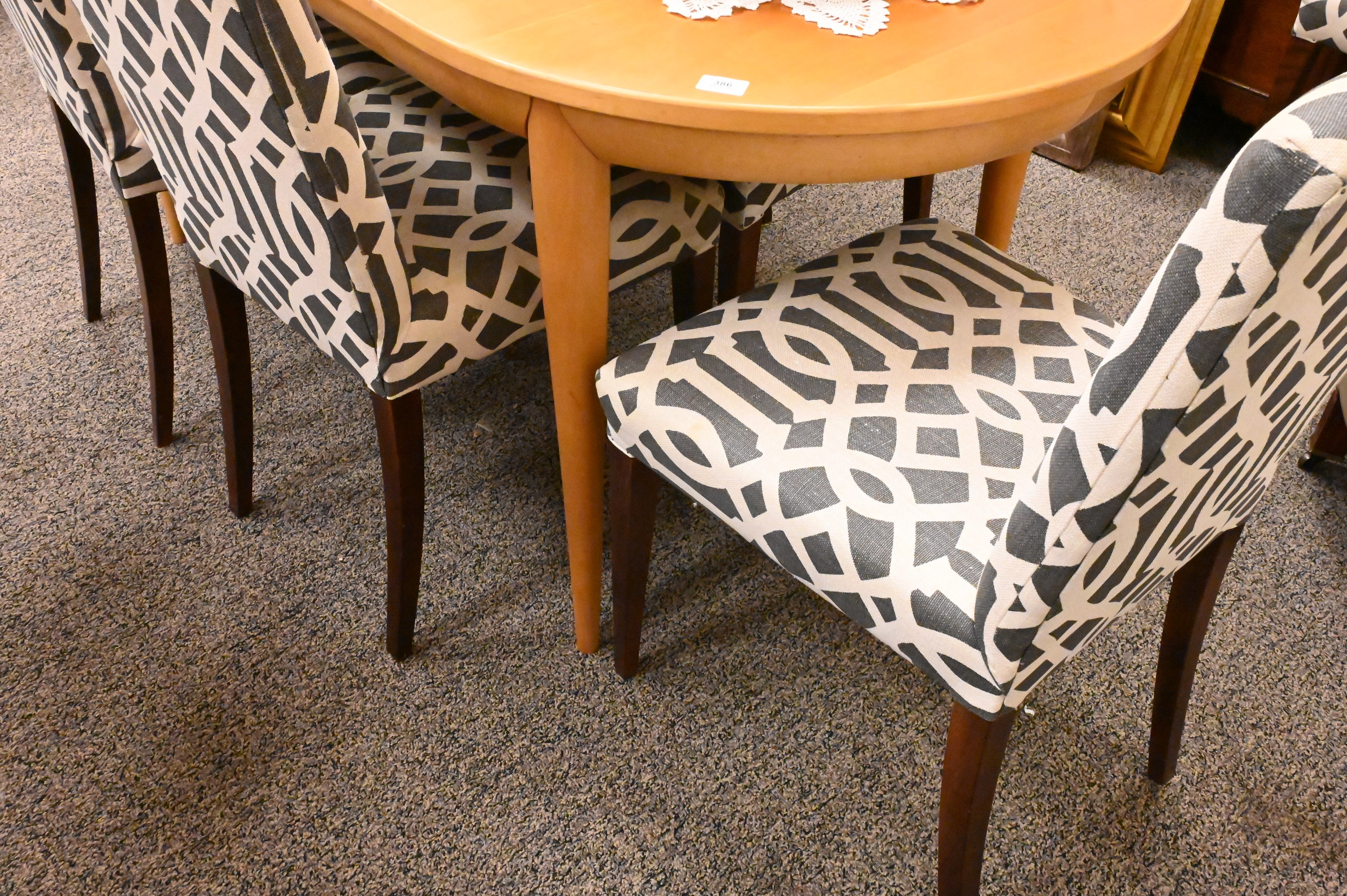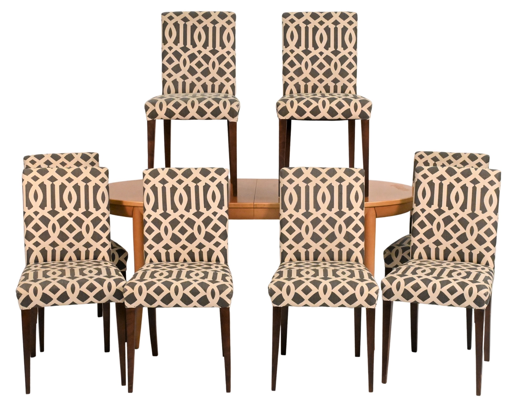 Nine Piece Contemporary Dining Set, to include blonde dining table, along with a set of eight upholstered side chairs, height 29 1/2 inches, top 33 1/2″ x 68″