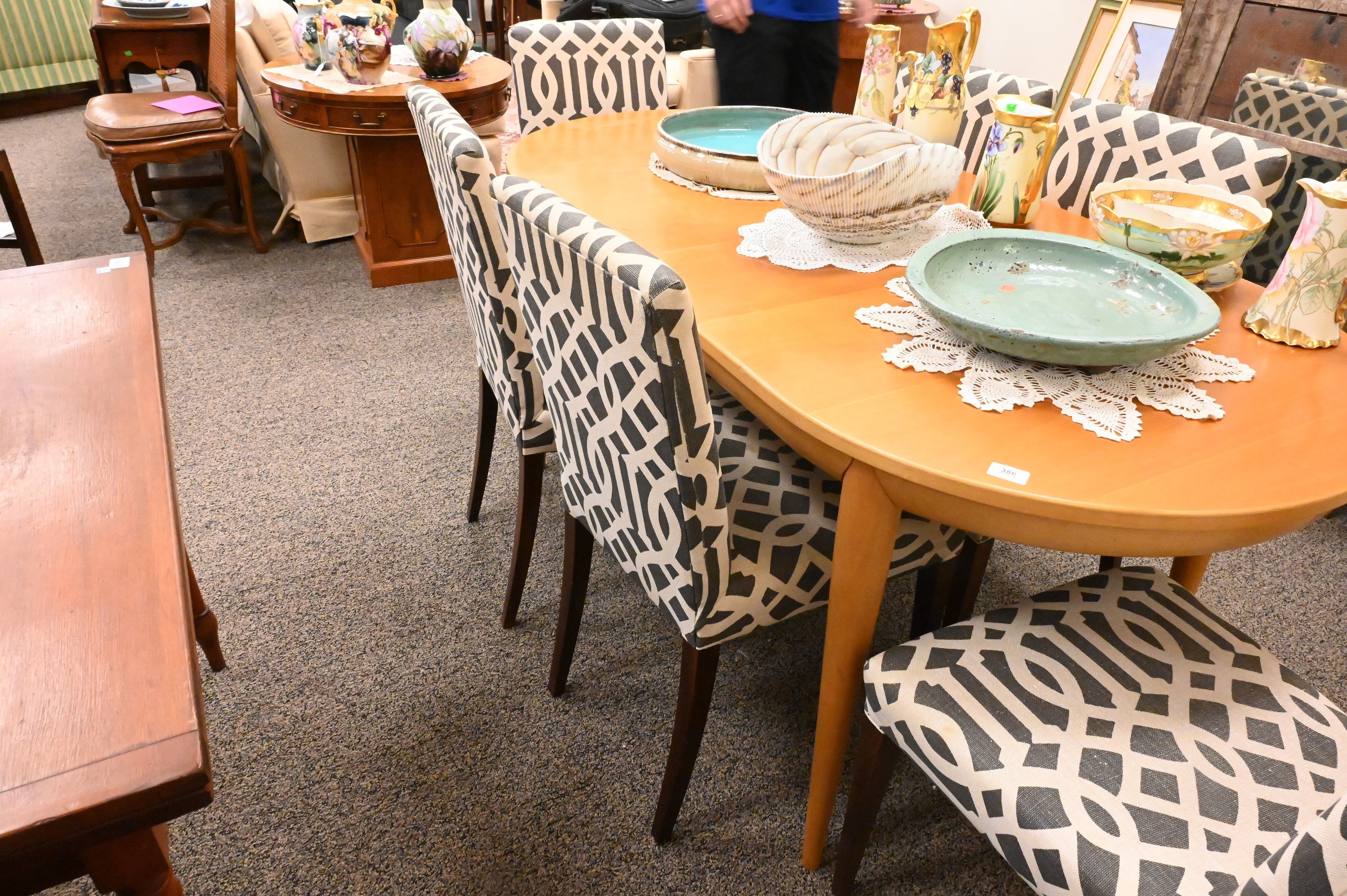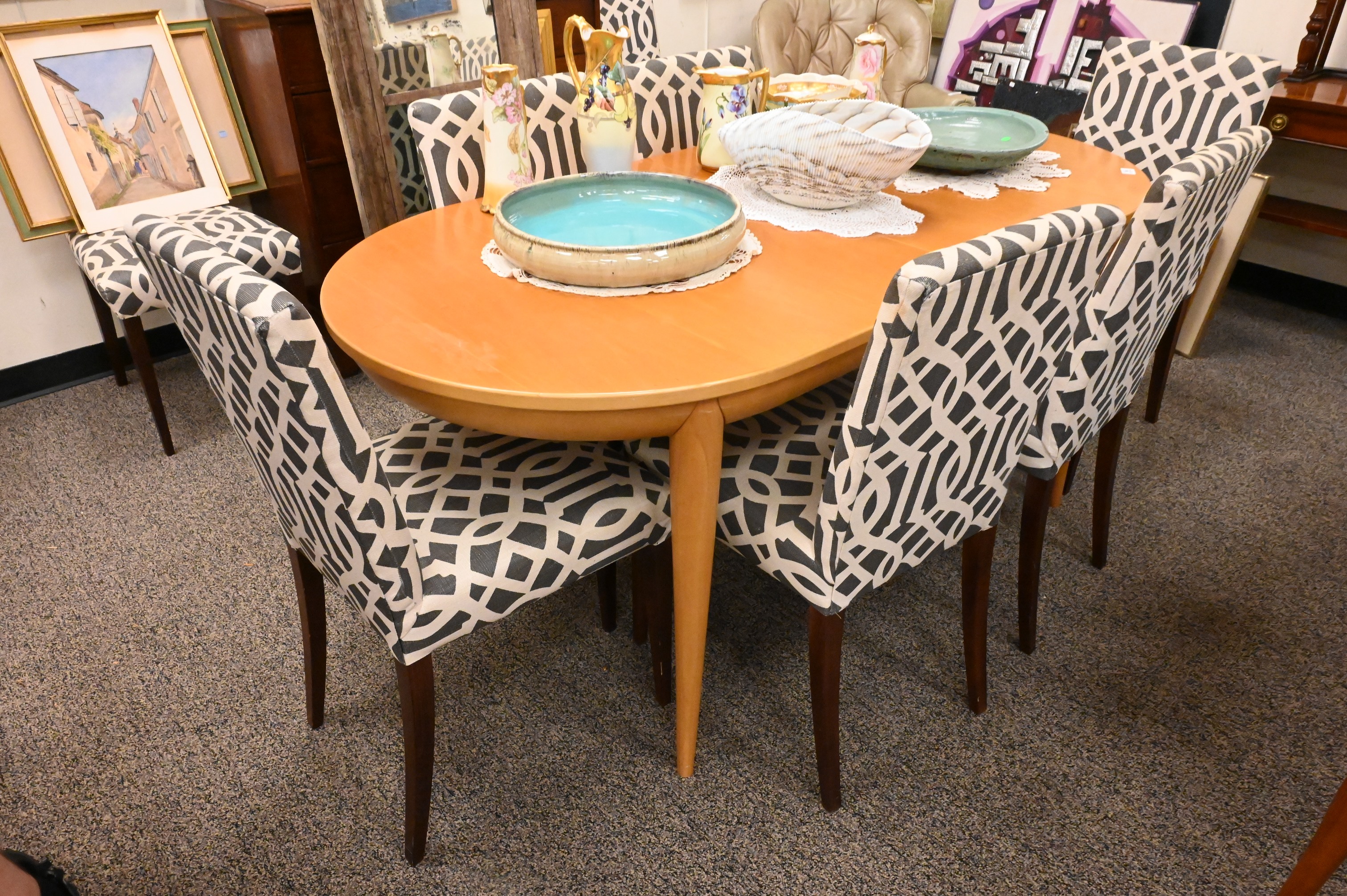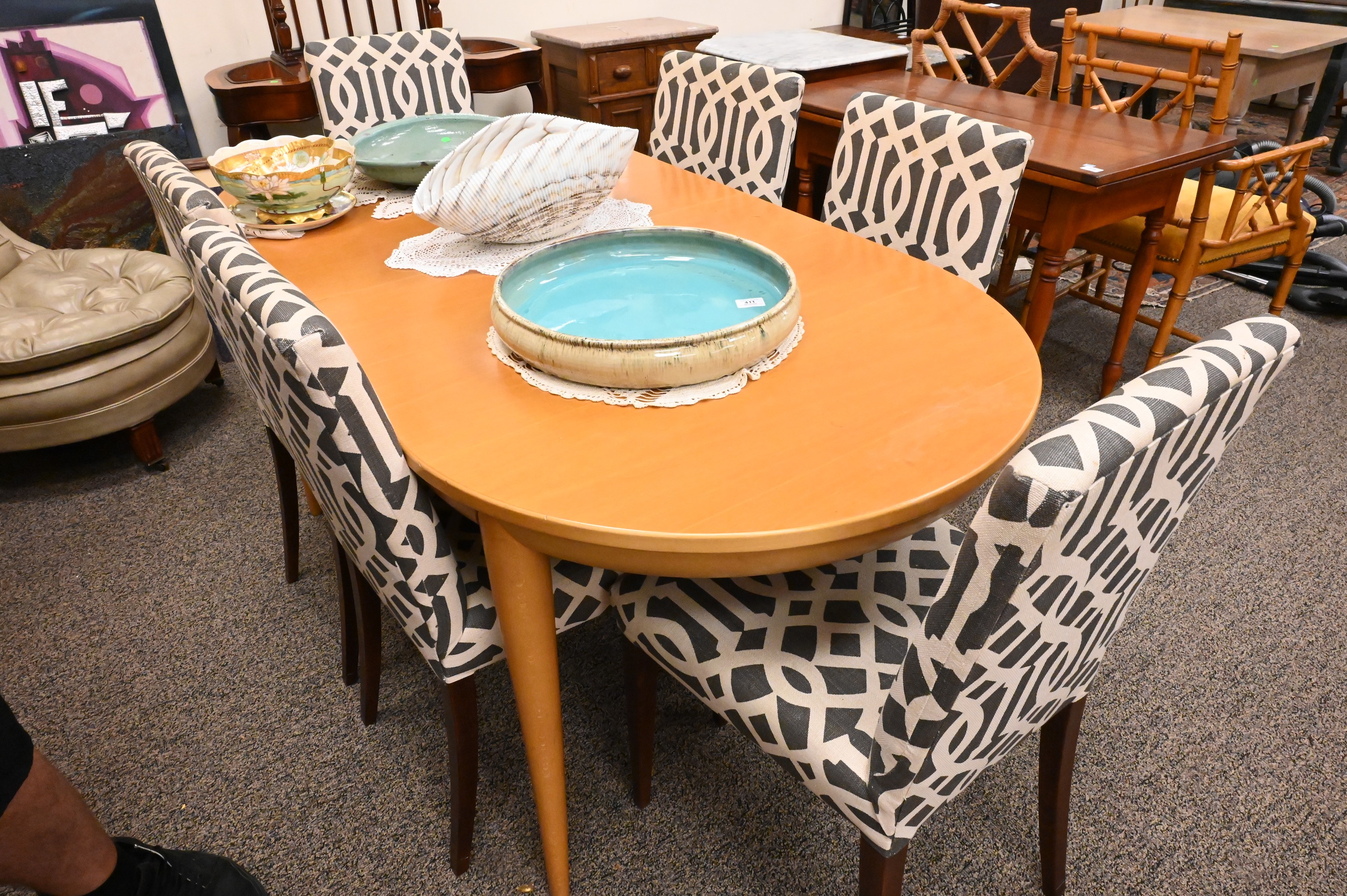 Nine Piece Contemporary Dining Set, to include blonde dining table, along with a set of eight upholstered side chairs, height 29 1/2 inches, top 33 1/2″ x 68″