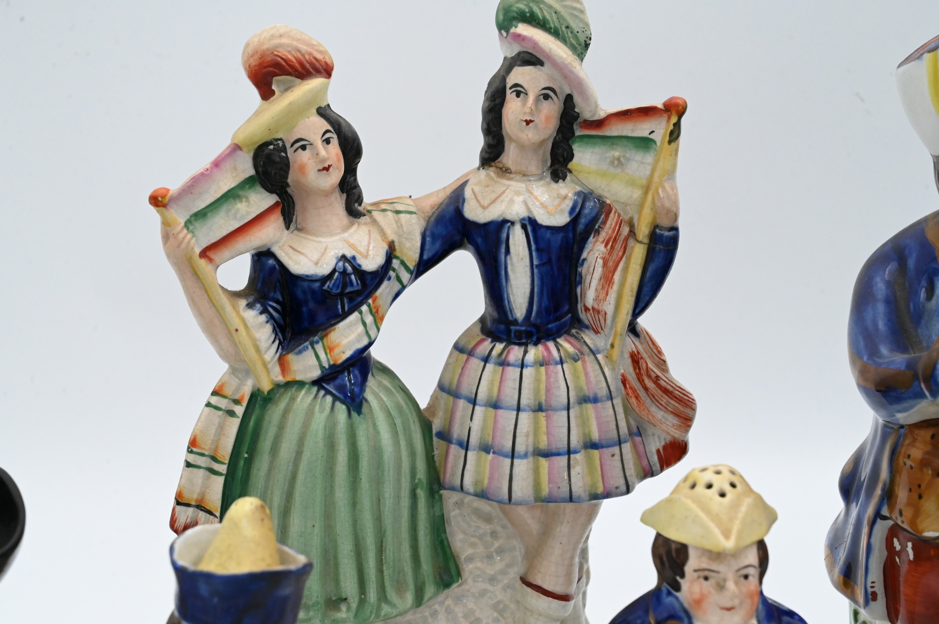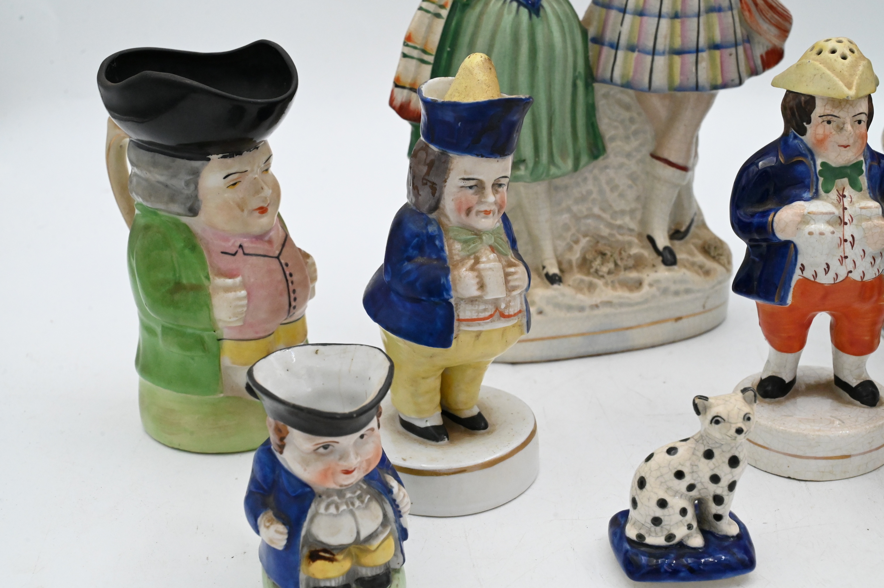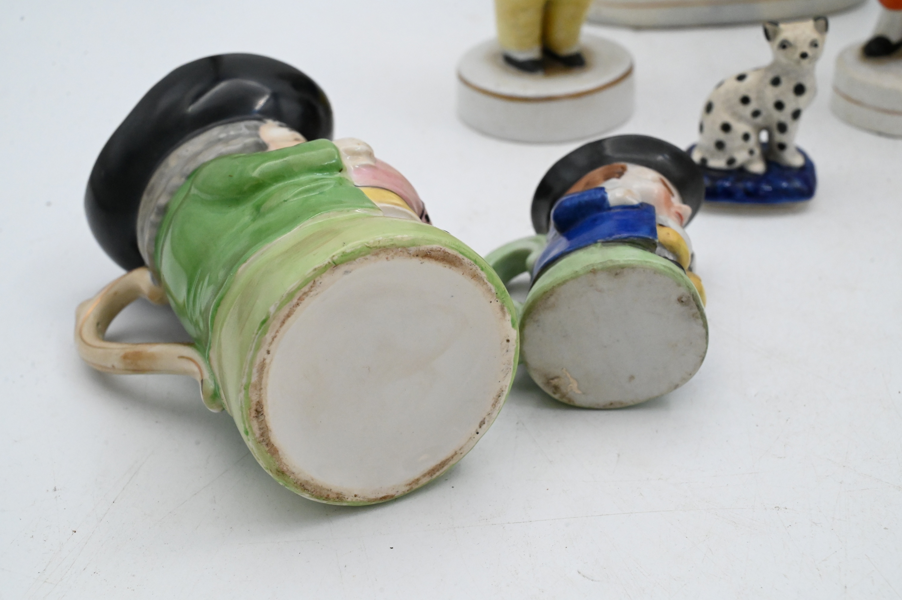 A collection of English and Continental figural toby jugs and character figurines, including seated and standing toby-type forms, miniature mugs, and related examples.