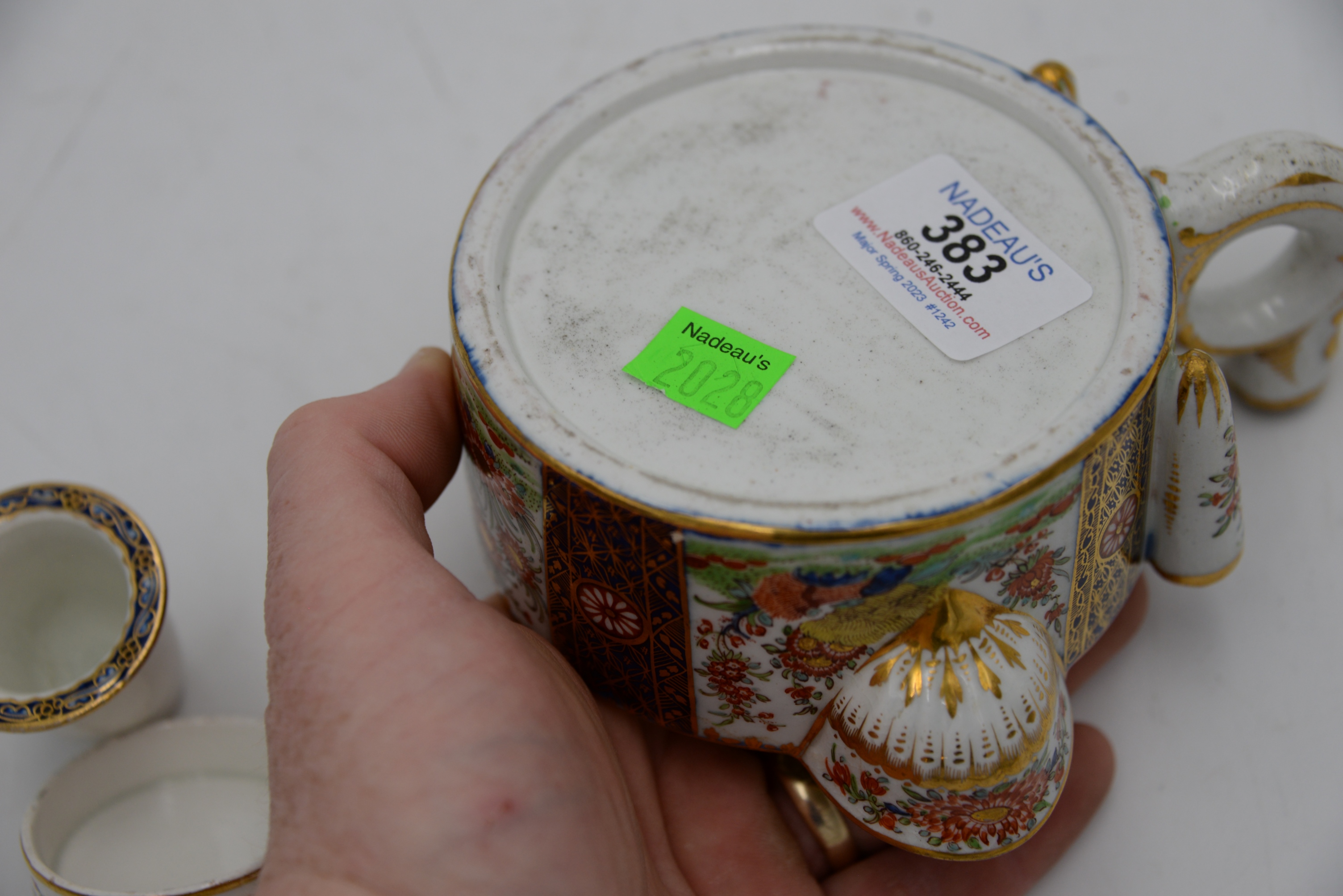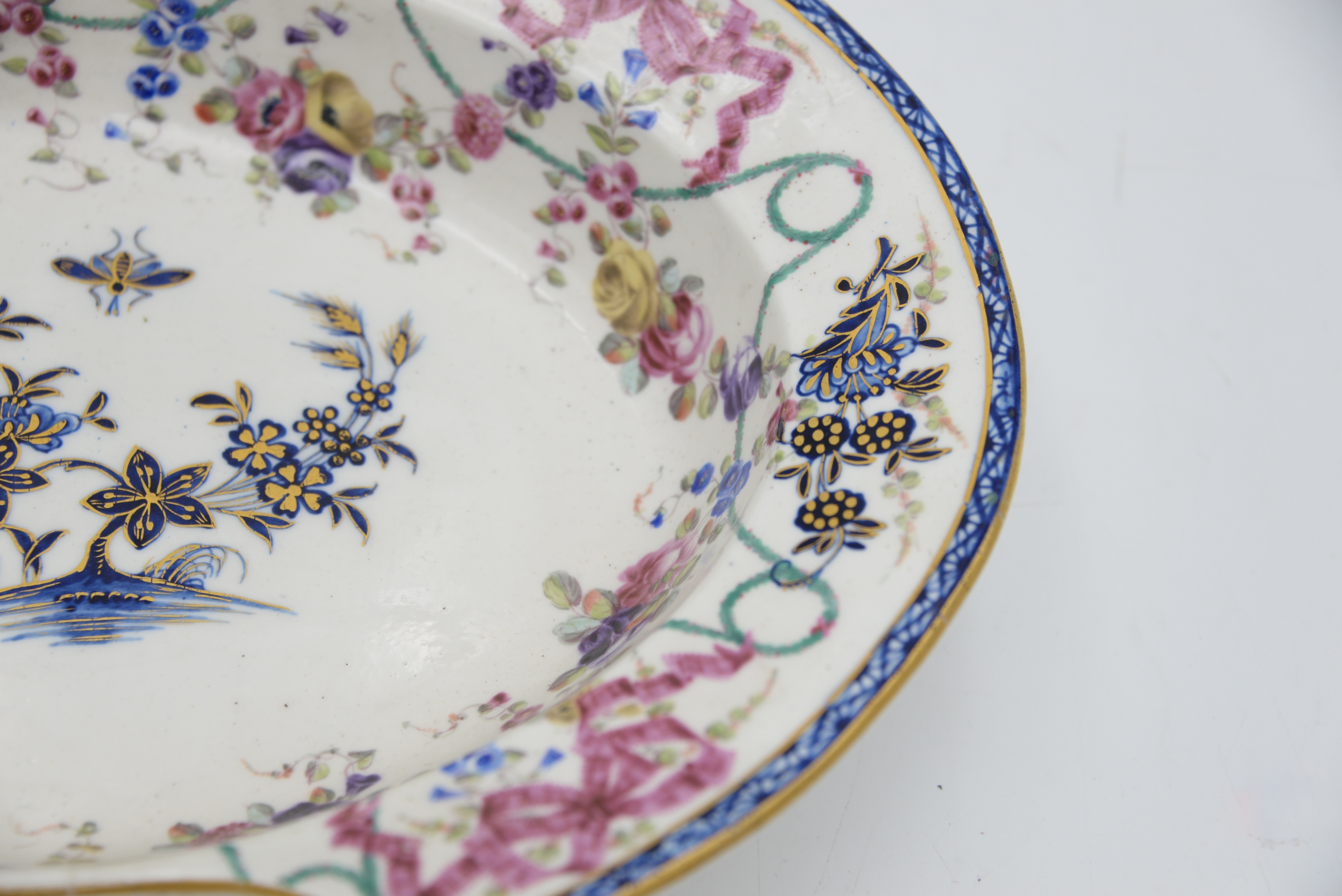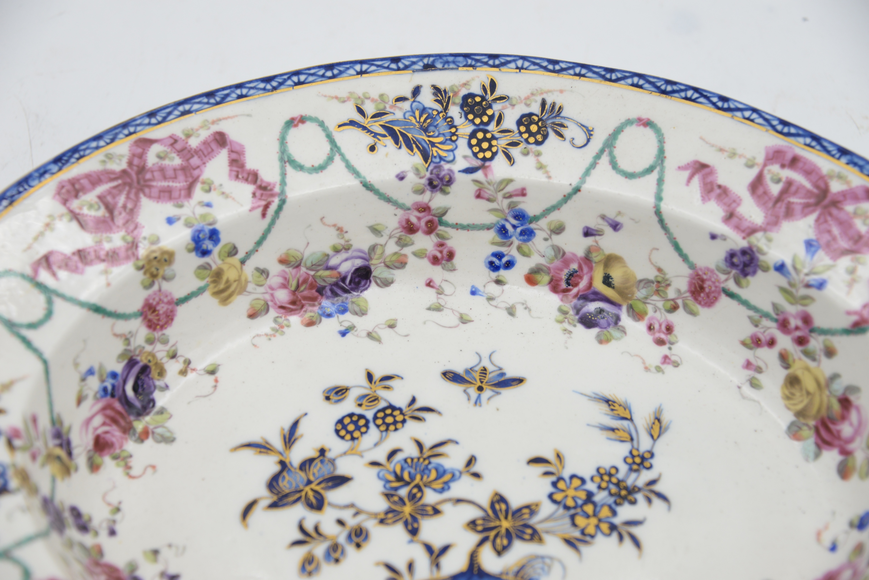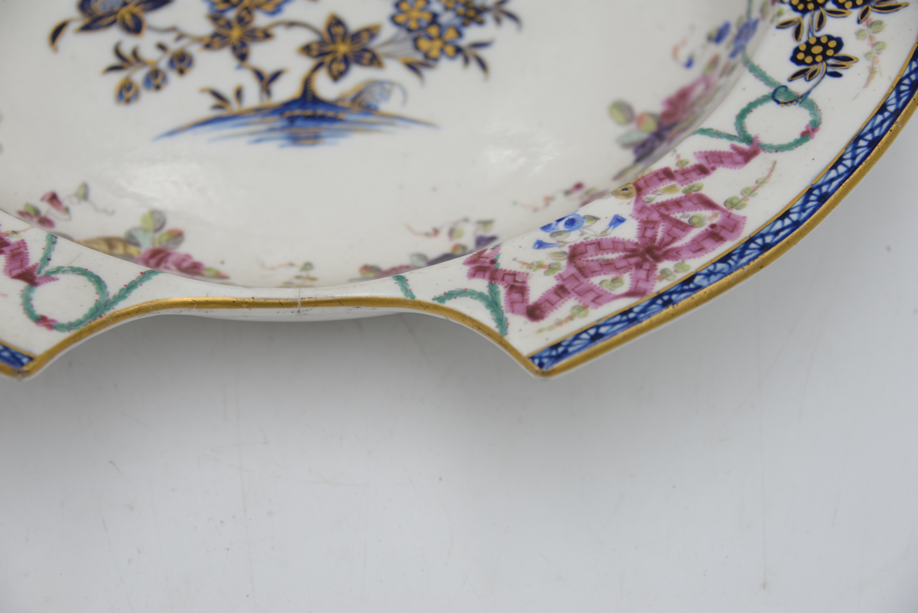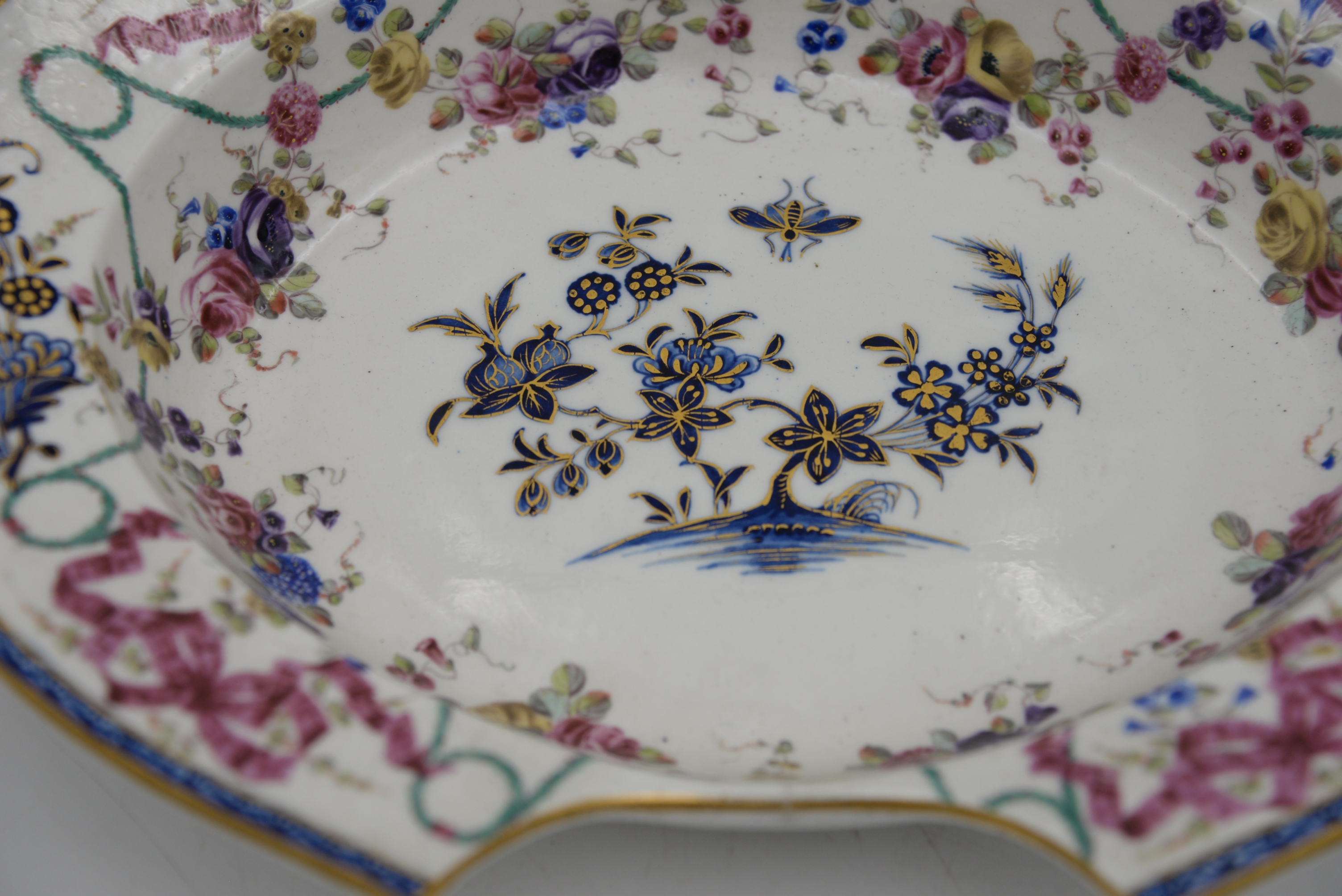 Rare Tournai Oval Barber’s Bowl, 18th century, having underglaze-blue flowering branches issuing from rockwork and scattered sprigs enriched with gilding, the edge enameled with ribbon-tied garlands of flowers, crossed swords and star mark, width 13 inches. Provenance: Parke-Bernet Galleries, New York, May 16,1953, lot 203, Julius H Jacobson II a Fifth Avenue Estate.