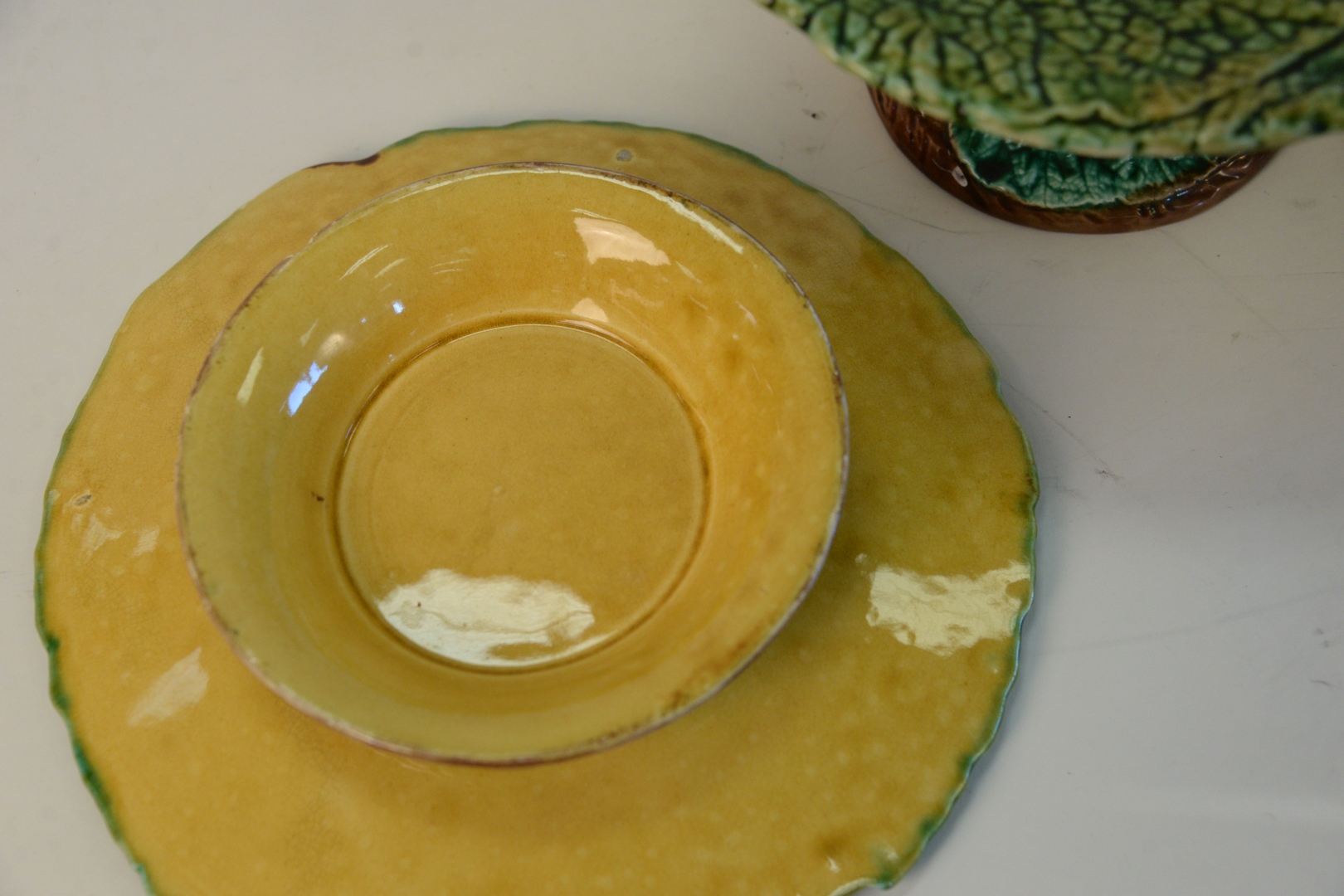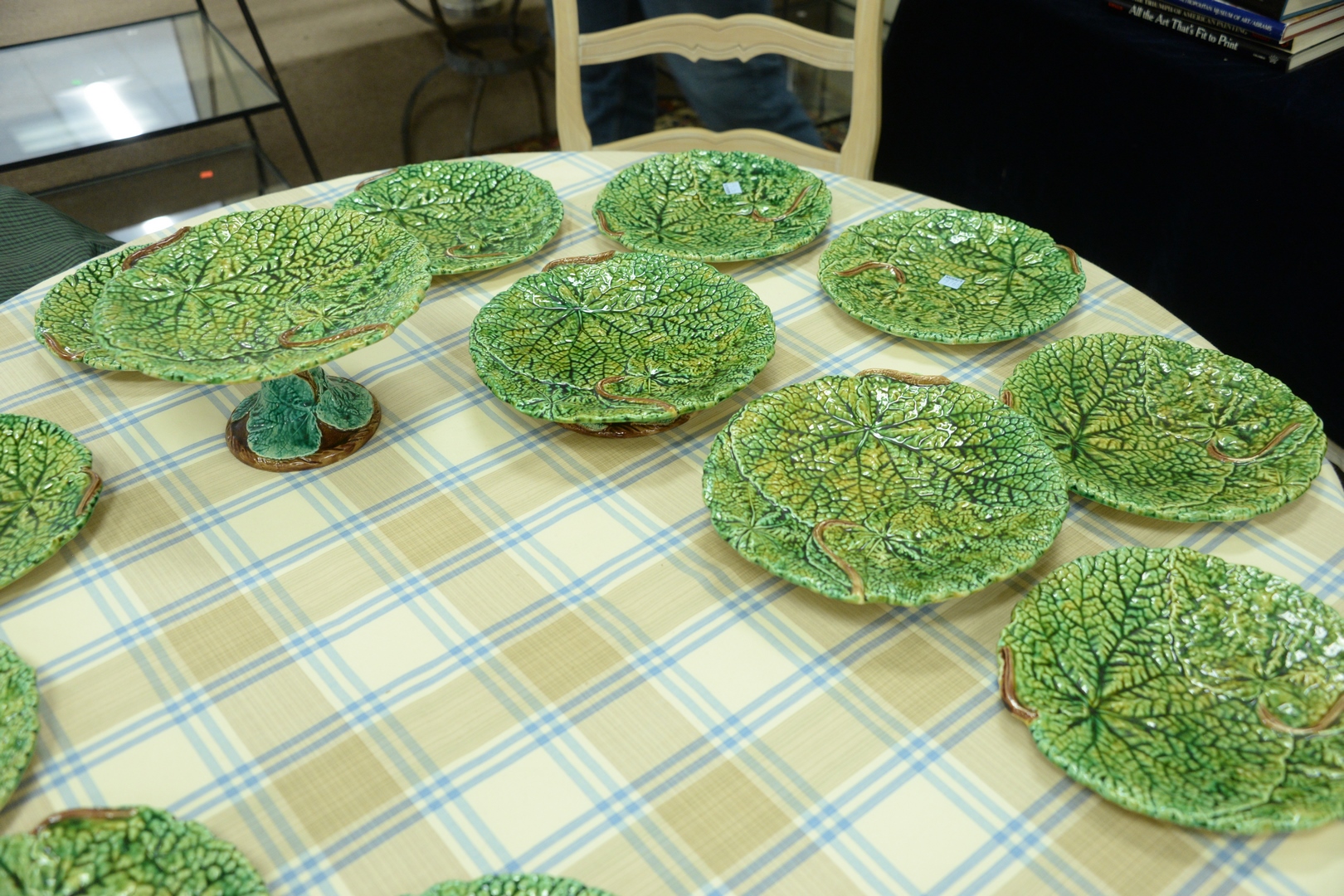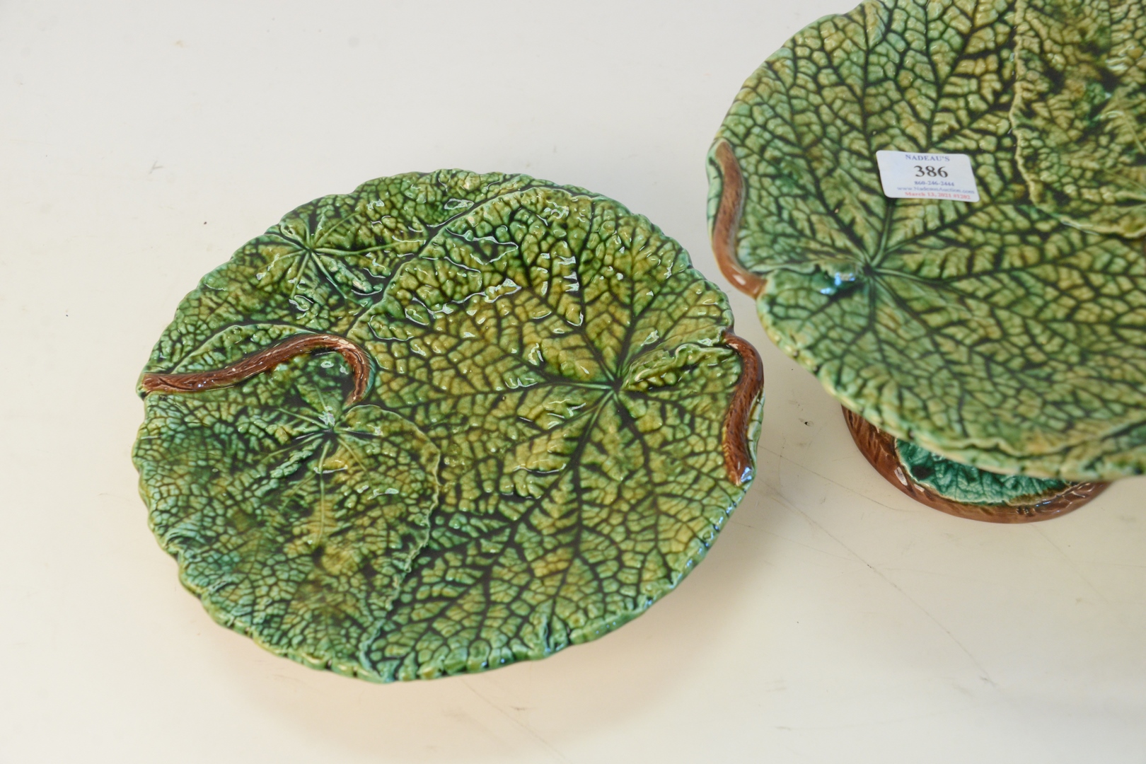 Lot 386: Sixteen Piece Lot of Majolica Porcelain, to include 11 leaf plates, diameter 9 1/2 inches 3 serving low compotes along with 2 tall…