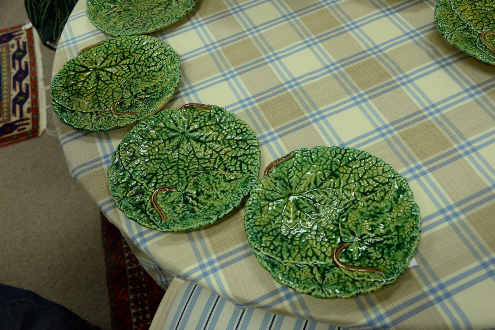 Sixteen Piece Lot of Majolica Porcelain, to include 11 leaf plates, diameter 9 1/2 inches 3 serving low compotes along with 2 tall compotes.