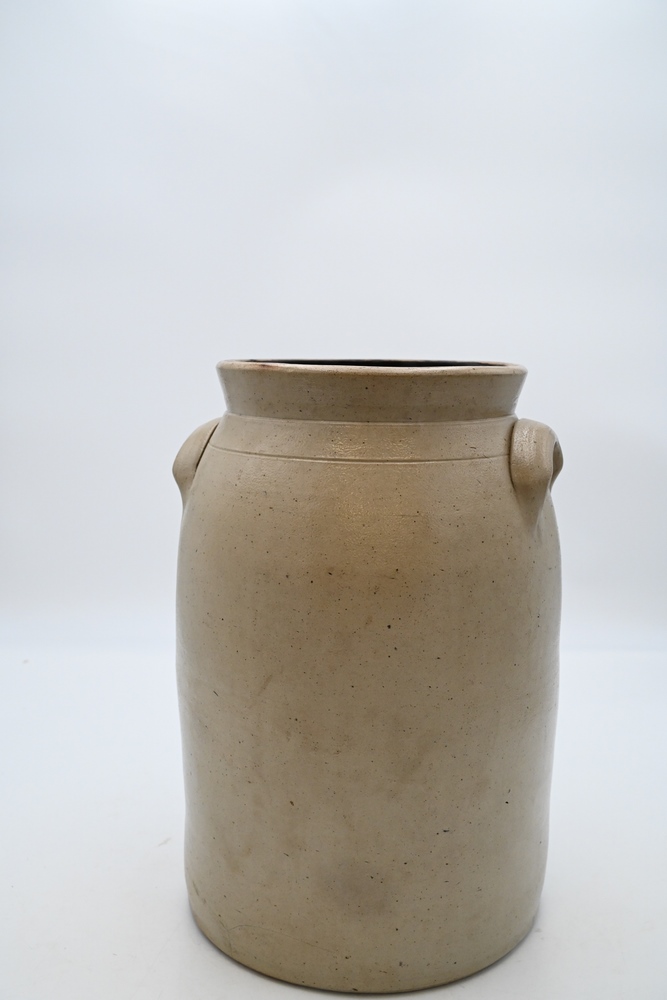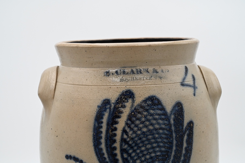 Lot 386: Stoneware Crock N. Clark & Co. four gallon having large cobalt blue flower height 15 inches Provenance: Estate of Bruce Sasalla, East Hartford, Connecticut.