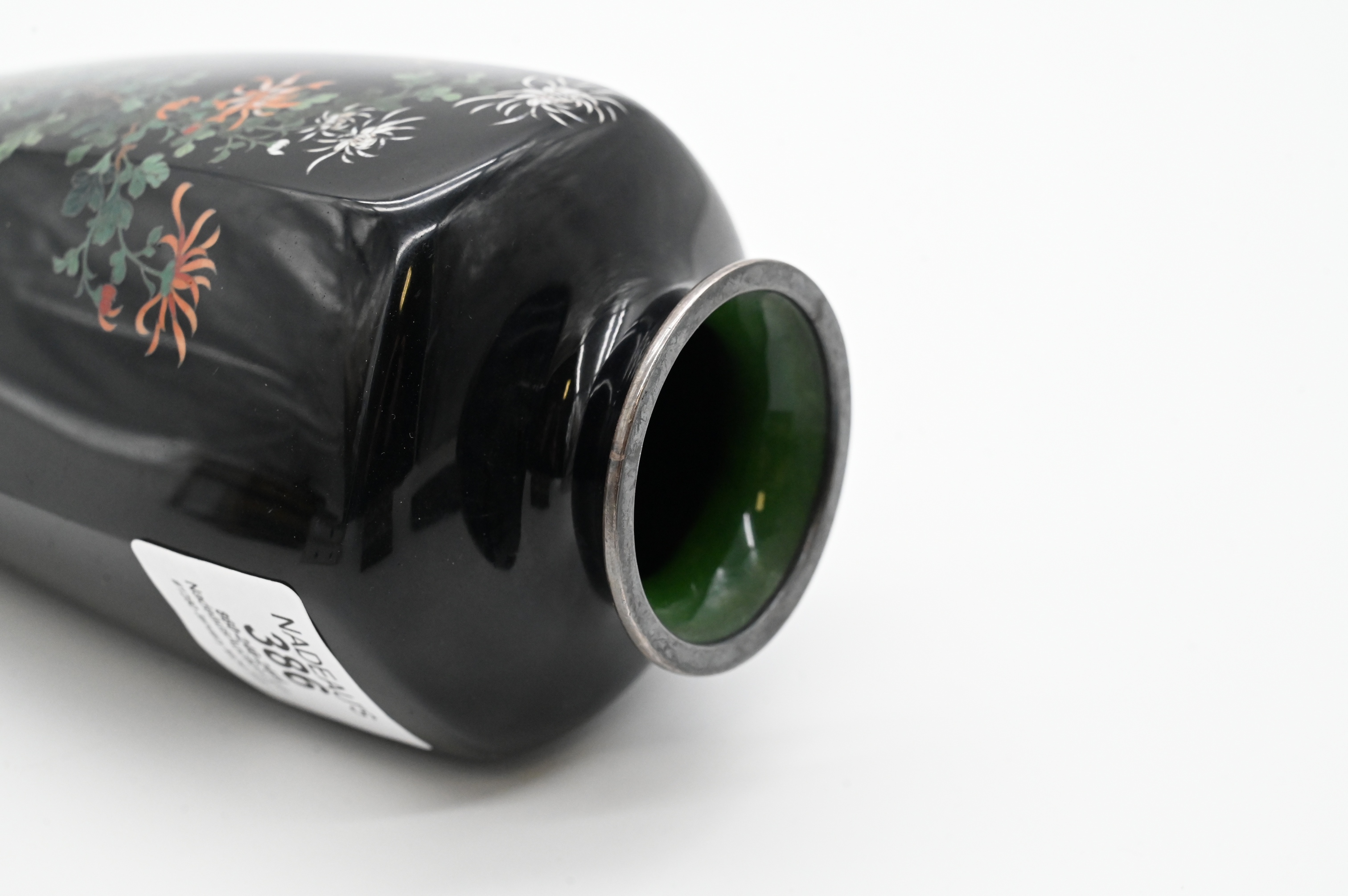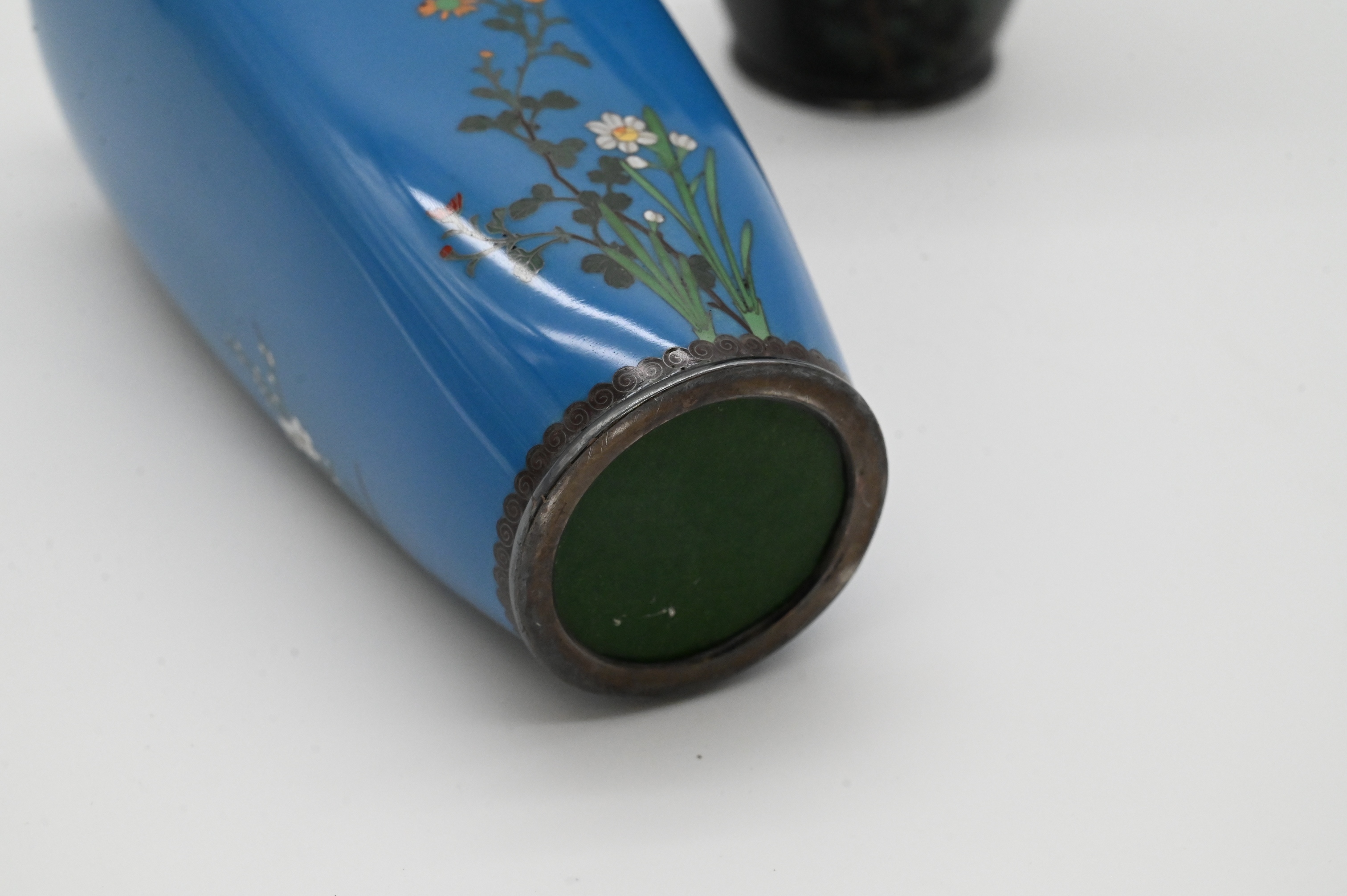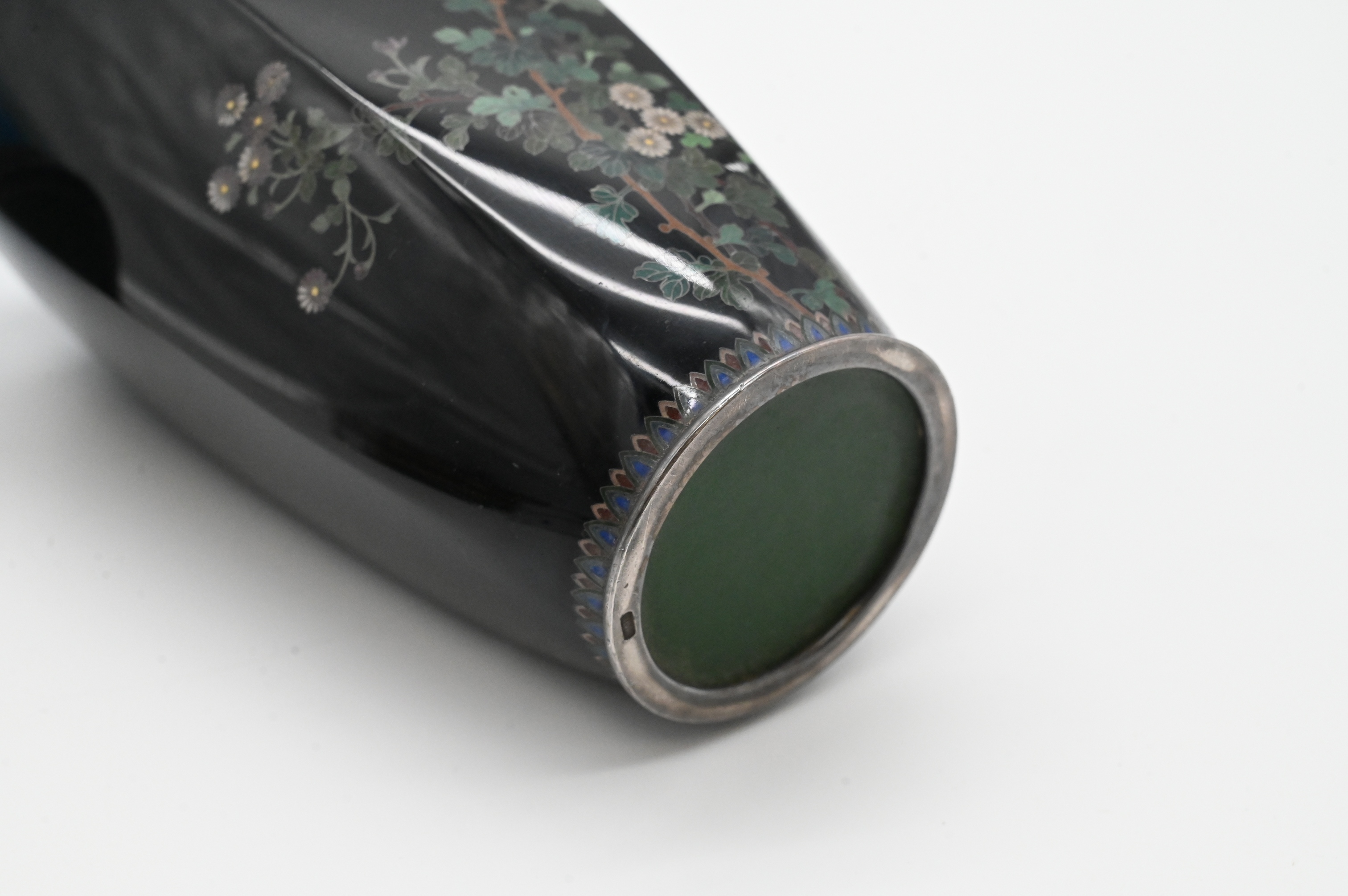 having tree flowers and bird having silver top and bottom Meiji-Taisho period, six sided, having silver top and bottom, possibly silver wire, signed on silver base Meiji-Taisho period
