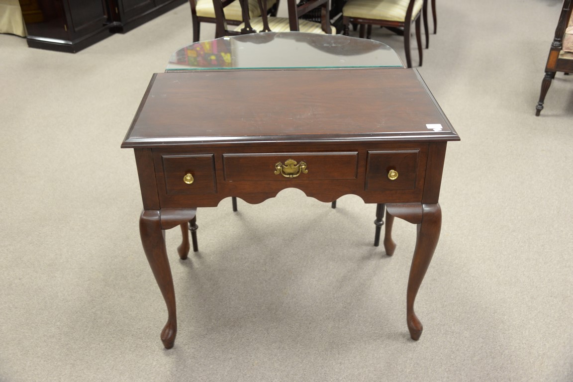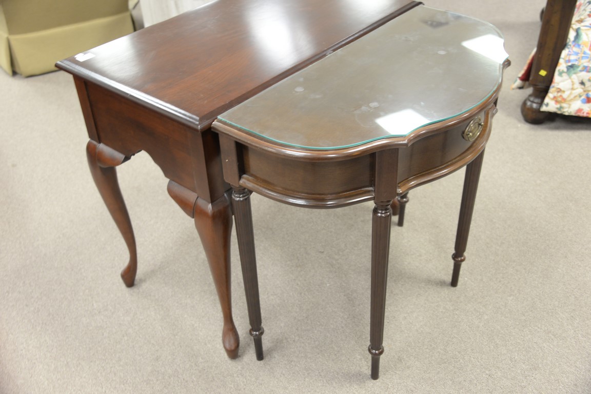 Lot 386: Two piece lot to include Contemporary lowboy ht. 30in., wd. 34in. and one drawer demilune game table ht. 30in., top: 16 x 29.