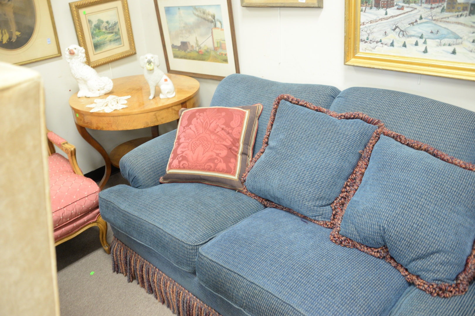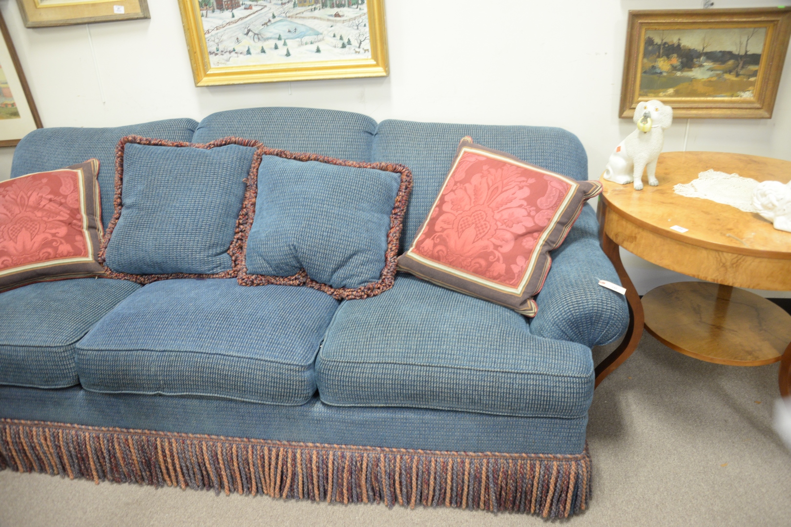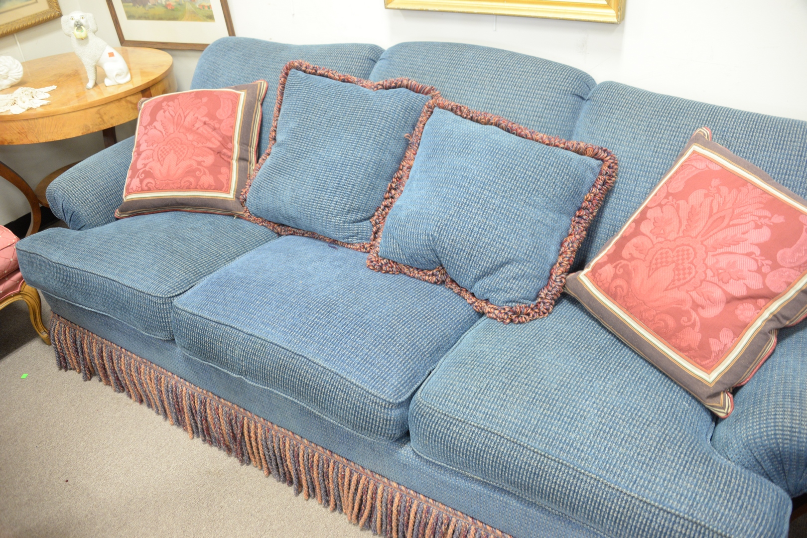 Lot 387: Ashley Manor Upholstered Sofa, having blue upholstery with fringe skirt, length 83 inches. Provenance: David and Cynthia Kim, 22 Stoney Wylde Lane, Greenwich, Connecticut. View home by visiting: https://www.zillow.com/homedetails/22-Stoney-Wylde-Ln-Greenwich-CT-06830/177238281_zpid/