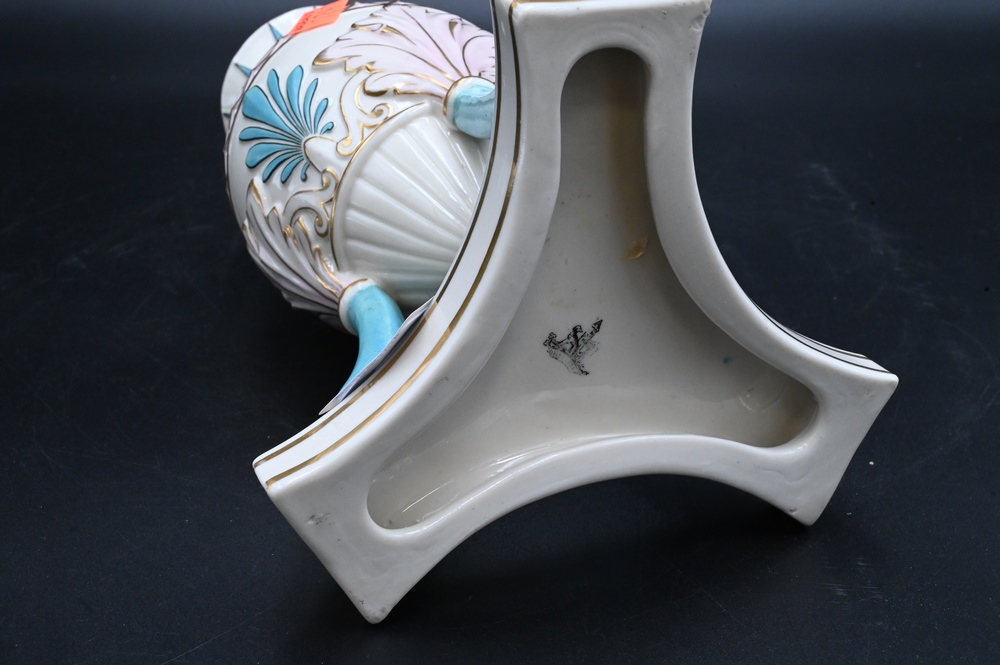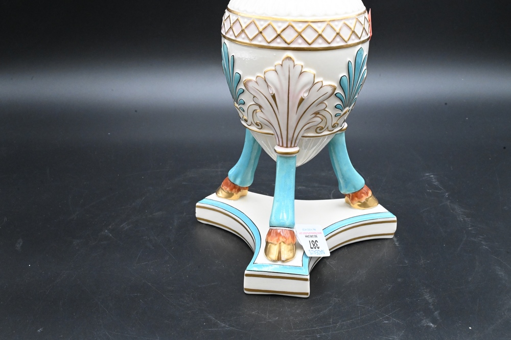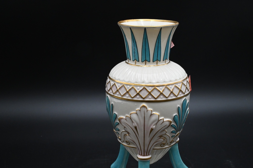Lot 387: Belleek Amphora Vase or Urn, on tripod floof foot legs and platform base, early black mark on bottom, height 10 inches. Provenance: Collections of Norma Reilly, New Jersey.