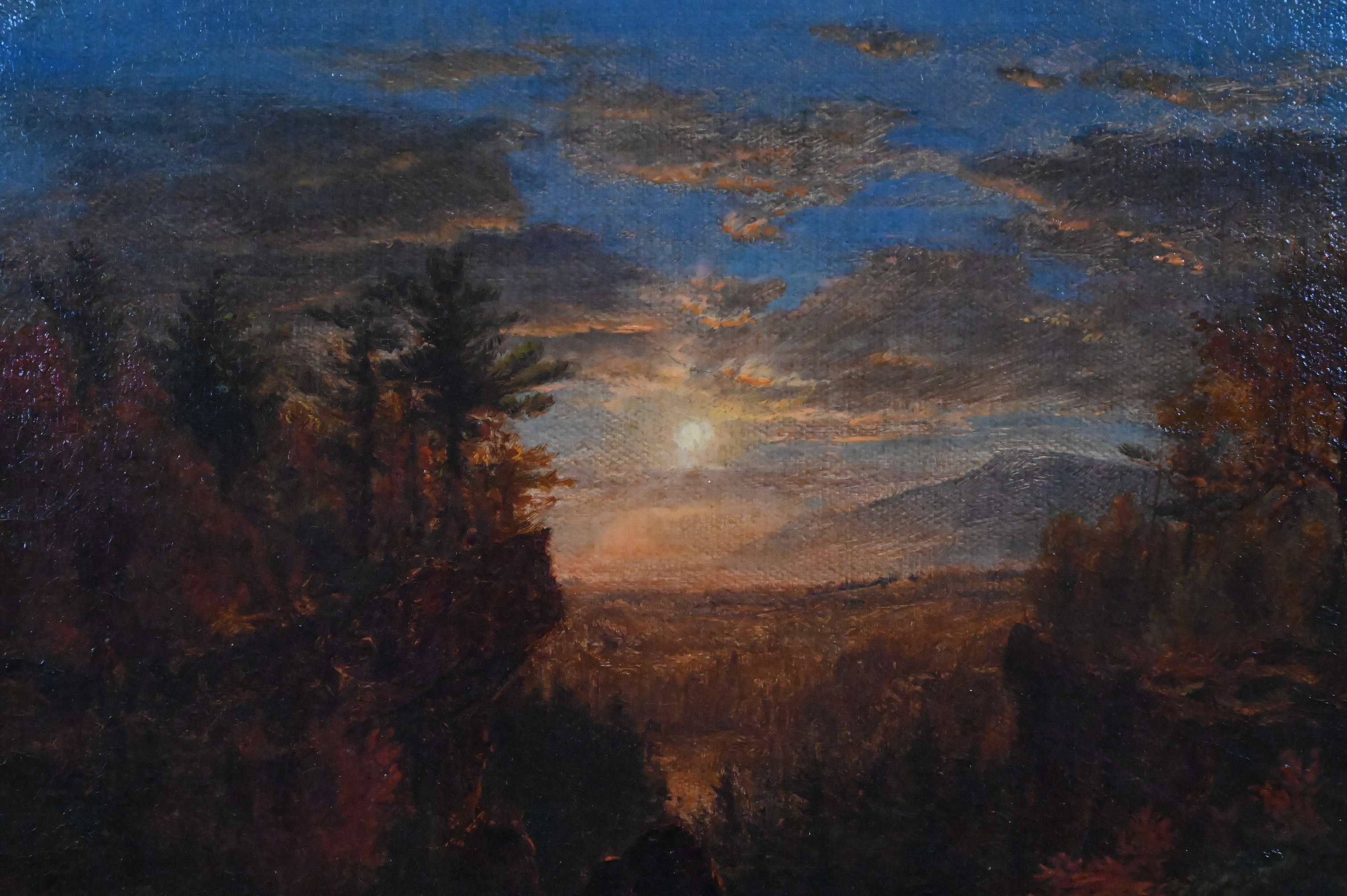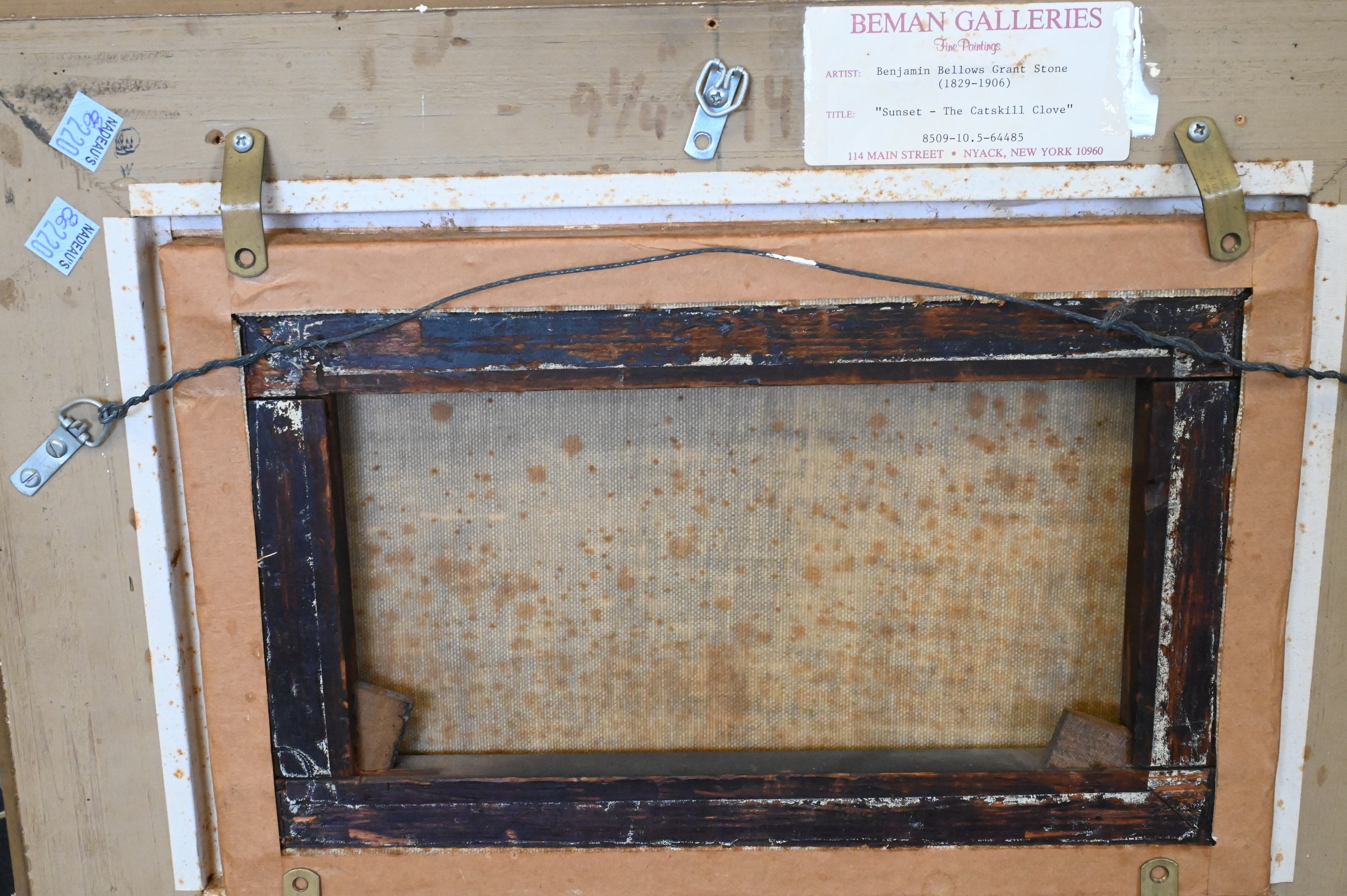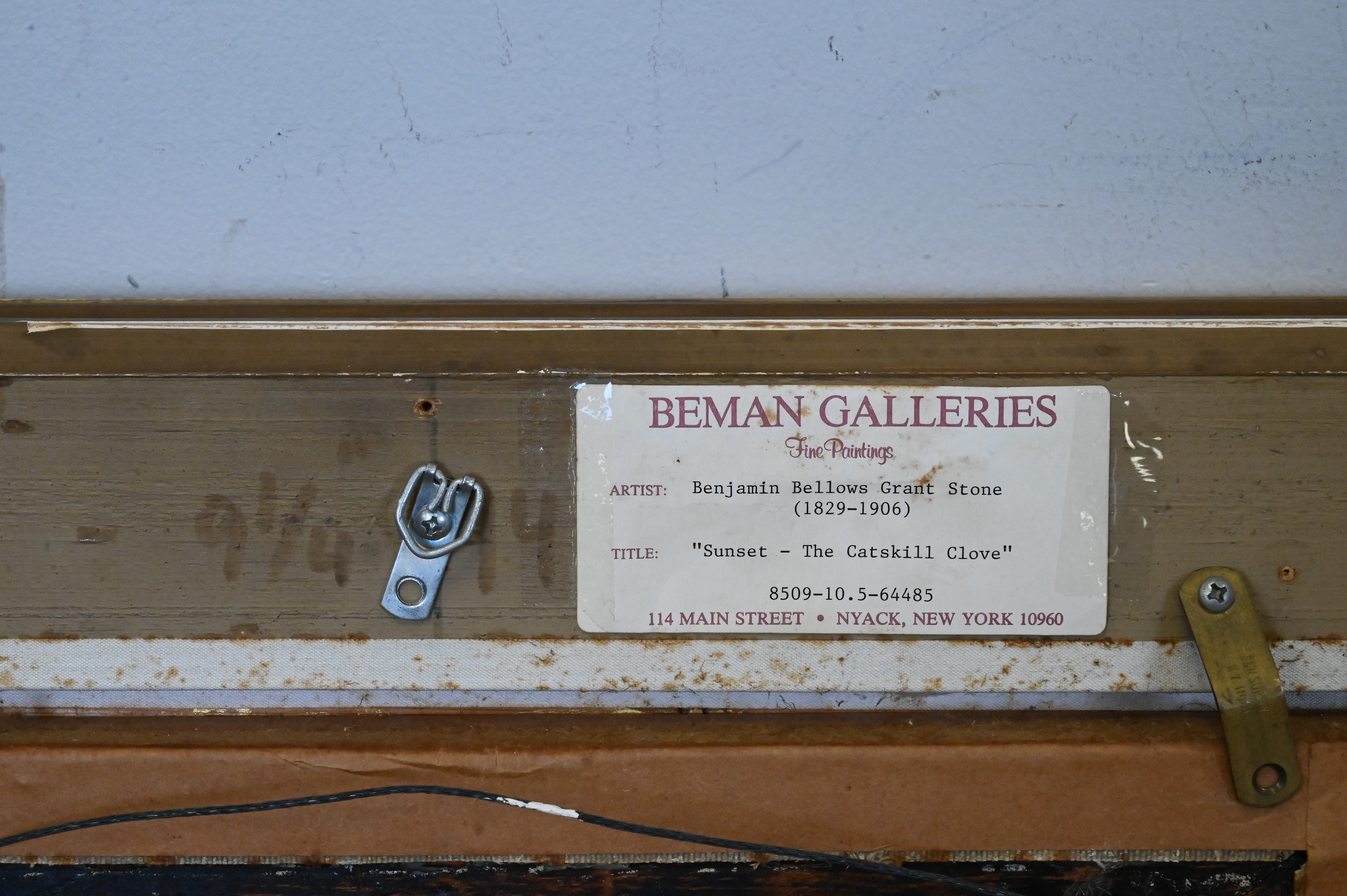 a luminous Hudson River School–style twilight view of the famed Catskill Clove. The composition centers on a radiant, warmly glowing sunset illuminating a winding river or lake between steep forested banks. Stone’s brushwork captures the atmospheric depth and misty tonal transitions characteristic of mid-19th-century American luminism, with delicate highlights on the foliage and distant cliffs.