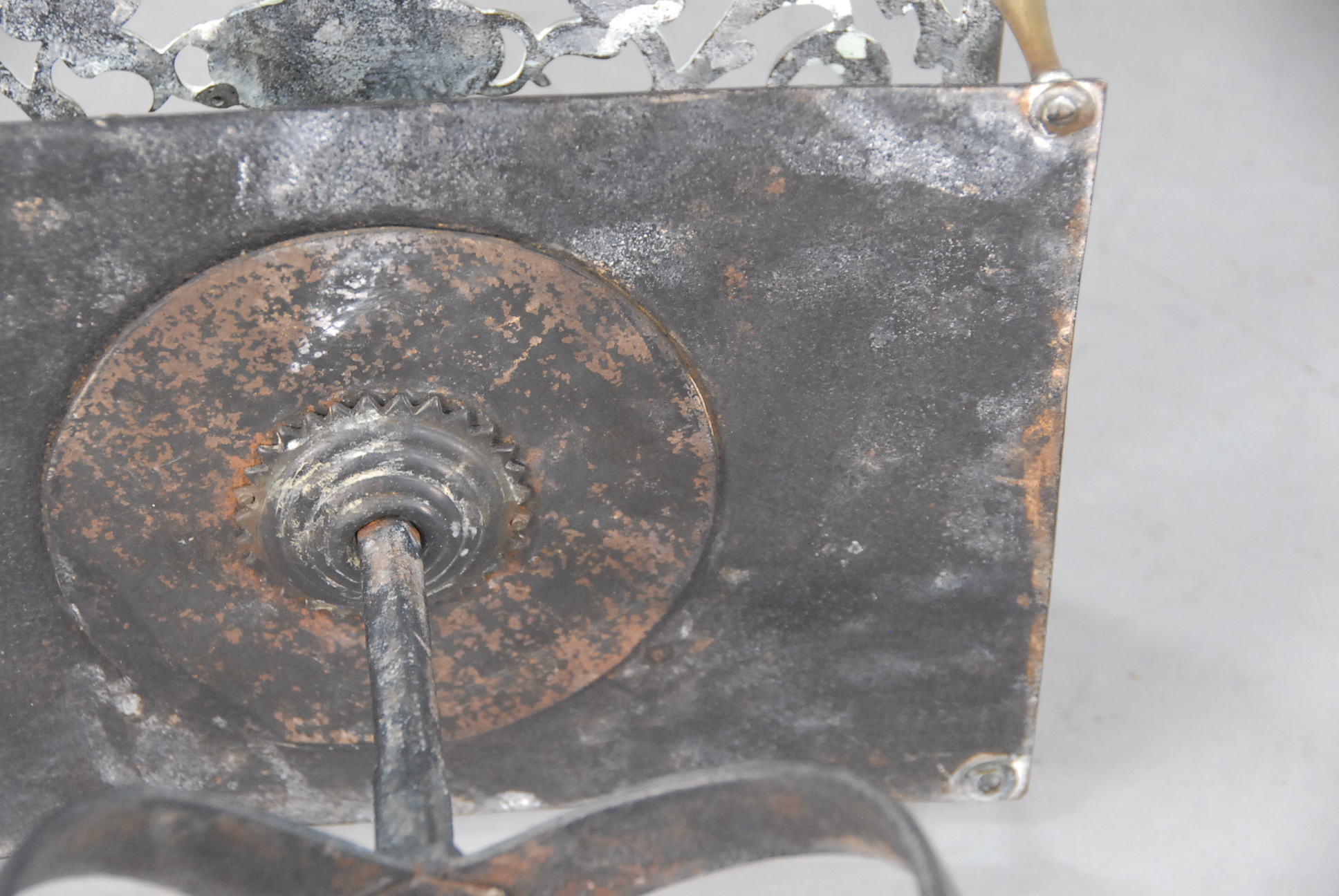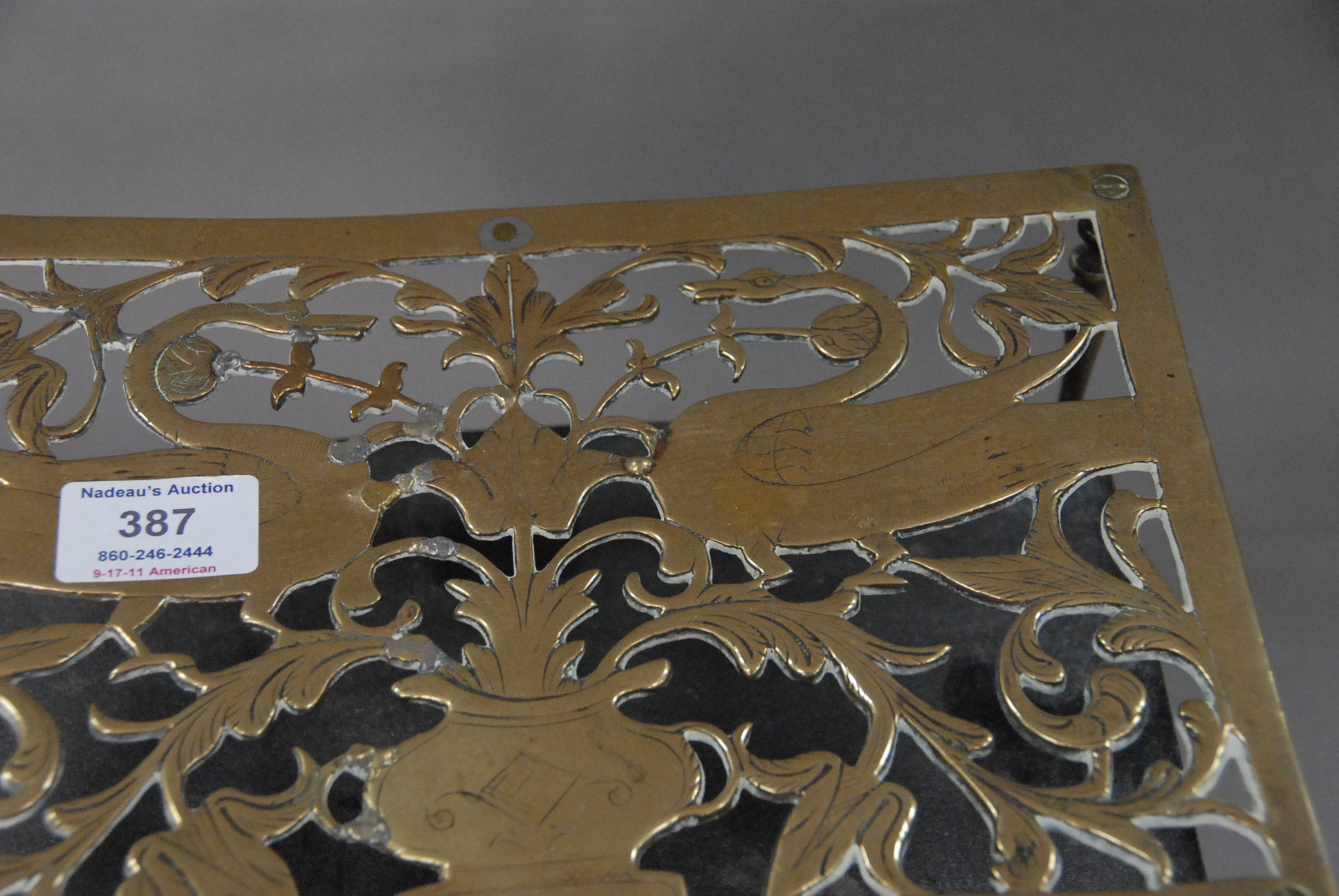 Brass and iron trivet with two swans on top.