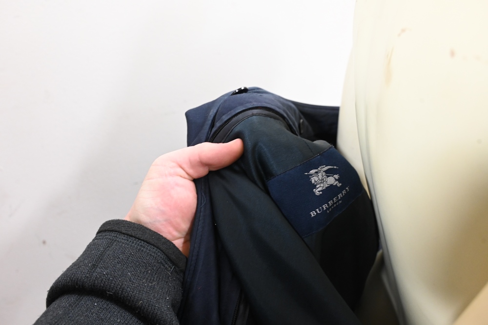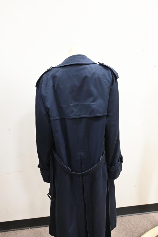 Burberry Trench Coat, navy blue, having Burberry London Label.