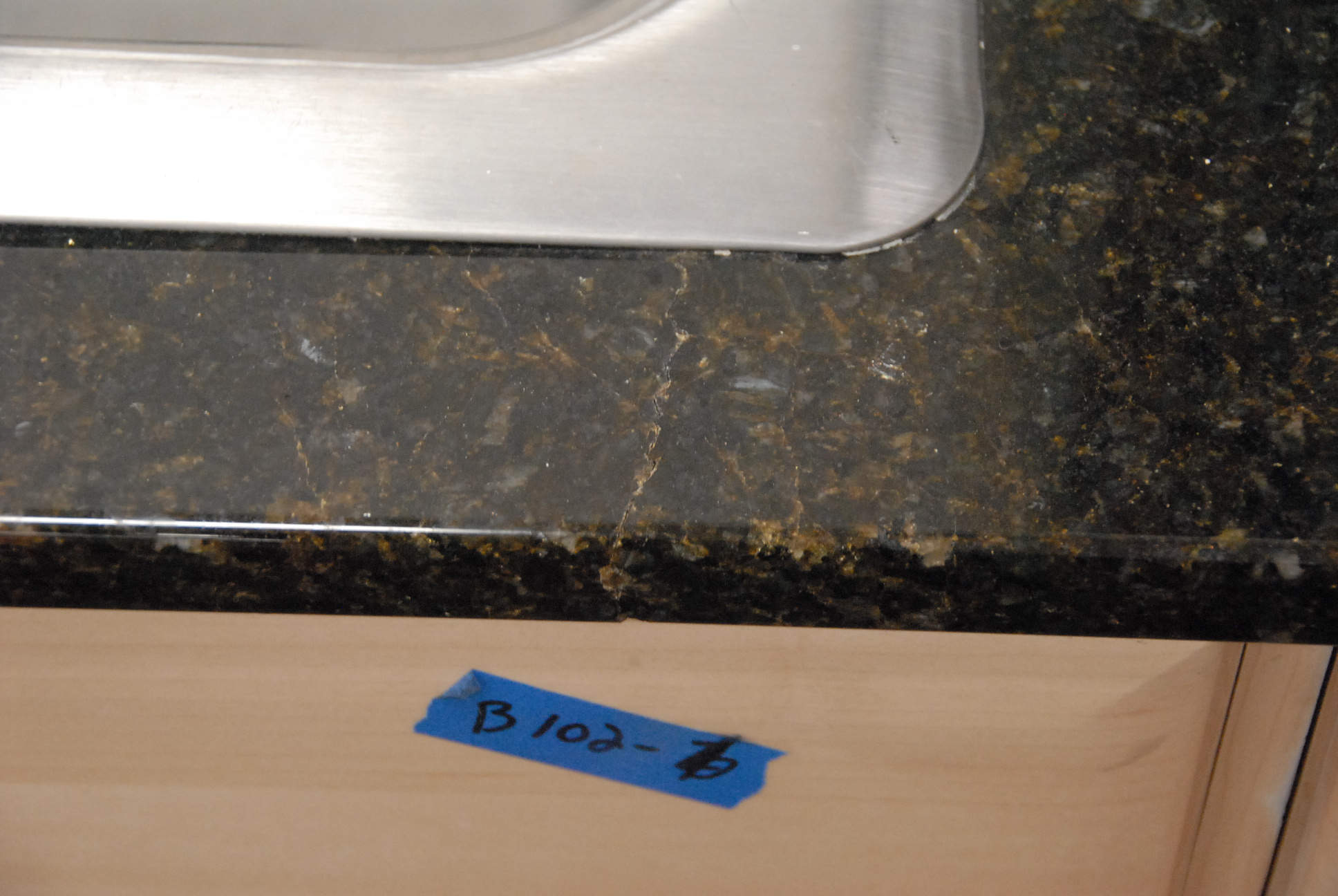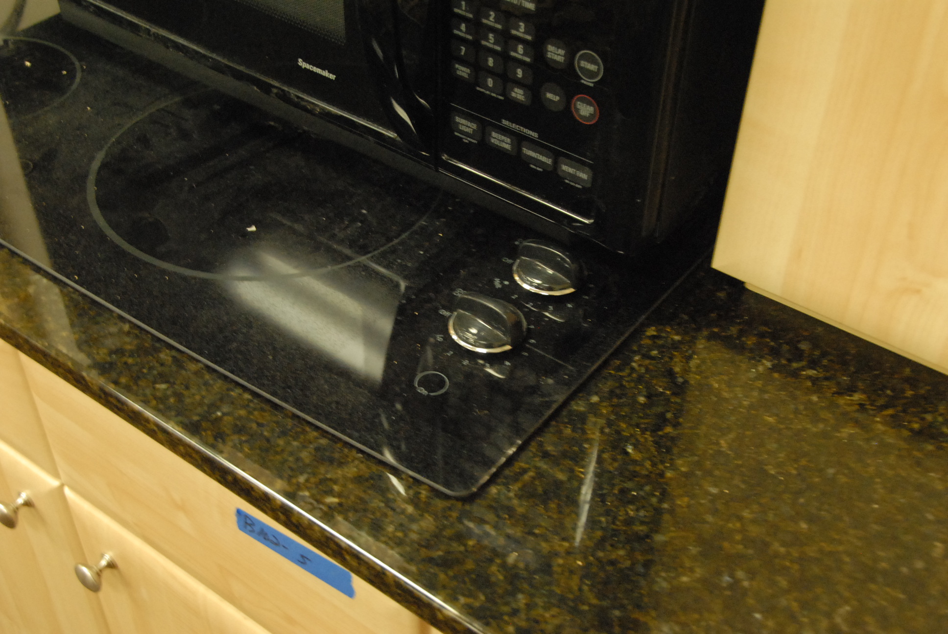Custom kitchen set having granite tops, seven kitchen cabinets with hardware, stainless sink with faucet, GE profile stove top, GE wall mount microwave and side panels for refrigerator.