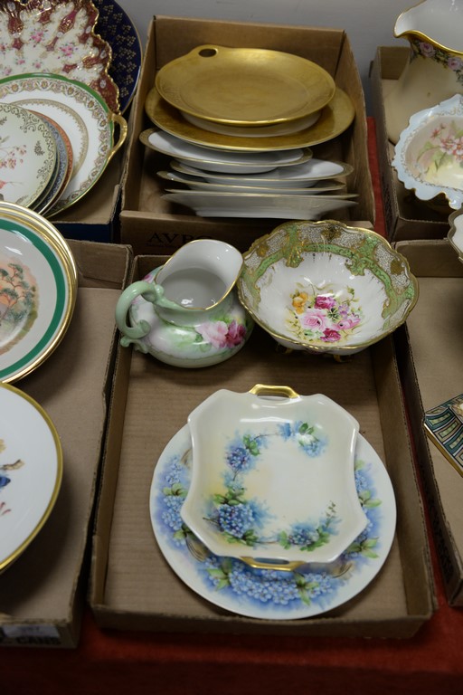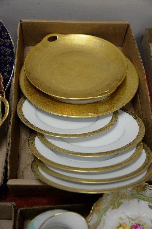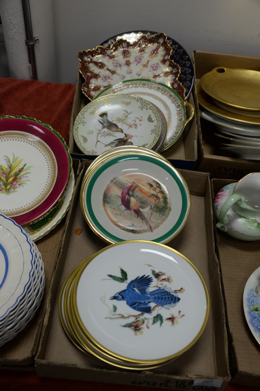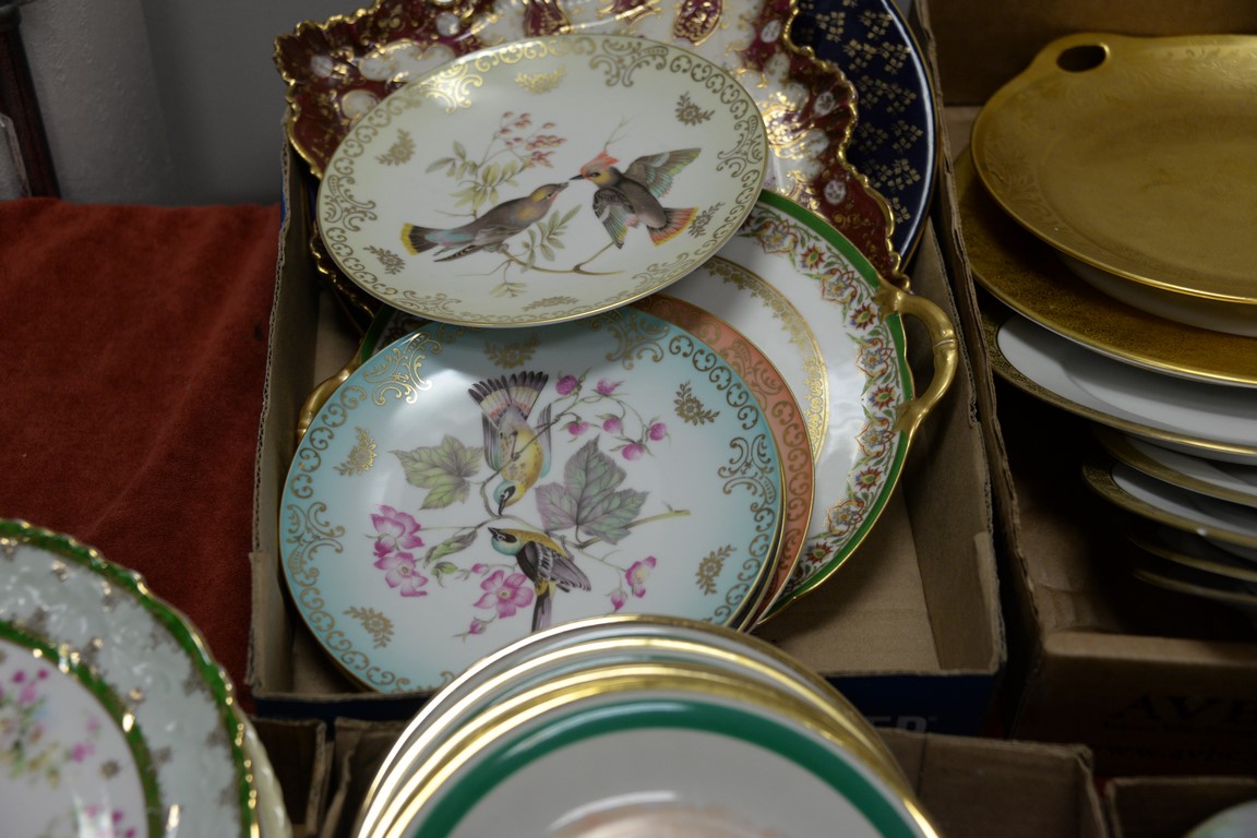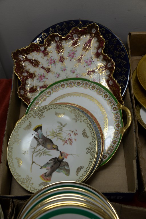 Five box lots with porcelain plates, set of 9 D’arceau Limoges, Selb Bavaria bird plates, Copeland Spode plates, etc.