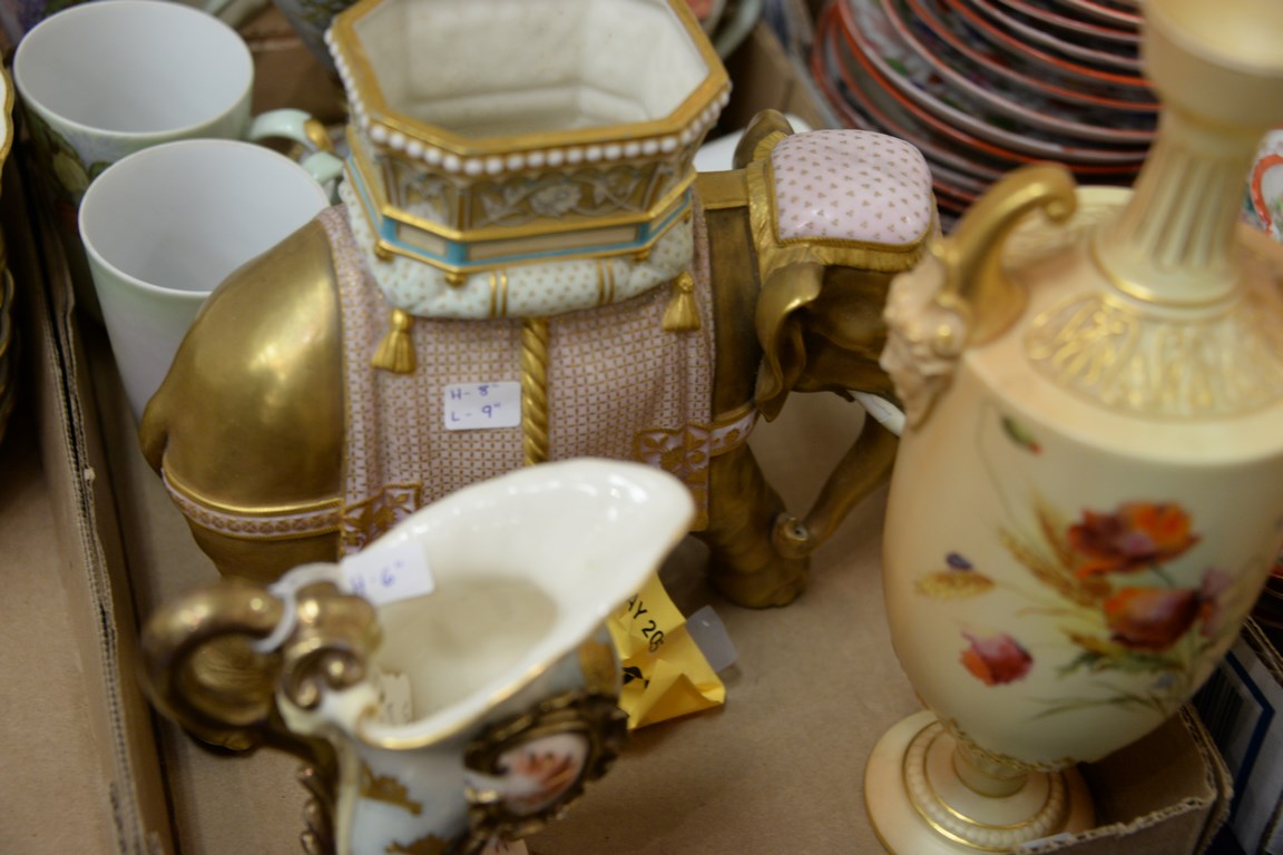 Lot 387: Four box lots with a set of 12 Minton plates, Weller urn, two pairs of vases as is, Royal Worcester elephant tusk broke, vase, l…