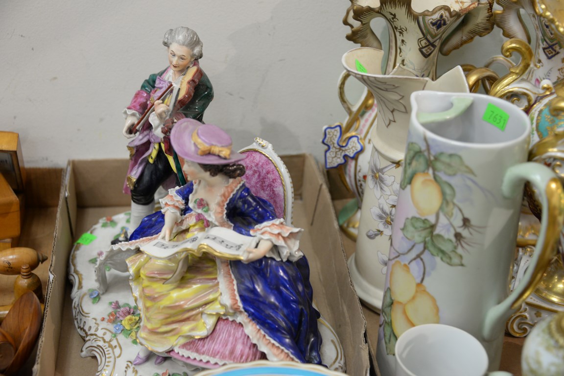 Four box lots with a set of 12 Minton plates, Weller urn, two pairs of vases as is, Royal Worcester elephant tusk broke, vase, large double figure, etc.