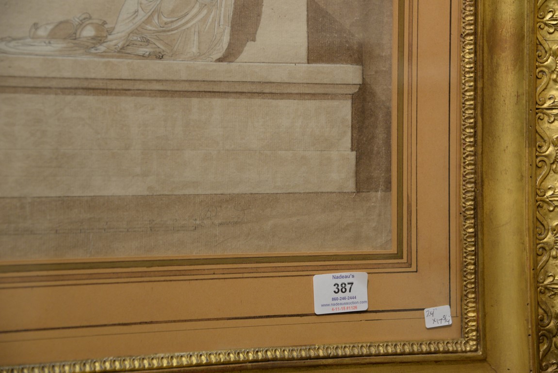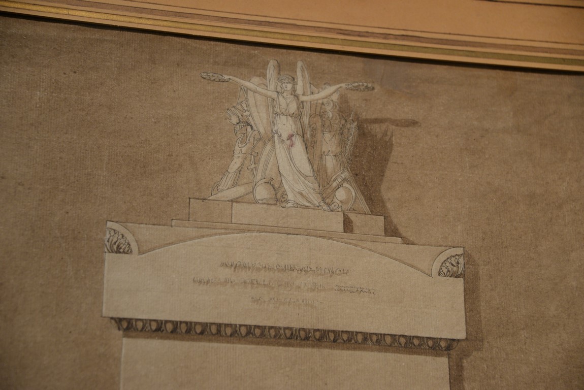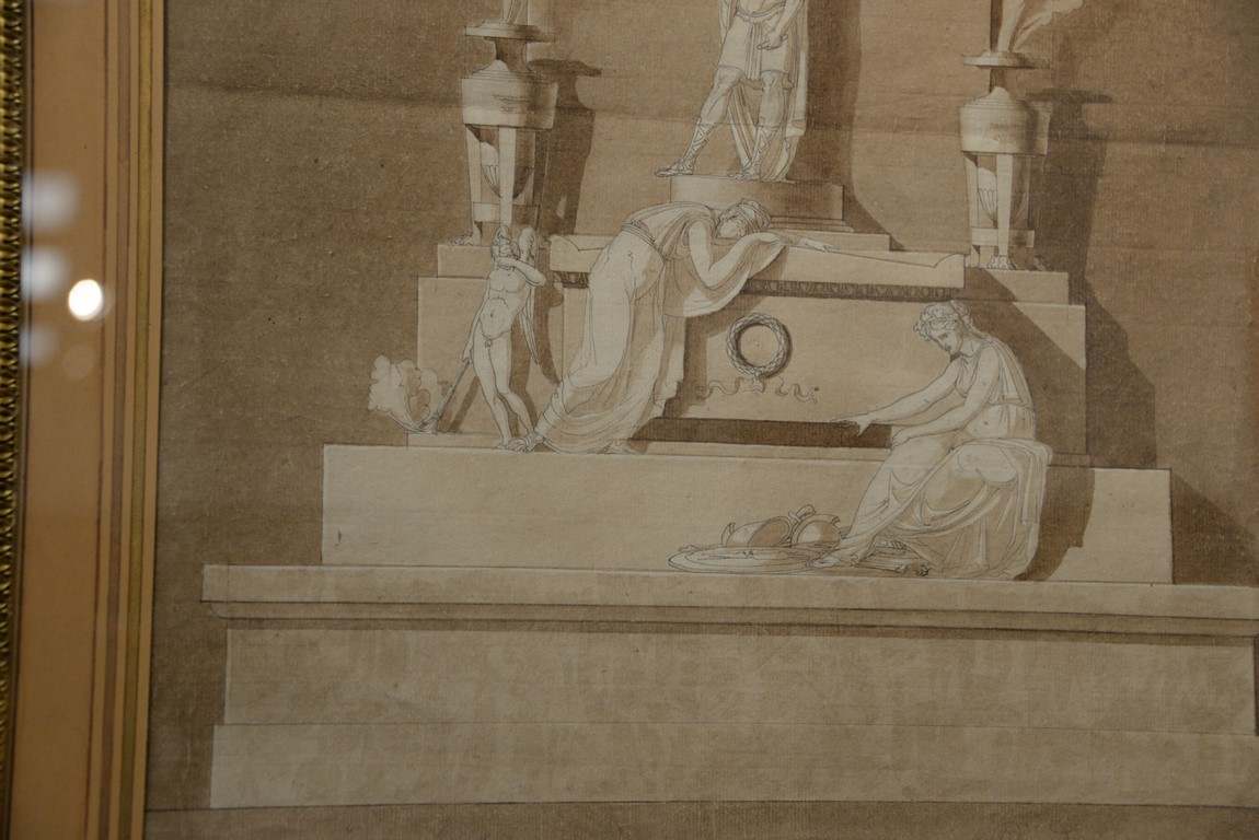 Lot 387: FRENCH SCHOOL Design For a Funerary Monument pen, ink with brown wash 24 x 17 3/4 The Artis Group LTD New York label on reverse 19th Century Provenance: Sold at Christies 2014 Exhibited: New Y