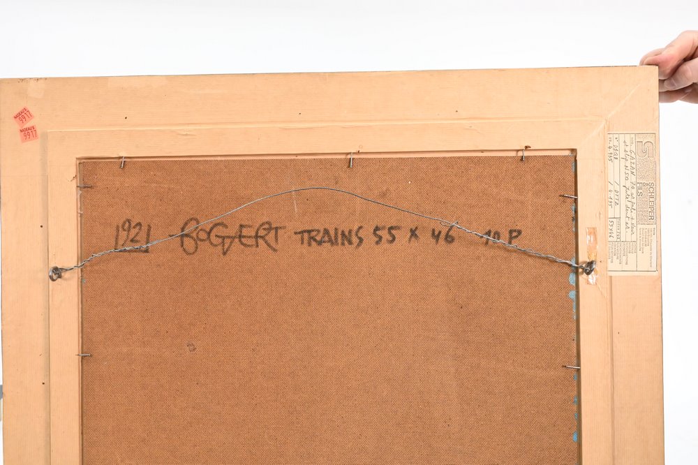 Gaston Bogaert (Belgian, 1918 – 2008), Trains, oil on masonite, signed lower right Bogaert, signed, having a Schleiper & Fils label on the reverse, height 18 1/2″ x 21 5/8″.