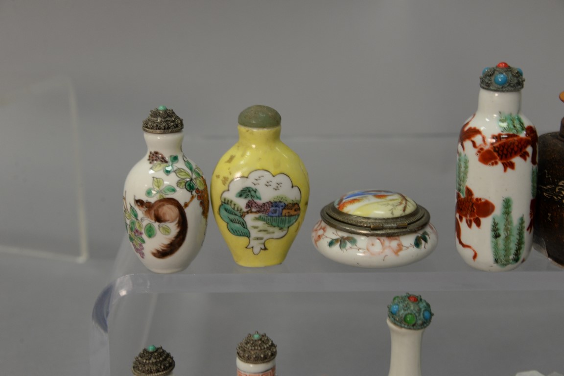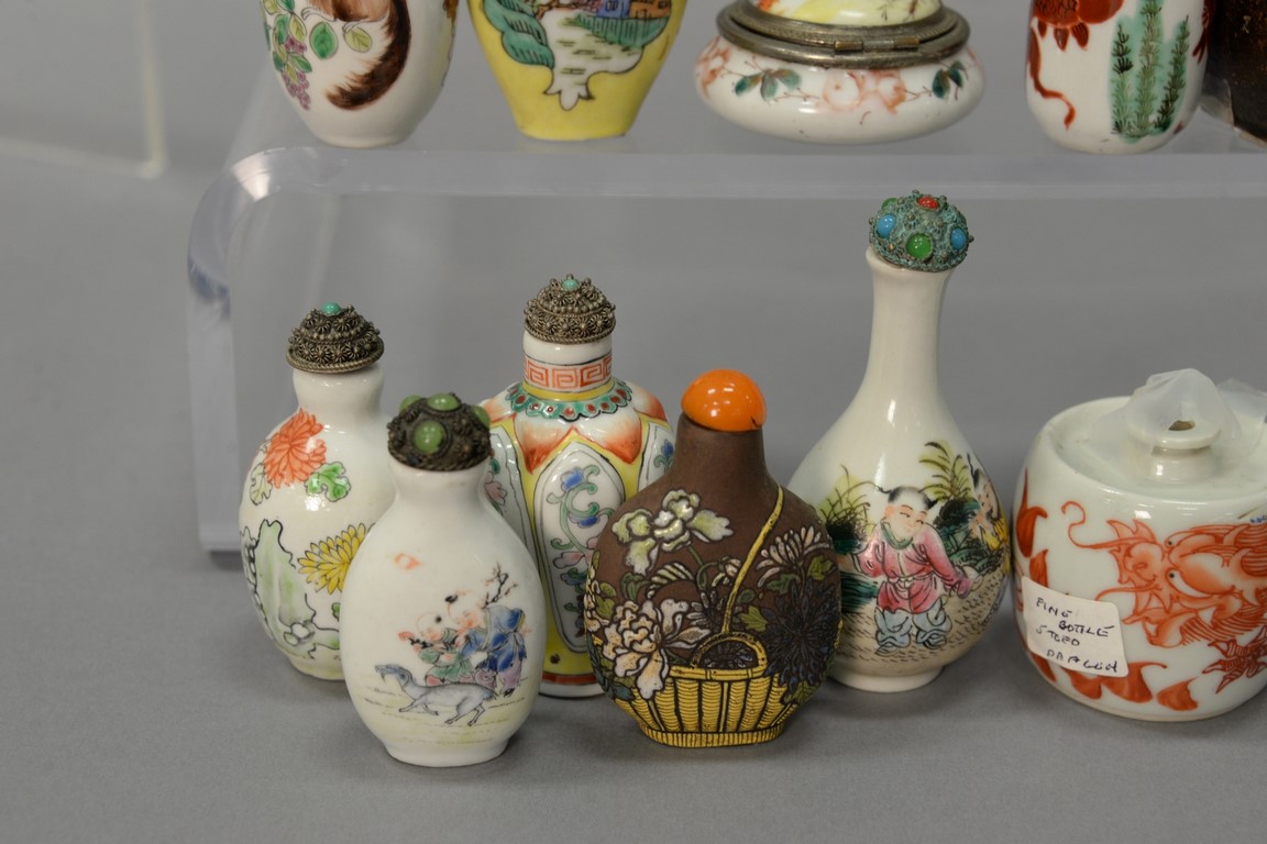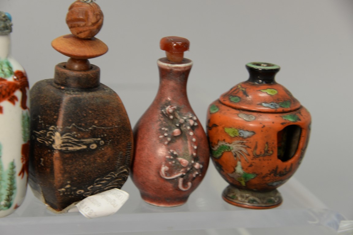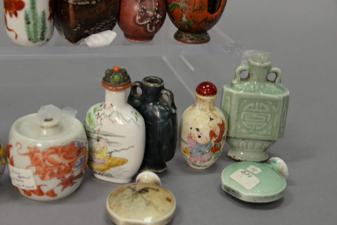 Group of nineteen porcelain, ceramic, and clay snuff bottles to include famille rose, celadon glazed, etc.