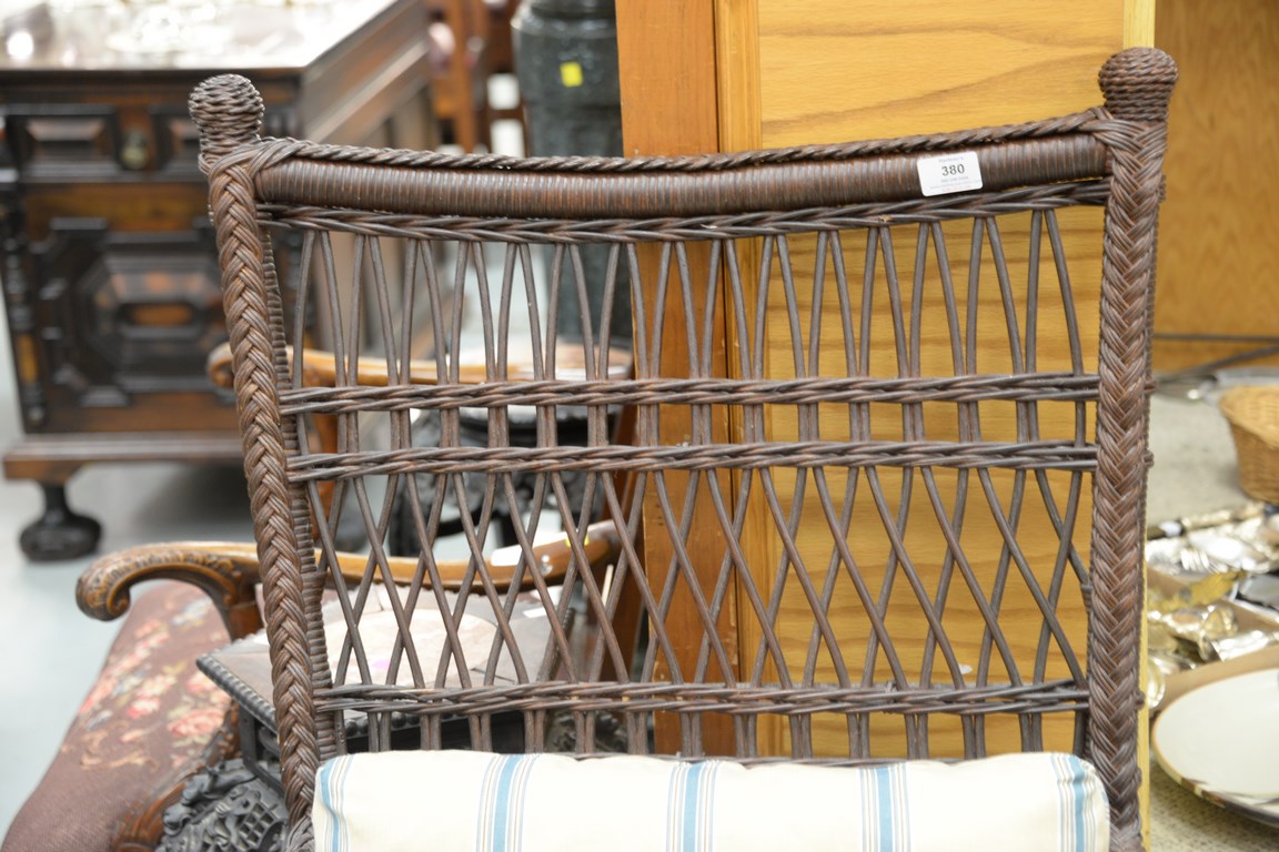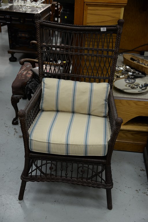 Hickory wicker chair with cushions. ht. 45 1/2 in. wd. 23 in.
