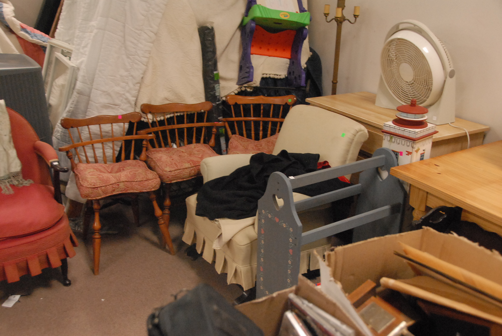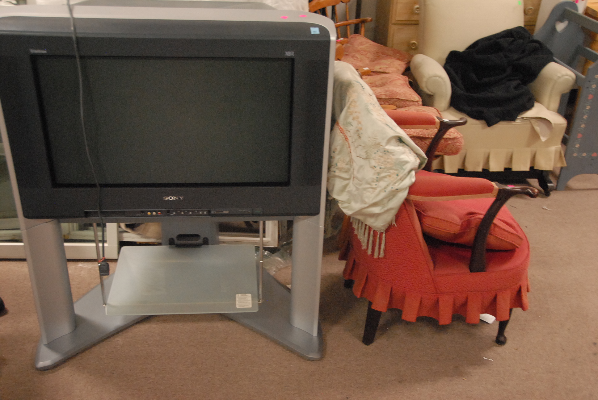 Items in this lot must be picked up no later than noon on Monday 6/10/13 Large house lot to include two tables on top and below of boxes of china, prints, carolers, silverplate, glass cups, cookware, china sets, purses, bedding, large Sony television, three matching kitchen chairs, several living room chairs, large pine table, three drawer chest, mahogany two drawer drop leaf stand, cedar chest, four drawer mahogany chest, mahogany slant lid desk, bookcases, lamps, double size walnut bed, metal and glass table, etc.