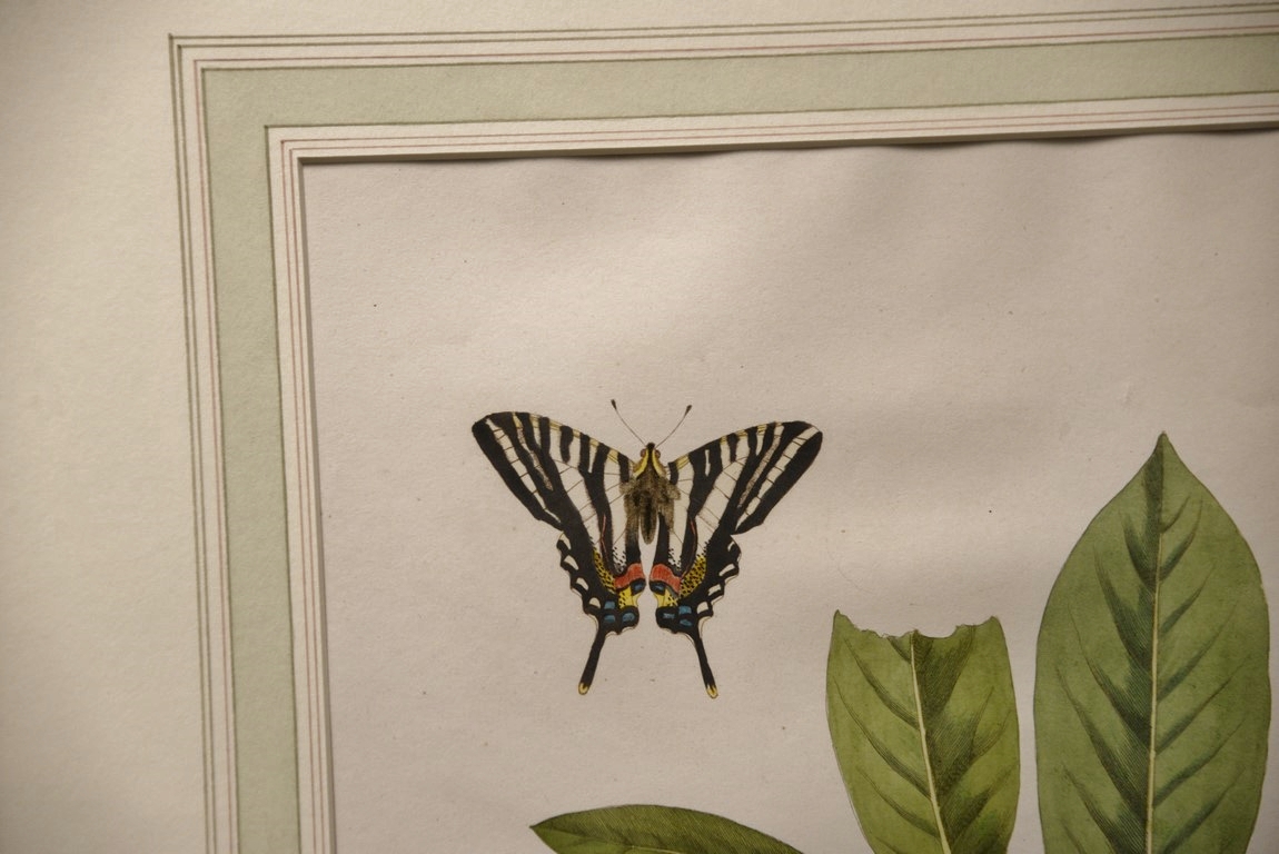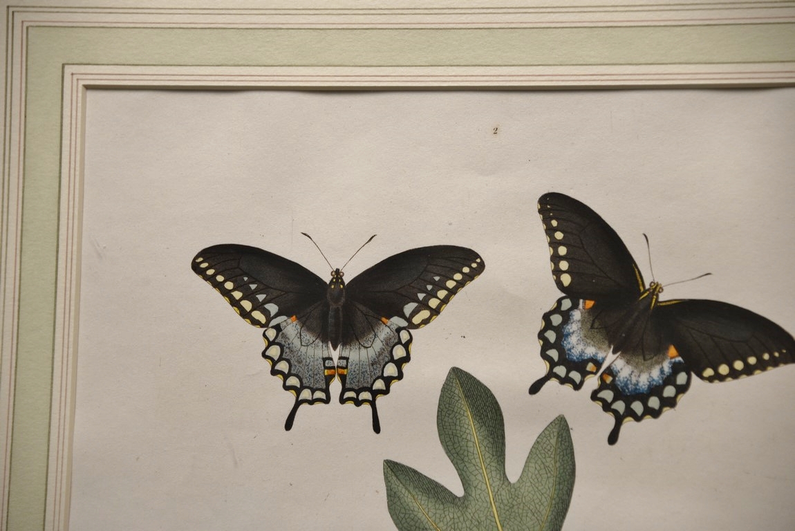 John Abbot 1751-1839 pair of hand colored aquatint engravings Papilio Ilioneus, Sassafras Black Swallow Tail Butterfly Plate #2 and Papilio Ajax, Black-Barred Swallow Tail Butterfly Plate #4 From The Natural History of the Rarer Lepidoterous Instects of Georgia Published by James Edward Smith 1759-1828 framed and matted by W. Graham Arader III sight size: 14 x 11 Provenance: Property from Credit Suisse’s Americana Collection