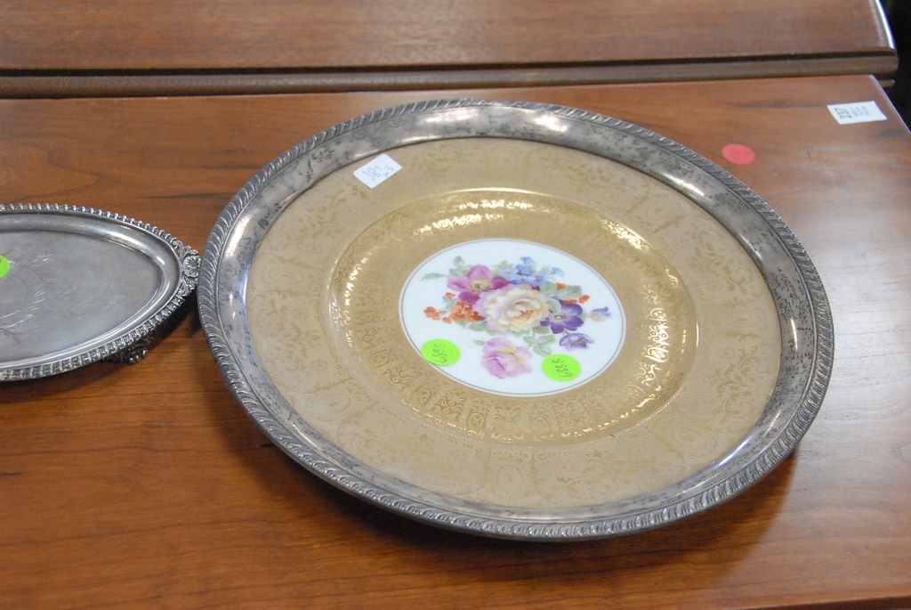 Lot 387: lot Tiffany silver-plate warmer dish, sterling rimmed plate, and small tray.