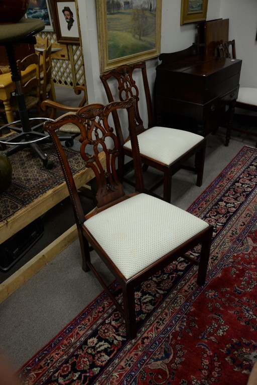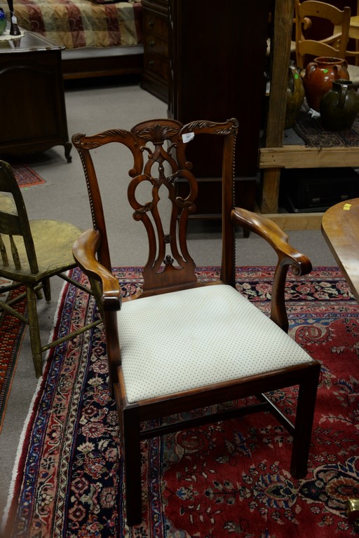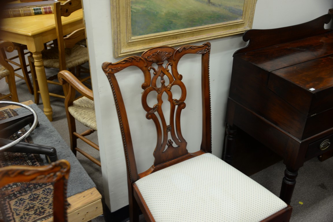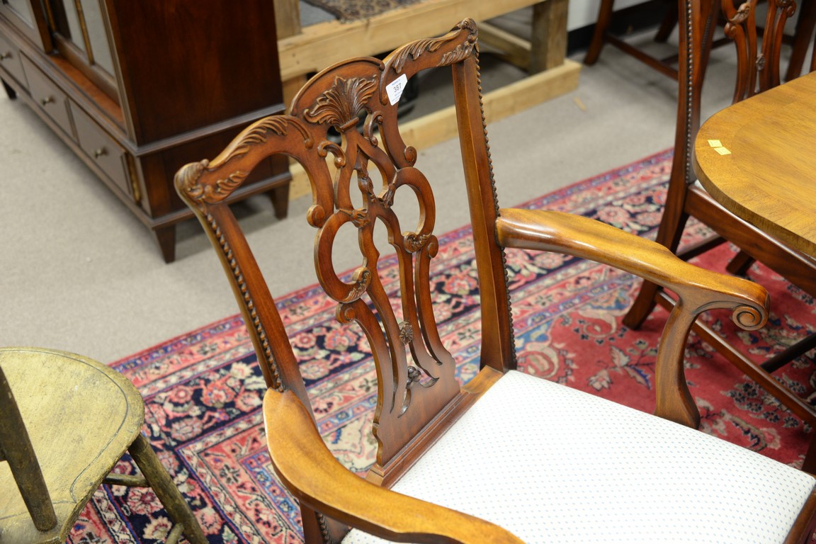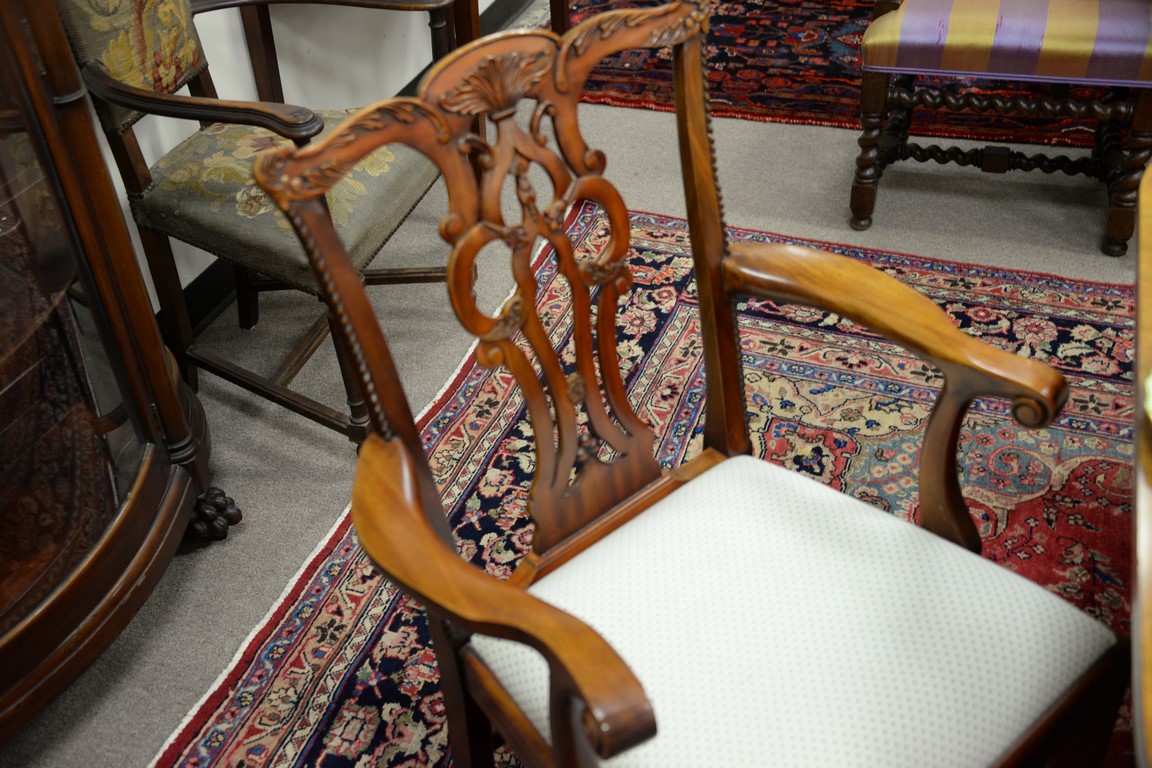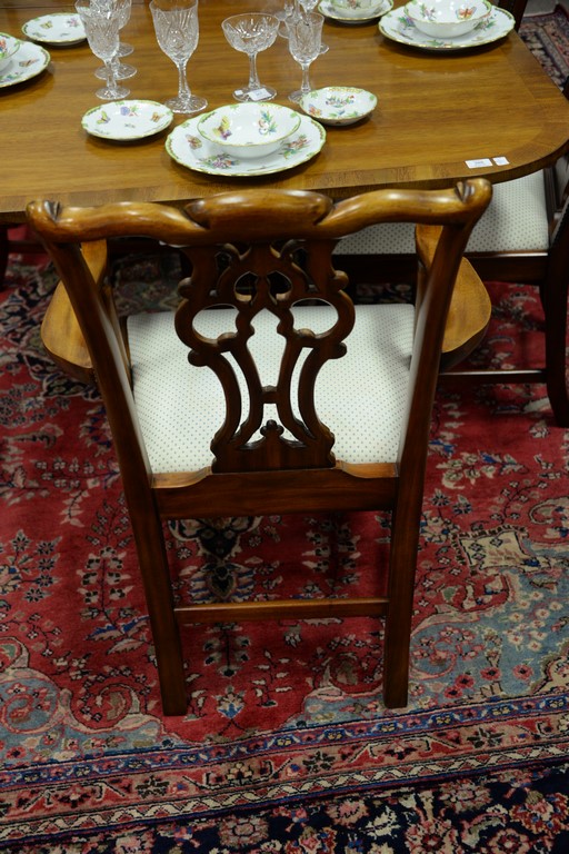 Lot 387: Maitland Smith set of eight Chippendale style dining chairs, two arm and six side with clean upholstered seats.