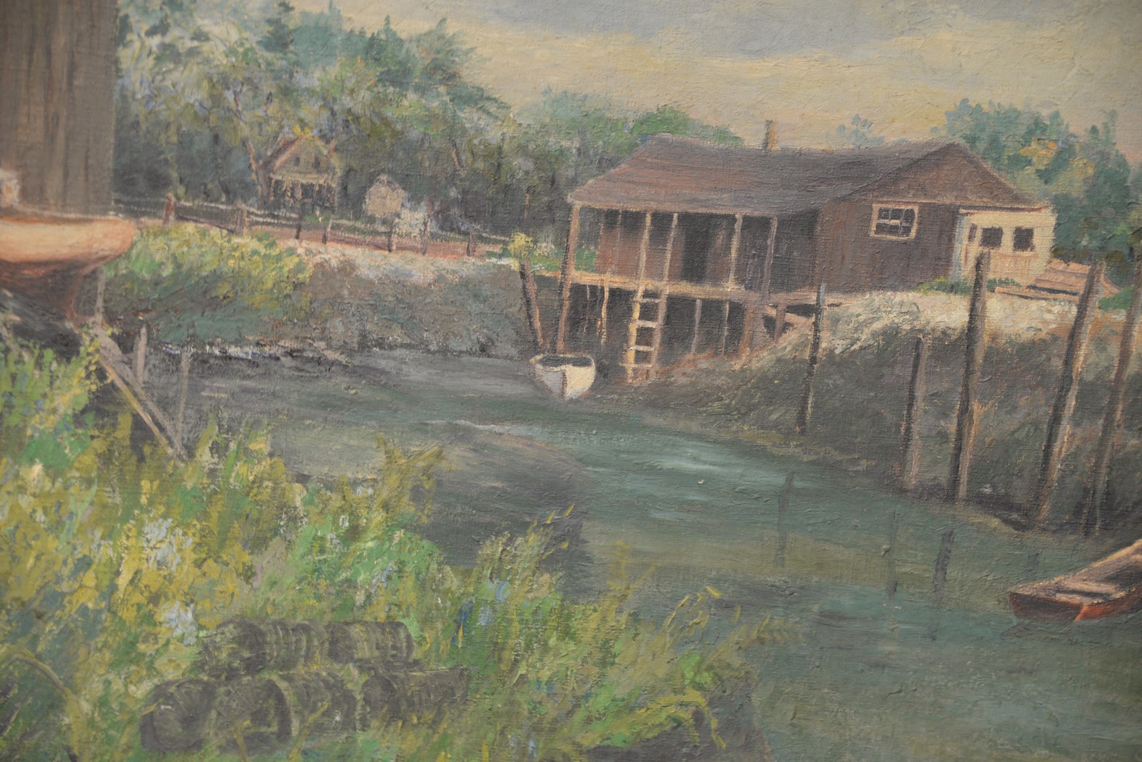 Oil on board southern boatyard in marsh cove, unsigned. 16 x 20