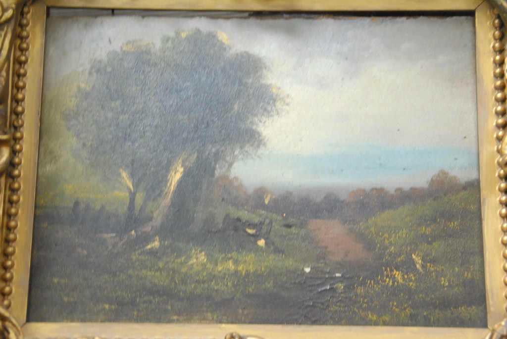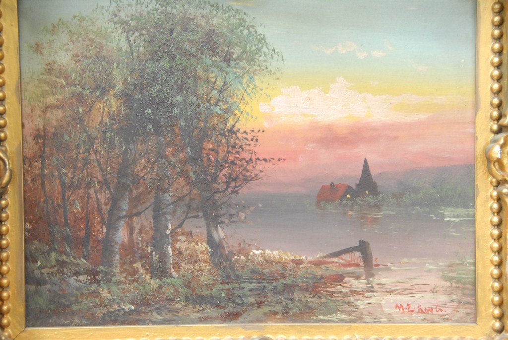 Lot 387: Pair gold framed oil on boards European landscapes one of signset signed M. E. King, 9 x 12.