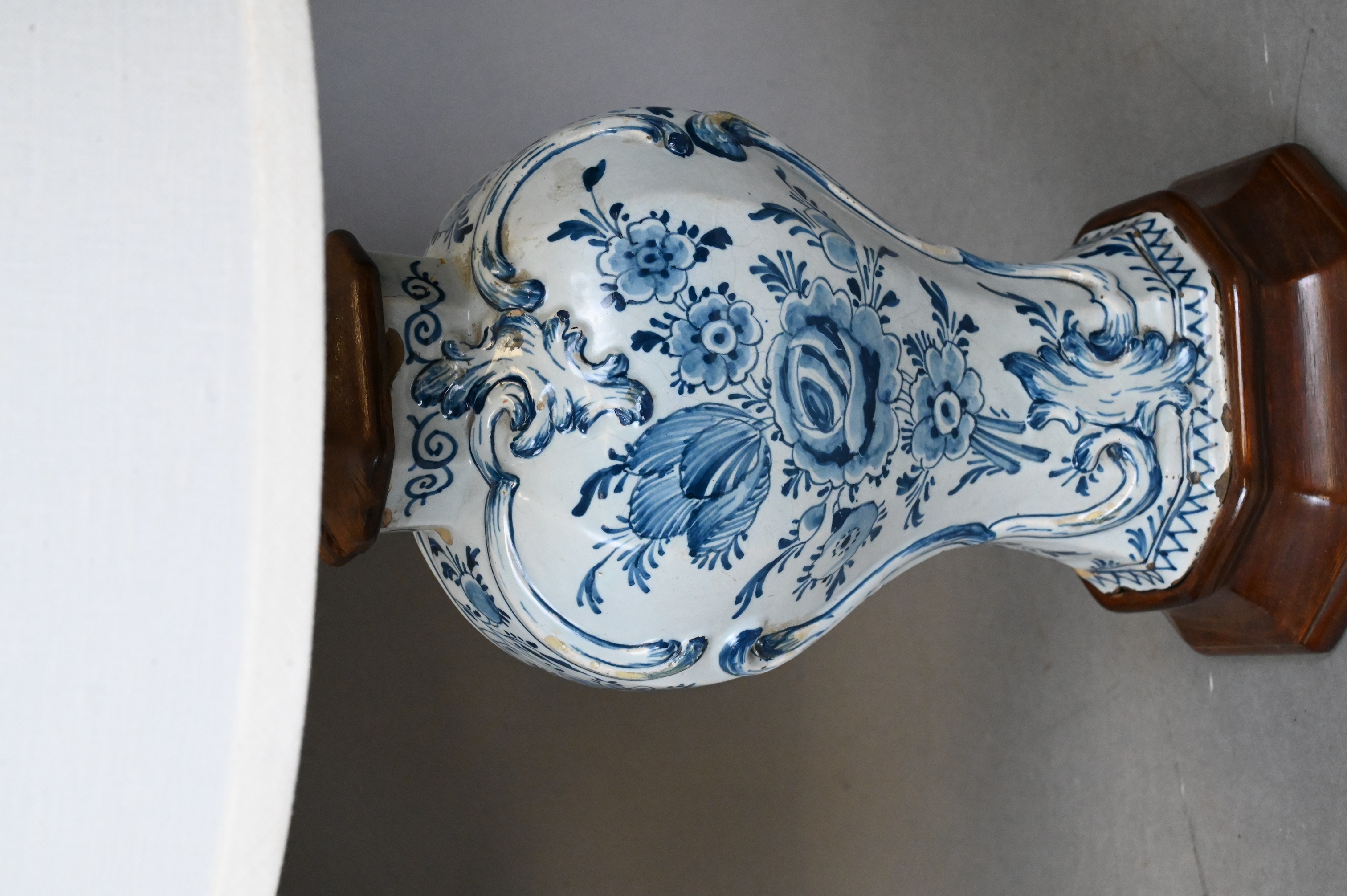 A pair of blue and white Delft pottery vases, each decorated with floral scrolls and reserves, now mounted as table lamps on wooden bases.