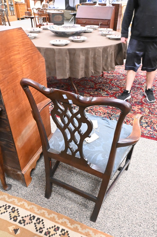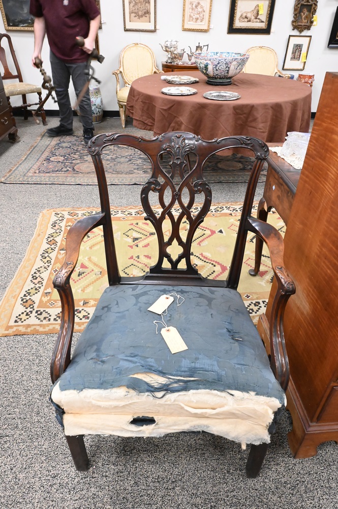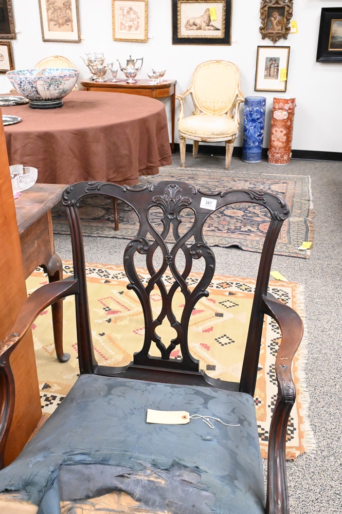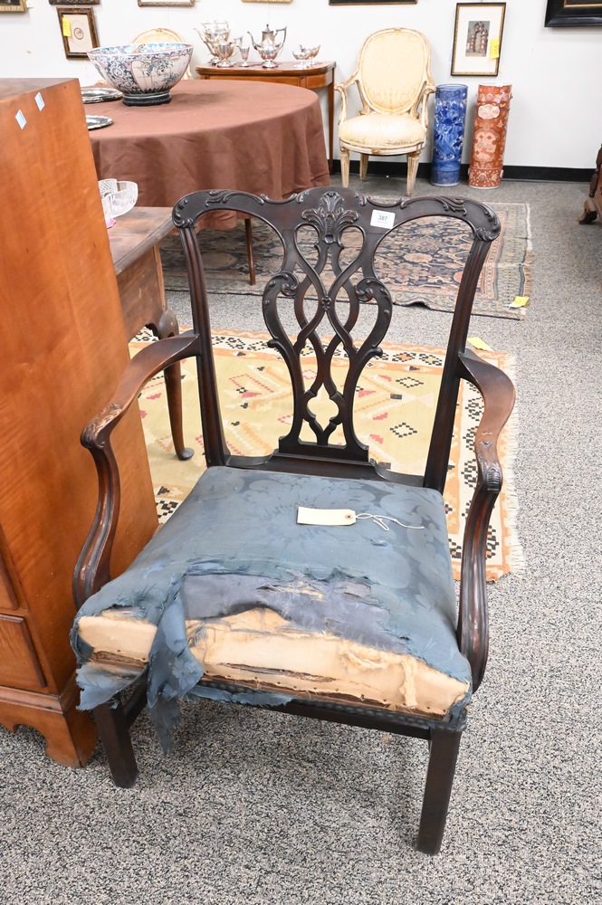 Lot 387: Pair of George III Mahogany Armchairs, each with pierced carved backs, fully upholstered seats, mahogany (primary); beech (seat rails), height 37 1/2″, seat: 18 1/2″, Mabel Brady Garvan Collection. Provenance: Louis Guerineau Myers (1874–1932), New York; consigned to American Art Galleries, New York, February 24–26, 1921, lot 677; by sale to Francis P. Garvan (1875–1937), New York; by gift to Yale University Art Gallery, New Haven, Conn., 1930.