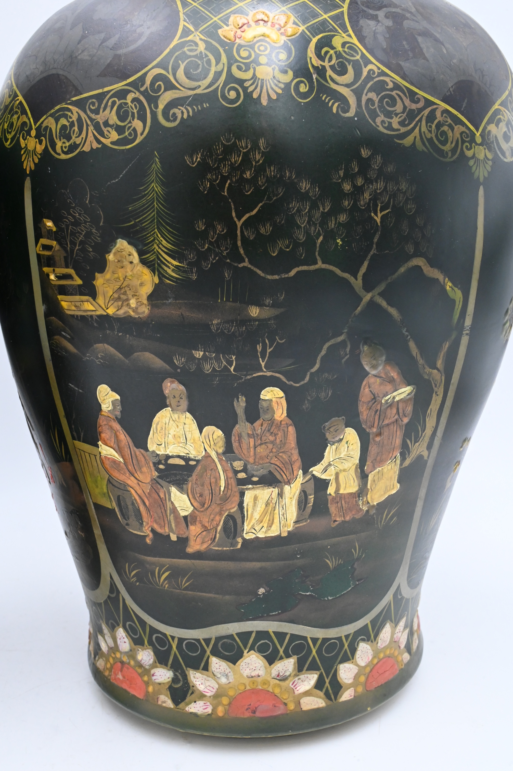 Having chinoiserie floral decor and panels with oriental figures in landscape, cranes and enameled flowers