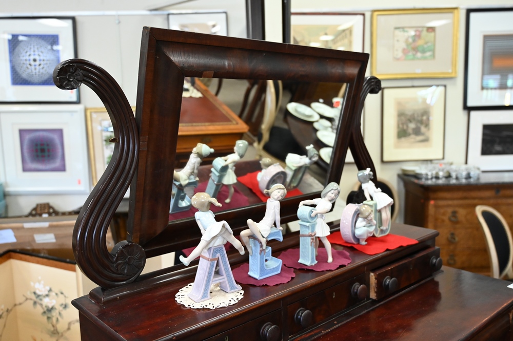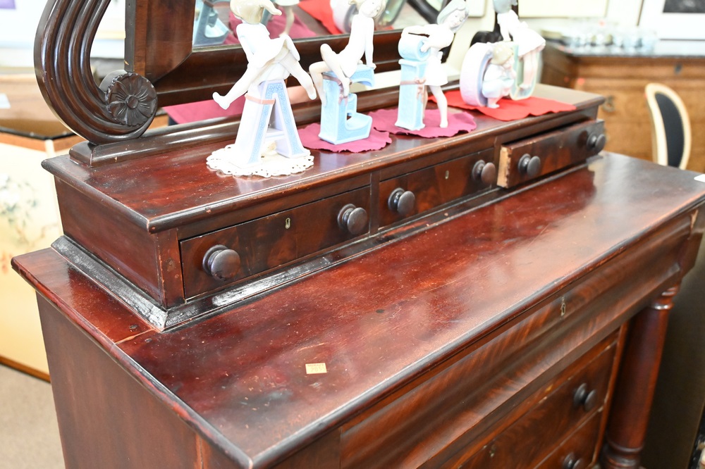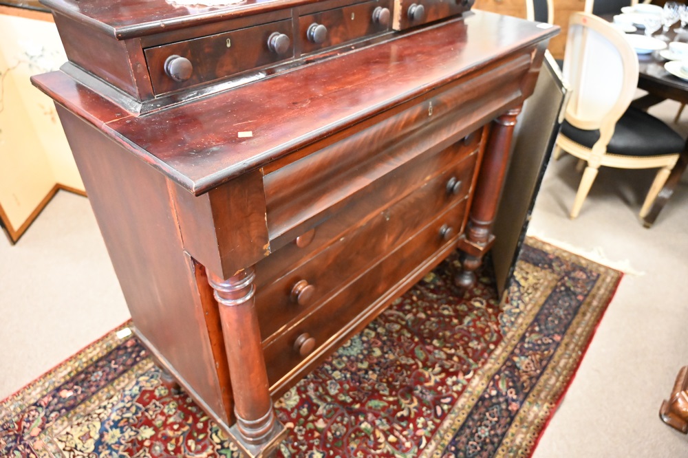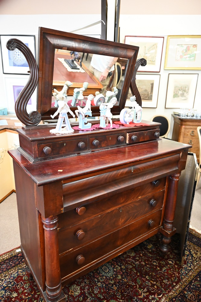 Lot 387: Sheraton Mahogany Chest, having attached mirror, circa 1830, height 68 inches, width 45 inches.