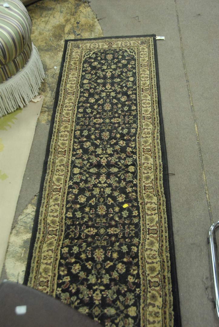 Three black and tan machine made rugs. 2’1 x 7’7, 5’4 x 7’7, and 7’7 x 10’10.