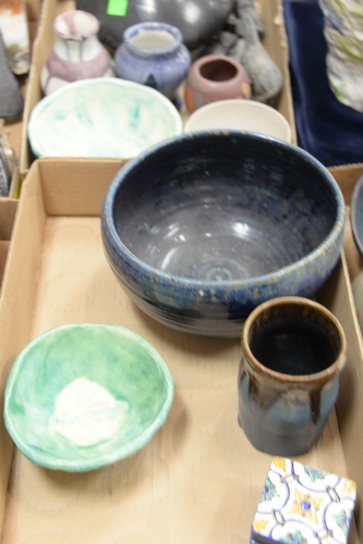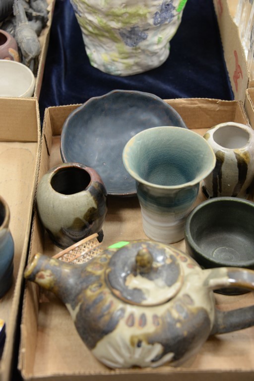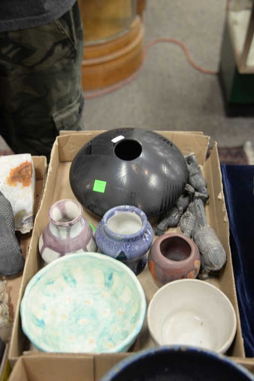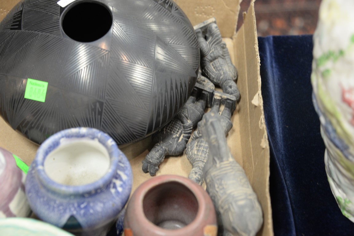 Three box lots with glazed pottery and stoneware including Hilario Quezada pottery black vase, stoneware teapot, vases, and clay figure.