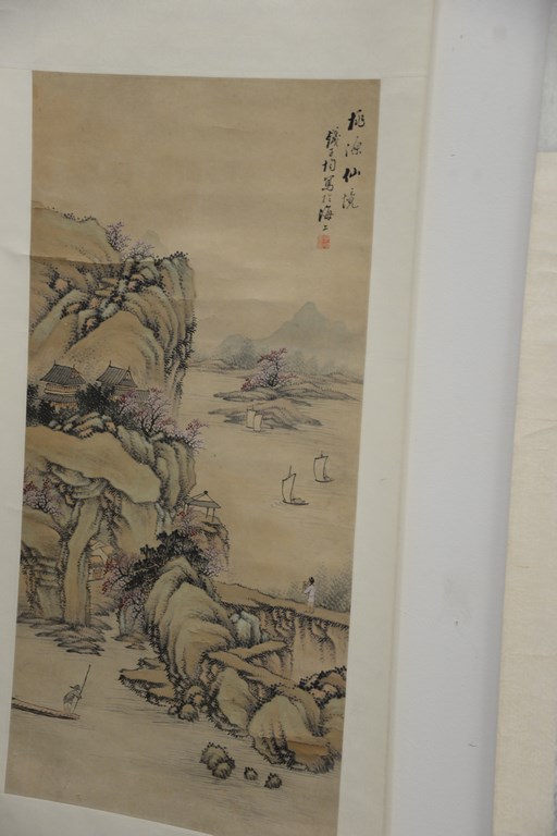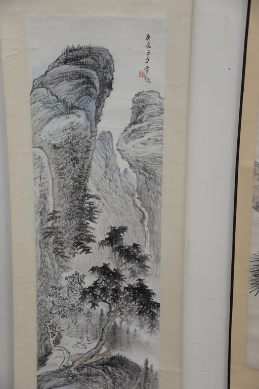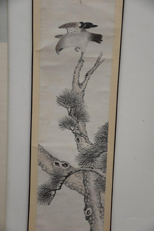 Three Oriental scrolls watercolor on paper, two mountainous scenes and one pine tree branch with hawk.
