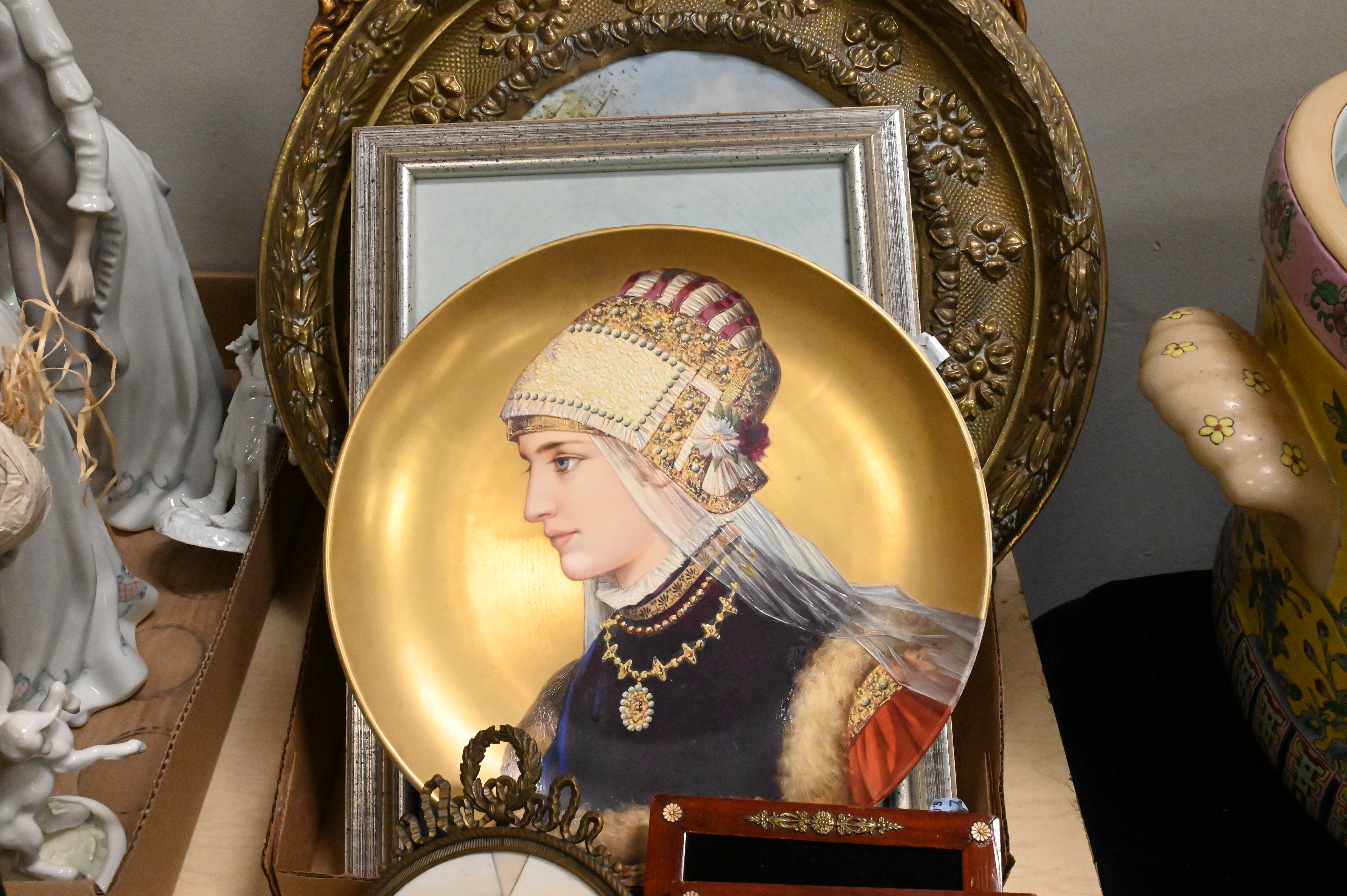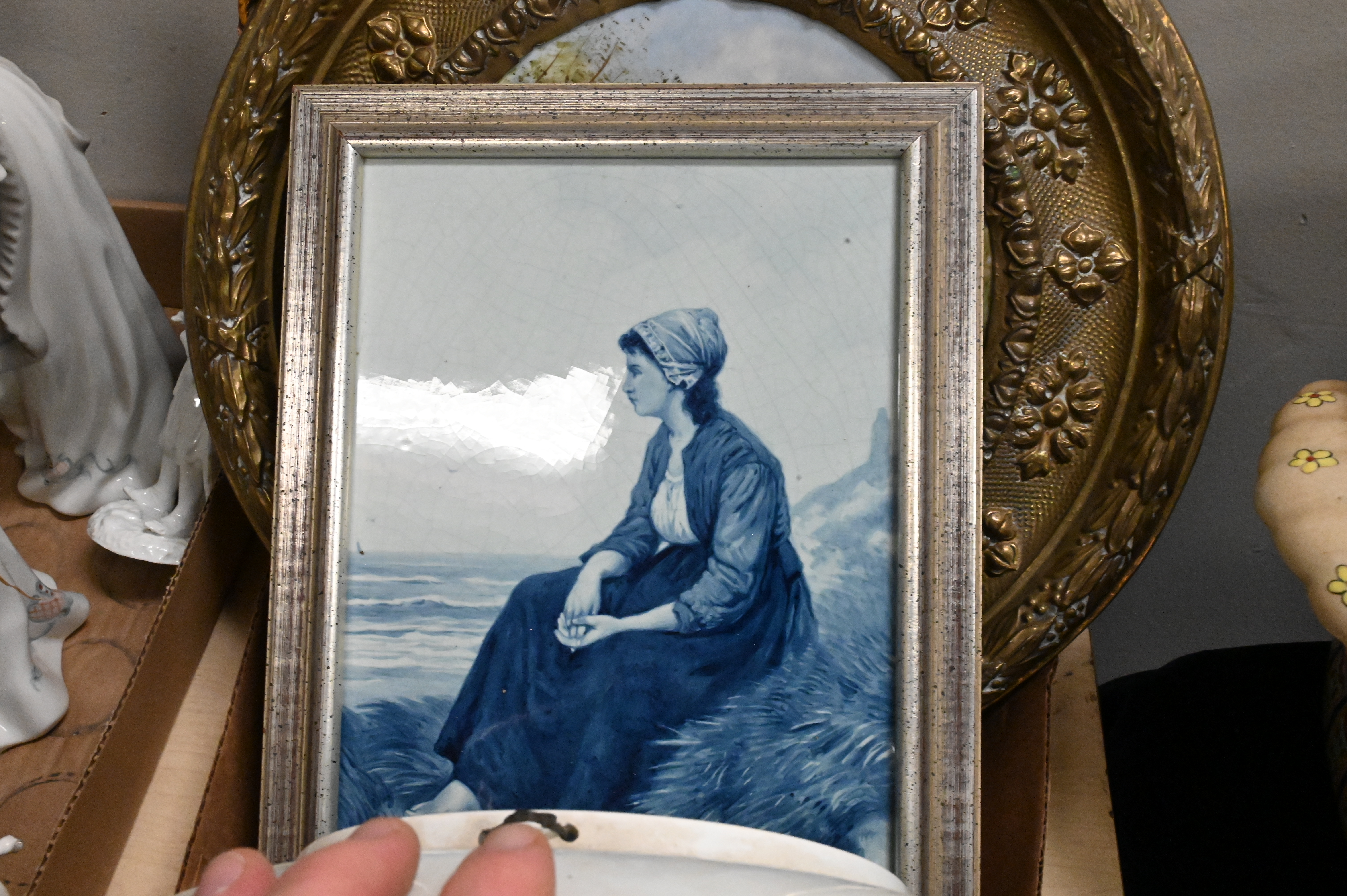 sea captain in French frame, pair of ladies in round frame, along with several portraits of young ladies, two Delft one of a woman walking along a path the other of a woman by the seaside both signed, one plate of a Renaissance dressed woman with gilt background, one woman picking flower in a landscape in tin frame