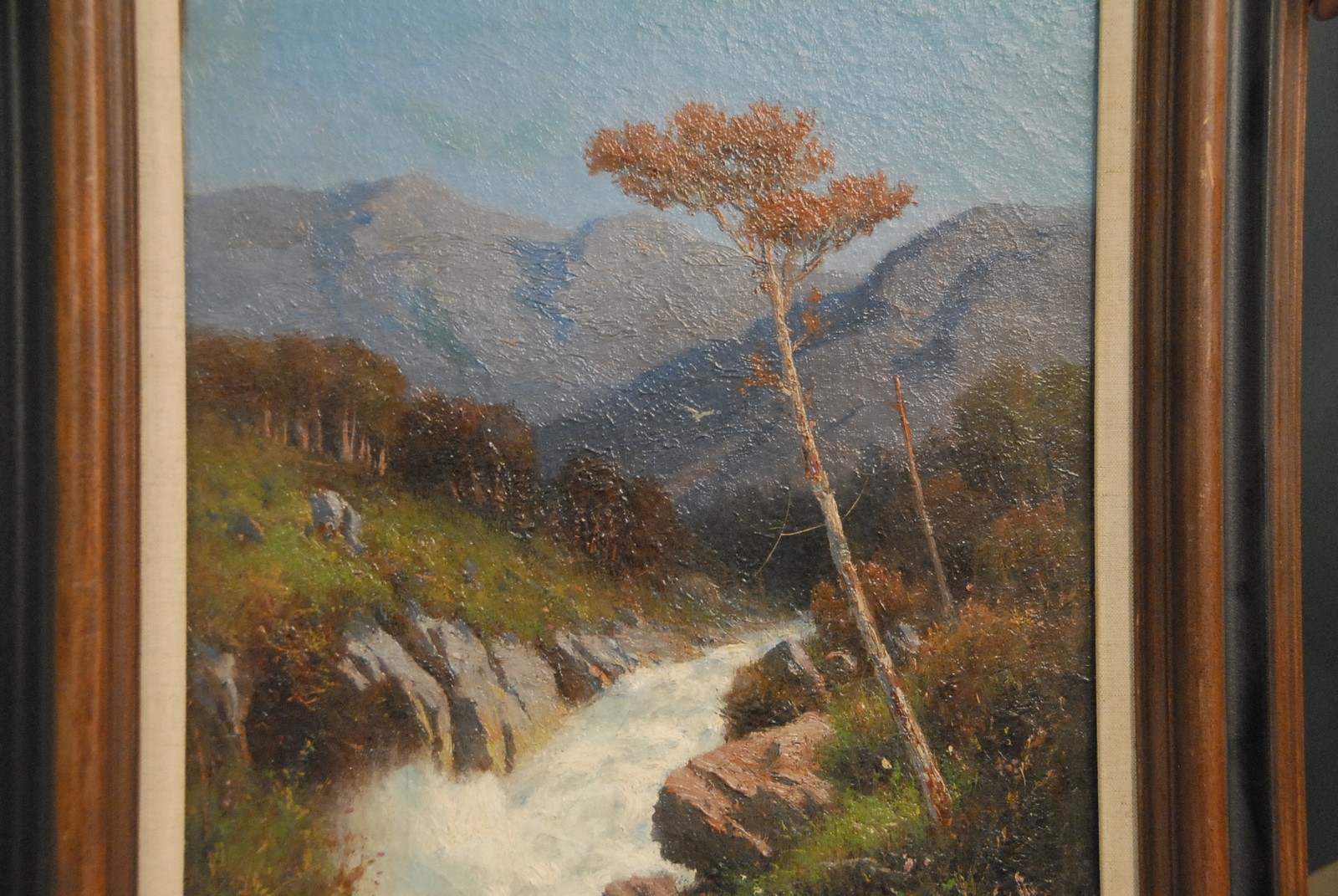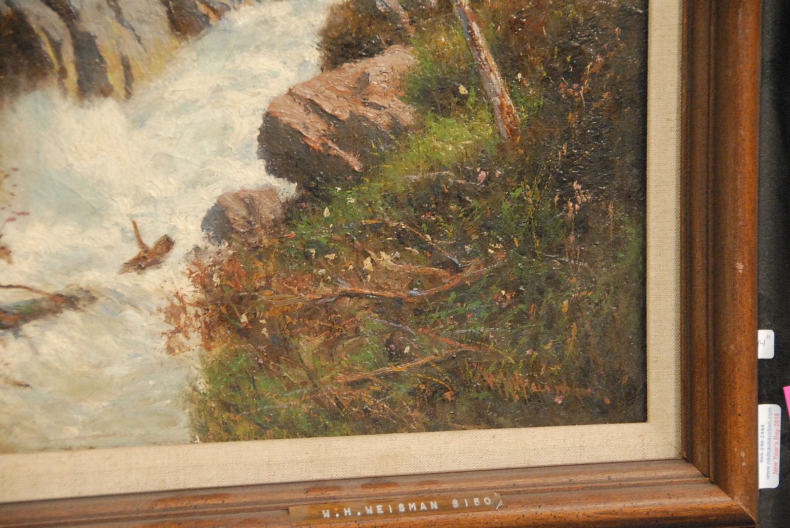 Lot 387: William H. Weisman 1840-1922 MOUNTAINOUS LANDSCAPE WITH RUSHING STREAM oil on canvas signed lower right W. H. Weisman 18 x 14